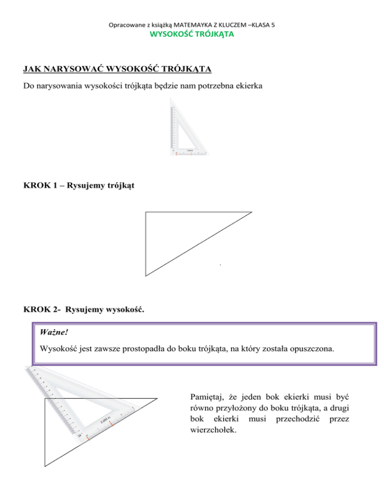 Opracowane z książką MATEMAYKA Z KLUCZEM –KLASA 5 WYSOKOŚĆ TRÓJKĄTA JAK NARYSOWAĆ WYSOKOŚĆ TRÓJKĄTA Do narysowania wysokości trójkąta będzie nam potrzebna ekierka KROK 1 – Rysujemy trójkąt KROK 2- Rysujemy wysokość. Ważne! Wysokość jest zawsze prostopadła do boku trójkąta, na który została opuszczona. Pamiętaj, że jeden bok ekierki musi być równo przyłożony do boku trójkąta, a drugi bok ekierki musi przechodzić przez wierzchołek. Opracowane z książką MATEMAYKA Z KLUCZEM –KLASA 5 Rysujemy linie od wierzchołka do podstawy. Każdy trójkąt ma trzy wierzchołki, dlatego możemy z każdego wierzchołka opuścić jedną wysokość. Zatem jeden trójkąt ma trzy wysokości. W trójkącie ostrokątnym wszystkie wysokości leżą wewnątrz trójkąta. W trójkącie prostokątnym dwie wysokości są równocześnie bokami tego trójkąta, a trzecia leży wewnątrz trójkąta. Opracowane z książką MATEMAYKA Z KLUCZEM –KLASA 5 W trójkącie rozwartokątnym tylko jedną wysokość możemy opuścić na bok trójkąta. Leży ona wewnątrz trójkąta. Pozostałe dwie wysokości opuszcza się na przedłużenia boków- leżą one na zewnątrz trójkąta. Zadania do wykonania na lekcji: 1/110 2/110 3/110 6/110 Zadanie domowe (ćwiczenia): 1/62 2/62 3/62 4/62