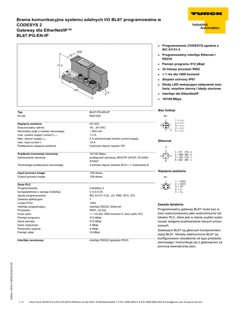 Brama komunikacyjna systemu zdalnych I/O BL67 programowalna w CODESYS 2 Gateway dla EtherNet/IP™ BL67-PG-EN-IP ■ Programowanie CODESYS zgodnie z IEC 61131-3 ■ Programowalny interfejs Ethernet i RS232 ■ Pamięć programu 512 kBajt ■ 32 bitowy procesor RISC ■ < 1 ms dla 1000 komend ■ Stopień ochrony IP67 ■ Diody LED wskazujące załączenie zasilania, wspólne alarmy i błędy sieciowe ■ Interfejs dla EtherNet/IP ■ 10/100 Mbps BL67-PG-EN-IP 6827246 Napięcie zasilania Dopuszczalny zakres Nominalny prąd z modułu sieciowego max. system supply current Imb (5V) Max. sensor supply Isens max. load current Io Podłączenie napięcia zasilania 24 VDC 18…30 VDC ð 600 mA 1.3 A 4 A electronically limited current supply 10 A 5-pinowe złącze męskie 7/8" Prędkość transmisji sieciowej Adresowanie sieciowe Technologia podłączenia sieciowego 10/100 Mbps przełącznik obrotowy, BOOTP, DHCP, IO-ASSISTANT 4-pinowe złącze żeńskie M12 x 1, kodowanie D Input process image Output process image 128 słowa 128 słowa Dane PLC Programowanie kompatybilność z wersją CoDeSys Języki programowania Zadania aplikacyjne Liczba POU Interfejs programujący Processor Czas cyklu Pamięć programu Dane pamięci Dane wejściowe Parametry wyjścia Pamięć stała CoDeSys 2 V 2.3.9.35 IEC 61131-3 (IL, LD, FBD, SFC, ST) 1 1024 interfejs RS232, Ethernet RISC, 32 bity < 1 ms dla 1000 komend IL (bez cyklu I/O) 512 kBajt 512 kBajt 4 kBajt 4 kBajt 16 kBajt Interfejs serwisowy interfejs RS232 (gniazdo PS/2) Bez funkcji Ethernet Napięcie zasilania Zasada działania Programowalny gateway BL67 może być w sieci wykorzystywany jako autonomiczne lub lokalne PLC, które jest w stanie szybko wykonywać wstępne przetwarzanie danych procesowych. Gateway'e BL67 są głównym komponentem stacji BL67. Moduły elektroniczne BL67 są konfigurowane niezależnie od typu protokołu sieciowego i komunikują się z gateway'em za pomocą wewnętrznej sieci. Edition • 2016-11-09T22:25:52+01:00 Typ Nr kat. 1/4 Hans Turck GmbH & Co.KG ñ D-45472 Mülheim an der Ruhr ñ Witzlebenstraße 7 ñ Tel. 0208 4952-0 ñ Fax 0208 4952-264 ñ [email protected] ñ www.turck.com Brama komunikacyjna systemu zdalnych I/O BL67 programowalna w CODESYS 2 Gateway dla EtherNet/IP™ BL67-PG-EN-IP Dimensions (W x L x H) Certyfikaty Temperatura pracy Temperatura obniżająca wartości znamionowe > 55 °C Cyrkulacja powietrza (wentylacja) > 55 °C Stałe powietrze otoczenia Temperatura składowania Wilgotność względna Test wibracyjny Zwiększona odporność na wibracje - do 5 g (przy 10 do 150 Hz) - do 20 g (przy 10 do 150 Hz) Test przeciążeniowy/wstrząsowy Spadek i powrót brak ograniczeń Isens < 3A, Imb < 1A -40…+85 °C 5 do 95 % (wewnętrznie), poziom RH-2, bez kondensacji (składowanie w temp. 45 °C) zgodnie z EN 61131 VN 02-00 i wyżej Montaż na szynie DIN bez konieczności wiercenia zgodnie z EN 60715, uchwyt zakończeniowy Instalacja na płycie bazowej lub w dowolnym miejscu obok maszyny. W takim wypadku każdy kolejny moduł montowany jest za pomocą dwóch śrub. zgodnie z IEC 68-2-27 zgodnie z IEC 68-2-31 oraz częściowo z IEC 68-2-32 zgodnie z EN 61131-2 IP67 yes, Attention: Offset Two mounting holes, 6 mm Ø Edition • 2016-11-09T22:25:52+01:00 Kompatybilność elektromagnetyczna Klasa ochrony DIN rail mounting Direct mounting 74 x 145 x 77.5mm CE, cULus -40…+70 °C 2/4 Hans Turck GmbH & Co.KG ñ D-45472 Mülheim an der Ruhr ñ Witzlebenstraße 7 ñ Tel. 0208 4952-0 ñ Fax 0208 4952-264 ñ [email protected] ñ www.turck.com Brama komunikacyjna systemu zdalnych I/O BL67 programowalna w CODESYS 2 Gateway dla EtherNet/IP™ BL67-PG-EN-IP Pin configuration and supply concept CANopen (Master/Slave) Konfiguracja pinów The CoDeSys programmable gateways can also be operated as CANopen master or as CANopen slave. Both functions are stored in the library and can be loaded to the gateway together with the CoDeSys application. Connected CANopen subscribers are not supplied by the BL67 system. External power supply is required. Urządzenie podrzędne EtherNet/IP™ Konfiguracja pinów The M12-D coded Ethernet port is used as interface for configuration and fieldbus communication. The gateway can be operated as a slave at Plus or PC based systems with EtherNet/IP™ scanner (master). Napięcie zasilania Konfiguracja pinów Double-tuned power supply of the BL67 system. System power supply Vi VI is for the internal system supply at the backplane bus(VMB(5V)) and for the 4A short-circuit limited sensor supply (Vsens). Load voltage Vo Napięcie zasilania Edition • 2016-11-09T22:25:52+01:00 VO for output supply, limited to max.10A. 3/4 Hans Turck GmbH & Co.KG ñ D-45472 Mülheim an der Ruhr ñ Witzlebenstraße 7 ñ Tel. 0208 4952-0 ñ Fax 0208 4952-264 ñ [email protected] ñ www.turck.com Brama komunikacyjna systemu zdalnych I/O BL67 programowalna w CODESYS 2 Gateway dla EtherNet/IP™ BL67-PG-EN-IP LED functions LED Color Status Description OFF No power supply GREEN ON Station OK GREEN FLASHING (1Hz) Station in force mode of the I/O-ASSISTANT GREEN FLASHING (4 Hz) The max. admissible number of modules connected to the gateway RED ON Insufficient power supply RED FLASHING (1Hz) The current station configuration does not comply with the configu- RED FLASHING (4 Hz) No module bus communication. RED/GREEN FLASHING (1Hz) The current and configured module list do not match but the data IO is exceeded. red module list. exchange proceeds as normal. GW OFF No power supply of the CPU. GREEN ON Firmware active, gateway ready GREEN FLASHING (1Hz) Firmware inactive. GREEN FLASHING (4 Hz) Firmware active, gateway hardware error. RED ON CPU not ready, Vcc too low. Causes of failure: - Too many modules at the gateway - Short circuit in one of the modules - Defective gateway RUN/STOP Vcc Vo Vi LNK/ACT MS OFF PG STOP, no application loaded. GREEN FLASHING (1Hz) PG STOP, CoDeSys application loaded. GREEN ON PG in RUN, CoDeSys application in pro