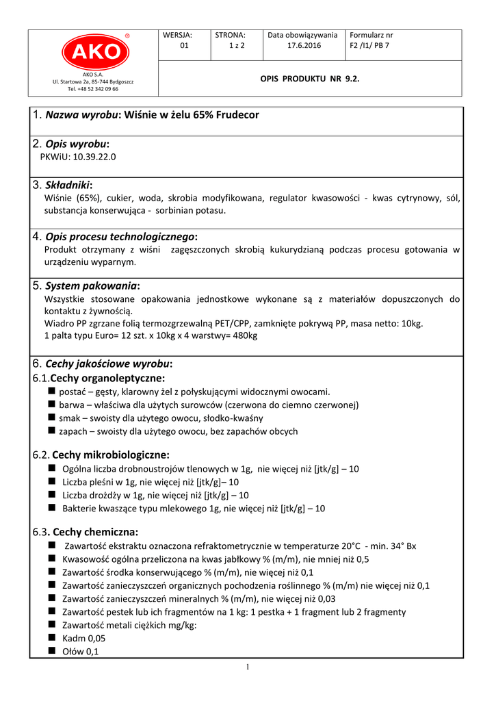 WERSJA: 01 STRONA: 1z2 Data obowiązywania 17.6.2016 AKO S.A. Ul. Startowa 2a, 85-744 Bydgoszcz Tel. +48 52 342 09 66 Formularz nr F2 /I1/ PB 7 OPIS PRODUKTU NR 9.2. 1. Nazwa wyrobu: Wiśnie w żelu 65% Frudecor 2. Opis wyrobu: PKWiU: 10.39.22.0 3. Składniki: Wiśnie (65%), cukier, woda, skrobia modyfikowana, regulator kwasowości - kwas cytrynowy, sól, substancja konserwująca - sorbinian potasu. 4. Opis procesu technologicznego: Produkt otrzymany z wiśni urządzeniu wyparnym. zagęszczonych skrobią kukurydzianą podczas procesu gotowania w 5. System pakowania: Wszystkie stosowane opakowania jednostkowe wykonane są z materiałów dopuszczonych do kontaktu z żywnością. Wiadro PP zgrzane folią termozgrzewalną PET/CPP, zamknięte pokrywą PP, masa netto: 10kg. 1 palta typu Euro= 12 szt. x 10kg x 4 warstwy= 480kg 6. Cechy jakościowe wyrobu: 6.1.Cechy organoleptyczne: postad – gęsty, klarowny żel z połyskującymi widocznymi owocami. barwa – właściwa dla użytych surowców (czerwona do ciemno czerwonej) smak – swoisty dla użytego owocu, słodko-kwaśny zapach – swoisty dla użytego owocu, bez zapachów obcych 6.2. Cechy mikrobiologiczne: Ogólna liczba drobnoustrojów tlenowych w 1g, nie więcej niż *jtk/g+ – 10 Liczba pleśni w 1g, nie więcej niż *jtk/g+– 10 Liczba drożdży w 1g, nie więcej niż *jtk/g+ – 10 Bakterie kwaszące typu mlekowego 1g, nie więcej niż *jtk/g+ – 10 6.3. Cechy chemiczna: Zawartośd ekstraktu oznaczona refraktometrycznie w temperaturze 20°C - min. 34° Bx Kwasowośd ogólna przeliczona na kwas jabłkowy % (m/m), nie mniej niż 0,5 Zawartośd środka konserwującego % (m/m), nie więcej niż 0,1 Zawartośd zanieczyszczeo organicznych pochodzenia roślinnego % (m/m) nie więcej niż 0,1 Zawartośd zanieczyszczeo mineralnych % (m/m), nie więcej niż 0,03 Zawartośd pestek lub ich fragmentów na 1 kg: 1 pestka + 1 fragment lub 2 fragmenty Zawartośd metali ciężkich mg/kg: Kadm 0,05 Ołów 0,1 1 WERSJA: 01 STRONA: 2z2 Data obowiązywania 17.6.2016 AKO S.A. Ul. Startowa 2a, 85-744 Bydgoszcz Tel. +48 52 342 09 66 Formularz nr F2 /I1/ PB 7 OPIS PRODUKTU NR 9.2. 7. Składniki alergenne: Brak 8. Deklaracja GMO: Składniki nie są modyfikowane genetycznie. 9. Trwałośd wyrobu i warunki jego przechowywania: Opakowany produkt przechowywad w suchym, czystym i nienasłonecznionym magazynie, gdzie wilgotnośd względna nie przekracza 75%, w temp. od 0°C do + 20°C na czystych drewnianych paletach w odległości min. 10 cm od ściany. Okres przechowywania do 6 m-cy od daty produkcji. Należy unikad nagłych zmian temperatury. Produkt po otwarciu należy przechowywad w temperaturze od 0 do +10°C, w zamkniętym opakowaniu. Zaleca się wykorzystanie produktu w ciągu 72 godzin od otwarcia opakowania. 10. Dystrybucja wyrobu: Produkt jest dostarczany do odbiorcy w opakowaniu jednostkowym lub zbiorczym na foliowanych lub niefoliowanych paletach transportem kołowym firmy zewnętrznej przeznaczonym do przewozu środków spożywczych. 11. Przeznaczenie wyrobu: Wiśnie w żelu 65% Frudecor są przeznaczone do stosowania jako dodatek do dekoracji tortów, ciast, deserów i gofrów w formie bezpośredniej. Można je również zapiekad na drożdżówkach. Opracował Imię i nazwisko Beata Romel Stanowisko Laborant Data 28.6.2016 Sprawdził Dorota Palpuchowska Technolog 28.6.2016 Zatwierdził K. Laure-Lewnadowska Gł. Technolog 28.6.2016 2 Podpis