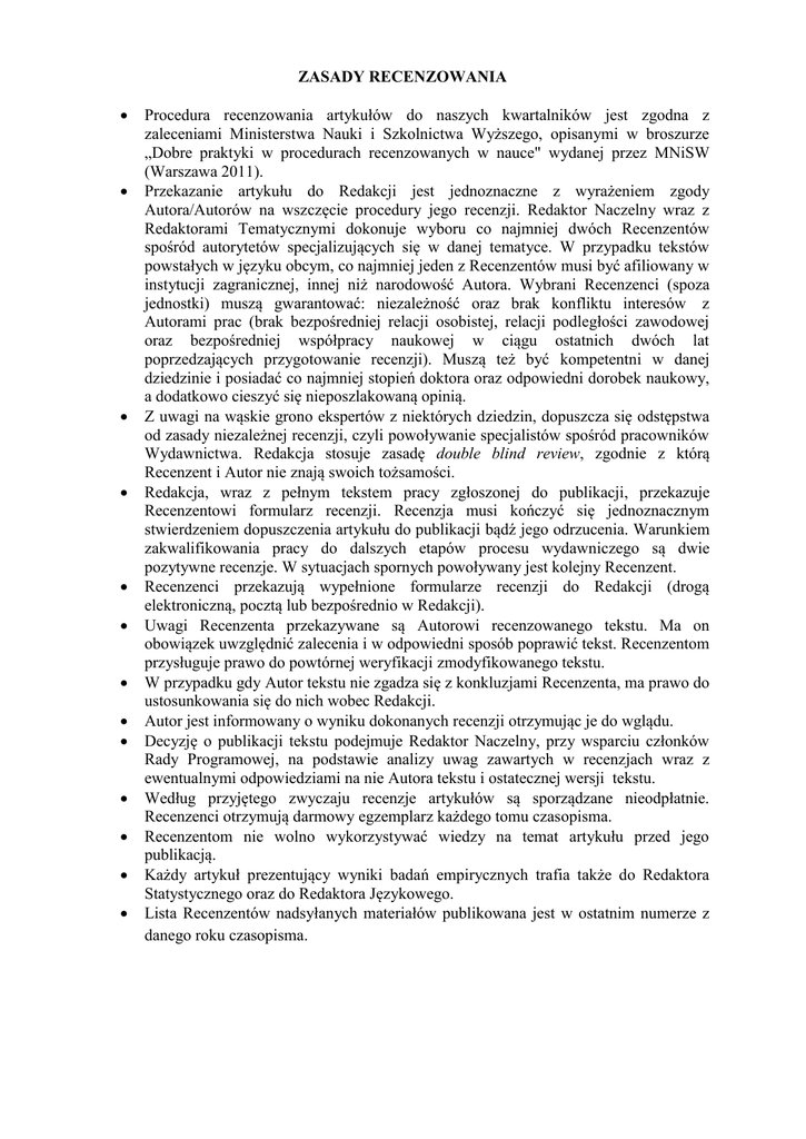 ZASADY RECENZOWANIA Procedura recenzowania artykułów do naszych kwartalników jest zgodna z zaleceniami Ministerstwa Nauki i Szkolnictwa Wyższego, opisanymi w broszurze „Dobre praktyki w procedurach recenzowanych w nauce" wydanej przez MNiSW (Warszawa 2011). Przekazanie artykułu do Redakcji jest jednoznaczne z wyrażeniem zgody Autora/Autorów na wszczęcie procedury jego recenzji. Redaktor Naczelny wraz z Redaktorami Tematycznymi dokonuje wyboru co najmniej dwóch Recenzentów spośród autorytetów specjalizujących się w danej tematyce. W przypadku tekstów powstałych w języku obcym, co najmniej jeden z Recenzentów musi być afiliowany w instytucji zagranicznej, innej niż narodowość Autora. Wybrani Recenzenci (spoza jednostki) muszą gwarantować: niezależność oraz brak konfliktu interesów z Autorami prac (brak bezpośredniej relacji osobistej, relacji podległości zawodowej oraz bezpośredniej współpracy naukowej w ciągu ostatnich dwóch lat poprzedzających przygotowanie recenzji). Muszą też być kompetentni w danej dziedzinie i posiadać co najmniej stopień doktora oraz odpowiedni dorobek naukowy, a dodatkowo cieszyć się nieposzlakowaną opinią. Z uwagi na wąskie grono ekspertów z niektórych dziedzin, dopuszcza się odstępstwa od zasady niezależnej recenzji, czyli powoływanie specjalistów spośród pracowników Wydawnictwa. Redakcja stosuje zasadę double blind review, zgodnie z którą Recenzent i Autor nie znają swoich tożsamości. Redakcja, wraz z pełnym tekstem pracy zgłoszonej do publikacji, przekazuje Recenzentowi formularz recenzji. Recenzja musi kończyć się jednoznacznym stwierdzeniem dopuszczenia artykułu do publikacji bądź jego odrzucenia. Warunkiem zakwalifikowania pracy do dalszych etapów procesu wydawniczego są dwie pozytywne recenzje. W sytuacjach spornych powoływany jest kolejny Recenzent. Recenzenci przekazują wypełnione formularze recenzji do Redakcji (drogą elektroniczną, pocztą lub bezpośrednio w Redakcji). Uwagi Recenzenta przekazywane są Autorowi recenzowanego tekstu. Ma on obowiązek uwzględnić zalecenia i w odpowiedni sposób poprawić tekst. Recenzentom przysługuje prawo do powtórnej weryfikacji zmodyfikowanego tekstu. W przypadku gdy Autor tekstu nie zgadza się z konkluzjami Recenzenta, ma prawo do ustosunkowania się do nich wobec Redakcji. Autor jest informowany o wyniku dokonanych recenzji otrzymując je do wglądu. Decyzję o publikacji tekstu podejmuje Redaktor Naczelny, przy wsparciu członków Rady Programowej, na podstawie analizy uwag zawartych w recenzjach wraz z ewentualnymi odpowiedziami na nie Autora tekstu i ostatecznej wersji tekstu. Według przyjętego zwyczaju recenzje artykułów są sporządzane nieodpłatnie. Recenzenci otrzymują darmowy egzemplarz każdego tomu czasopisma. Recenzentom nie wolno wykorzystywać wiedzy na temat artykułu przed jego publikacją. Każdy artykuł prezentujący wyniki badań empirycznych trafia także do Redaktora Statystycznego oraz do Redaktora Językowego. Lista Recenzentów nadsyłanych materiałów publikowana jest w ostatnim numerze z danego roku czasopisma.