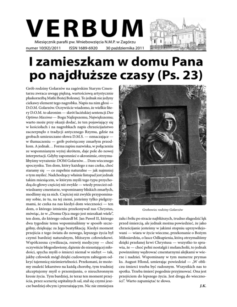 VERBUM Miesięcznik parafii pw. Wniebowzięcia N.M.P. w Zagórzu numer 10(92)/2011 ISSN 1689-6920 30 października 2011 I zamieszkam w domu Pana po najdłuższe czasy (Ps. 23) Grób rodziny Golarzów na zagórskim Starym Cmen tarzu zwraca uwagę piękną, wartościową artystycznie płaskorzeźbą Matki Bożej Bolesnej. To jednak nie jedyny ciekawy element tego nagrobka. Napis na nim głosi — D.O.M. Golarzów. Oczywiście wiadomo, że wielkie lite ry D.O.M. to akronim — skrót łacińskiej sentencji Deo Optimo Maximo — Bogu Najlepszemu, Największemu; warto może przy okazji dodać, że ten pojawiający się w kościołach i na nagrobkach napis chrześcijaństwo zaczerpnęło z tradycji antycznego Rzymu, gdzie na grobach umieszczano słowa D.M.S. — oznaczające — w tłumaczeniu — grób poświęcony zmarłym przod kom. A jednak… Forma zapisu nazwiska, w połączeniu ze wspomnianym wyżej skrótem, daje pole do nowej interpretacji. Gdyby zapomnieć o akronimie, otrzyma libyśmy wyrażenie: DOM Golarzów… Dom wiecznego spoczynku. Ten dom, który każdego z nas czeka, choć staramy się — co zupełnie naturalne — jak najmniej o tym myśleć. Nadchodzący właśnie listopad jest jednak takim miesiącem, w którym myśli tego typu przycho dzą do głowy częściej niż zwykle — wtedy przecież od wiedzamy cmentarze, wspominamy bliskich zmarłych, modlimy się za nich. Częściej niż zwykle przypomina my sobie, że tu, na tej ziemi, jesteśmy tylko pielgrzy mami, że czeka na nas kiedyś dom wieczności — ten dom, o którego istnieniu przekonywał nas Chrystus, mówiąc, że w „Domu Ojca mego jest mieszkań wiele”, ten dom, do którego odszedł bł. Jan Paweł II, którego dwa tygodnie temu wspominaliśmy w sposób szcze gólny, dziękując za Jego beatyfikację. Kiedyś moment przejścia z tego świata do nowego, lepszego życia był czymś bardziej naturalnym, bliższym człowiekowi. Współczesna cywilizacja, rozwój medycyny — choć oczywiście błogosławiony, dążenie do nieustającej mło dości, spycha myśli o śmierci niemal w niebyt — tak, jakby człowiek mógł dzięki cudownym zabiegom od kryć tajemnicę nieśmiertelności. Przekonani, że może my znaleźć lekarstwo na każdą chorobę, tym trudniej akceptujemy myśl o przemijaniu, o nieuchronnym kresie życia. Tym bardziej, że teraz ten moment przej ścia, przez scenerię szpitalnych sal, stał się czymś jesz cze bardziej obcym i przerażającym. Nic nie zmniejsza Grobowiec rodziny Golarzów żalu i bólu po stracie najbliższych, trudno złagodzić lęk przed śmiercią, ale jednak można powiedzieć, że jako chrześcijanie jesteśmy w jakimś stopniu uprzywilejo wani — wiara w życie wieczne, przekonanie o Bożym Miłosierdziu, o łasce Odkupienia, którą otrzymaliśmy dzięki przelanej krwi Chrystusa — wszystko to spra wia, że — choć pełni nostalgii i melancholii, to jednak powinniśmy wędrować cmentarnymi alejkami w wie rze i nadziei. Wspominany w tym numerze prymas ks. August Hlond, umierając powiedział — „W obli czu śmierci trzeba być radosnym. Wszystkich nas to spotka. Trzeba śmierć pogodnie przyjmować. Ona jest przejściem do lepszego życia. Jest drogą do wieczno ści”. Warto zapamiętać te słowa. J.K. Niezwykłe odwiedziny fot. Z. Wrona Księża Biskupi nie tylko odwiedzili pachnący pol skością Lwów, lecz również w sobotnie popołudnie rozjechali się po parafiach naszej archidiecezji, aby zobaczyć, jak żyją przemyscy diecezjanie. Chcieli po znać specyfikę i pobożność Podkarpacia. Również nasza parafia miała zaszczyt gościć jed nego z Księży Biskupów zebranych na Konferencji — Jego Ekselencję ks. bpa Wacława Depo — ordynariusza zamojsko-lubaczowskiego. 2 Widać było, że nasz zagórski wieczernik zachwy cił Jego Ekscelencję, zwłaszcza cudowny obraz Matki Nowego Życia ukazujący scenę Zwiastowania. Ksiądz Biskup razem z dziećmi i tymi, którzy przy byli w tym dniu na nabożeństwo, odmawiał różaniec, który przygotowały wspólnoty działające przy naszej parafii: Akcja Katolicka, dzieci, młodzież z Effathy, Rycerstwo Niepokalanej, a ostatni dziesiątek popro wadziła s. Dorota. Po nabożeństwie nastąpił moment długo oczekiwa ny przez wszystkie dzieci — Ksiądz Biskup wylosował upominki. I choć radość na twarzyczkach trójki szczę śliwców była wielka, to nie każde dziecko dostało plu szowego misia, pocieszałem jednak, że to jeszcze nie koniec nagród za październikowe nabożeństwa. fot. Z. Wrona fot. Z. Wrona Dla całej naszej archidiecezji miesiąc październik stał się okazją do wielkiego dziękczynienia Panu Bogu za dar 25 lat biskupiej posługi naszego Arcypasterza Józefa Michalika. Z tej też okazji właśnie w Przemyślu w dniach 14–16 października miały miejsce obrady Konferencji Episkopatu Polski. Następnym i najważniejszym punktem naszego wspólnego spotkania była uczta Eucharystyczna, w cza sie której ksiądz Biskup wygłosił homilię nawiązującą szczególnie do wydarzeń z ostatniego czasu. Następnie, już po zakończonej Mszy Świętej, spotkał się z grupa mi parafialnymi i tymi, którzy chcieli coś więcej do wiedzieć się o posłudze Jego Ekscelencji. Wzruszającym był zwłaszcza moment, kiedy dzielił się swoimi przeżyciami związanymi z rodzinnym do mem, a zwłaszcza z mamą, którą tak niedawno poże gnał, odprowadzając na wieczny spoczynek. ▶▶▶ 3 2 ▶▶▶ oraz Jego współpracowników. Niech wspólnota para fialna wzrasta poprzez prawdę i miłość ku Chrystusowi i Jego Matce. Z serca błogosławię + Wacław Depo, Bp Zamojsko-Lubaczowski” ks. Przemysław Macnar fot. Z. Wrona fot. Z. Wrona To spotkanie dla wielu mogło stać się okazją, by zo baczyć może trochę w innym świetle Księcia Kościoła, jak kiedyś nazywano biskupów, który zajmuje ważne miejsce w hierarchii, a tak naprawdę jest takim samym człowiekiem jak każdy z n