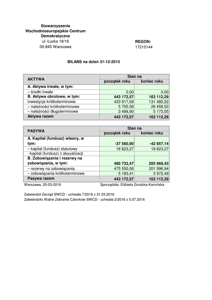 Stowarzyszenie Wschodnioeuropejskie Centrum Demokratyczne ul. Łucka 18/16 00-845 Warszawa REGON: 17215144 BILANS na dzień 31-12-2015 AKTYWA A. Aktywa trwałe, w tym: – środki trwałe B. Aktywa obrotowe, w tym: inwestycje krótkoterminowe – należności krótkoterminowe – należności długoterminowe Aktywa razem PASYWA A. Kapitał (fundusz) własny, w tym: – kapitał (fundusz) statutowy -kapitał (fundusz) z akyualizacji B. Zobowiązania i rezerwy na zobowiązania, w tym: – rezerwy na zobowiązania – zobowiązania krótkoterminowe Pasywa razem Warszawa, 20-03-2016 Stan na początek roku koniec roku 0,00 443 172,57 433 917,09 5 755,58 3 499,90 443 172,57 0,00 163 112,29 131 480,22 26 458,52 5 173,55 163 112,29 Stan na początek roku koniec roku -37 560,90 18 823,27 -42 857,14 18 823,27 480 733,47 475 550,06 5 183,41 443 172,57 205 969,43 201 996,94 3 972,49 163 112,29 Sporządziła: Elżbieta Grodzka-Kamińska Zatwierdził Zarząd SWCD - uchwała 7/2016 z 31.03.2016 Zatwierdziło Walne Zebranie Członków SWCD - uchwała 2/2016 z 5.07.2016 Stowarzyszenie Wschodnioeuropejskie Centrum Demokratyczne ul. Łucka 18/16 00-845 Warszawa REGON: 17215144 RACHUNEK ZYSKÓW I STRAT za rok 2015 Rok poprzedni A. Przychody podstawowej działalności operacyjnej i zrównane z nimi, w tym zmiana stanu produktów (zwiększenie – wartość dodatnia, zmniejszenie – wartość ujemna) B. Koszty podstawowej działalności operacyjnej: I. Amortyzacja II. Zużycie materiałów i energii III. Wynagrodzenia, ubezpieczenia społeczne i inne świadczenia IV. Pozostałe koszty C. Pozostałe przychody i zyski, w tym aktualizacja wartości aktywów D. Pozostałe koszty i straty, w tym aktualizacja wartości aktywów E. Podatek dochodowy G. Wynik finansowy netto ogółem (A−B+C−D−E), w tym: I. Nadwyżka przychodów nad kosztami (wartość dodatnia) II. Nadwyżka kosztów nad przychodami (wartość ujemna) Warszawa, 20-03-2016 Rok bieżący 2 164 854,50 3 986 803,56 2 162 886,60 3 975 866,96 68 102,39 550 920,13 484 024,69 1 610 759,52 478 991,97 2 945 954,86 7 311,17 5 240,44 8 812,18 21 473,28 466,89 -5 296,24 Sporządziła: Elżbieta Grodzka-Kamińska Zatwierdził Zarząd SWCD - uchwała 7/2016 z 31.03.2016 Zatwierdziło Walne Zebranie Członków SWCD - uchwała 2/2016 z 5.07.2016 Okres objęty sprawozdaniem fiansowym od 01-01-2015 do 31-12-2015 Stowarzyszenia WSCHODNIOEUROPEJSKIE CENTRUM DEMOKRATYCZNE z siedzibą w Warszawie przy ul. Łucka 18 m 16 Regon 017215144 INFORMACJA DODATKOWA SPRAWOZDANIA FINANSOWEGO Przedmiotowe sprawozdanie finansowe obejmuje rok obrotowy od 01 stycznia 2015 do 31 grudnia 2015 i zostało sporządzone przy założeniu dalszej kontynuacji działalności. Sporządzenie sprawozdania fiansowego z zastosowaniem uproszczeń przewidzianych w ustawie o rachunkowości dla jednostek mikro. Sprawozdanie finansowe sporządzone zostało na podstawie księg rachunkowych prowadzonych w roku obrotowym zgodnie z zasadami dokumentacji oraz polityką rachunkowości ustaloną i wprowadzoną do stosowania postanowieniami Zarządu: a) zasady ustalenia roku obrotowego i okresów sprawozdawczych b) zasady wyceny aktywów i pasywów oraz ustalenia wyniku finansowgo c) zasady prowadzenia ksiąg rachunkowych, w tym zakładowy plan kont Operacje gospodarcze wyrażone w walutach obcych ujmuje się w księgach na dzień przeprowadzenia operacji według kursu średniego NBP z dnia poprzedzającego dzień powstania zobowiązań lub należności. Kapitały własne ujmuje się w księgach rachunkowych w wartości nominalnej według rodzajów i zasad określonych przepisami prawa i statutu Zobowiązania wycenia się na dzień bilansowy w kwocie wymagającej zapłaty Zobowiązania wyrażone w walutach obcych wycenia się na dzień bilansowy po kursie ustalonym dla danej waluty przez Narodowy Bank Polski na ten dzień Przyjęte zasady rachunkowości , w tym metody wyceny aktywów i pasywów. Rachunkowośc Stowarzyszenia prowadzona jest zgodnie z ustawą o rachunkowości. Organizacja nie posiada udziałów i akcji . Przyjete zasady rachunkowości stosuje się w sposób ciągły,dokonując w kolejnych latach obrotowych jednakowego grupowania operacji gospodarczych i jednakową wycenę aktywów i pasywów (według cen zakupu) Sprawozdanie fiansowe sporządza się tak , aby za kolejne lata informacje w nich zawarte były porównywalne. 1 h. Podział należności według pozycji bilansu o pozostałym na dzień bilansowy, przewidywanym umową okresie spłaty okres wymagalności do 1 roku powyżej 1 roku Razem stan na początek roku koniec roku początek roku koniec roku początek roku koniec roku obrotowego obrotowego obrotowego obrotowego obrotowego obrotowego Należności z tytułu 1. dostaw i usług 1 250,29 37,62 1 673,65 1 673,65 2 923,94 1 711,27 2. podatków 39,00 237,00 39,00 237,00 3. środków od ZUS 10,09 10,09 0,00 4. wynagrodzeń 0,00 0,00 0,00 5.z pracownikami i współpracownikami 343,84 52,89 343,84 52,89 6.wobec grantobiorców 2 617,56 26 131,01 30,20 2 647,76 26 131,01 7. dochodzone na drodze sądowej 0,00 0,00 0,00 8. innych należności 3 499,90 3 499,90 3 499,90 3 499,90 Razem 7 760,68 29 958,42 1 703,85 1 673,65 9 464,53 31 632,07 1 i. Podział zobowiązań według pozycji bilansu o pozostałym na dzień bilansowy, przewidywanym umową okresie spłaty okres wymagalności do 1 roku powyżej 1 roku Razem stan na początek roku koniec roku początek roku koniec roku początek roku koniec roku obrotowego obrotowego obrotowego obrotowego obrotowego obrotowego Zobowiązania z tytułu 0,00 0,00 1. kredytów i pożyczek 1 036,72 3 472,18 2. dostaw i usług 1 036,72 3 472,18 0,00 0,00 3. podatków 0,00 291,24 4. ubezpieczeń społecznych 291,24 0,00 0,01 5. wynagrodzeń 0,01 401,02 0,01 6.z pracownikami i współpracownikami 401,02 0,01 3 745,67 0,00 7.wobec grantobiorców 3 745,67 0,00 0,00 8. zobowiązań wekslowych 0,00 0,00 9. innych zobowiązań 0,00 0,00 209,05 10.aktualizacja(odsetki od Mon