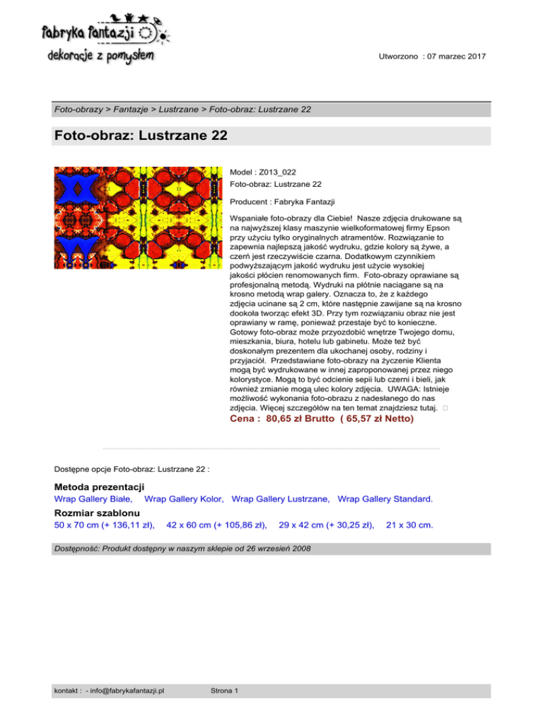 Utworzono : 07 marzec 2017 Foto-obrazy > Fantazje > Lustrzane > Foto-obraz: Lustrzane 22 Foto-obraz: Lustrzane 22 Model : Z013_022 Foto-obraz: Lustrzane 22 Producent : Fabryka Fantazji Wspaniałe foto-obrazy dla Ciebie! Nasze zdjęcia drukowane są na najwyższej klasy maszynie wielkoformatowej firmy Epson przy użyciu tylko oryginalnych atramentów. Rozwiązanie to zapewnia najlepszą jakość wydruku, gdzie kolory są żywe, a czerń jest rzeczywiście czarna. Dodatkowym czynnikiem podwyższającym jakość wydruku jest użycie wysokiej jakości płócien renomowanych firm. Foto-obrazy oprawiane są profesjonalną metodą. Wydruki na płótnie naciągane są na krosno metodą wrap galery. Oznacza to, że z każdego zdjęcia ucinane są 2 cm, które następnie zawijane są na krosno dookoła tworząc efekt 3D. Przy tym rozwiązaniu obraz nie jest oprawiany w ramę, ponieważ przestaje być to konieczne. Gotowy foto-obraz może przyozdobić wnętrze Twojego domu, mieszkania, biura, hotelu lub gabinetu. Może też być doskonałym prezentem dla ukochanej osoby, rodziny i przyjaciół. Przedstawiane foto-obrazy na życzenie Klienta mogą być wydrukowane w innej zaproponowanej przez niego kolorystyce. Mogą to być odcienie sepii lub czerni i bieli, jak również zmianie mogą ulec kolory zdjęcia. UWAGA: Istnieje możliwość wykonania foto-obrazu z nadesłanego do nas zdjęcia. Więcej szczegółów na ten temat znajdziesz tutaj. � Cena : 80,65 zł Brutto ( 65,57 zł Netto) Dostępne opcje Foto-obraz: Lustrzane 22 : Metoda prezentacji Wrap Gallery Białe, Wrap Gallery Kolor, Wrap Gallery Lustrzane, Wrap Gallery Standard. Rozmiar szablonu 50 x 70 cm (+ 136,11 zł), 42 x 60 cm (+ 105,86 zł), 29 x 42 cm (+ 30,25 zł), Dostępność: Produkt dostępny w naszym sklepie od 26 wrzesień 2008 kontakt : - [email protected] Strona 1 21 x 30 cm.