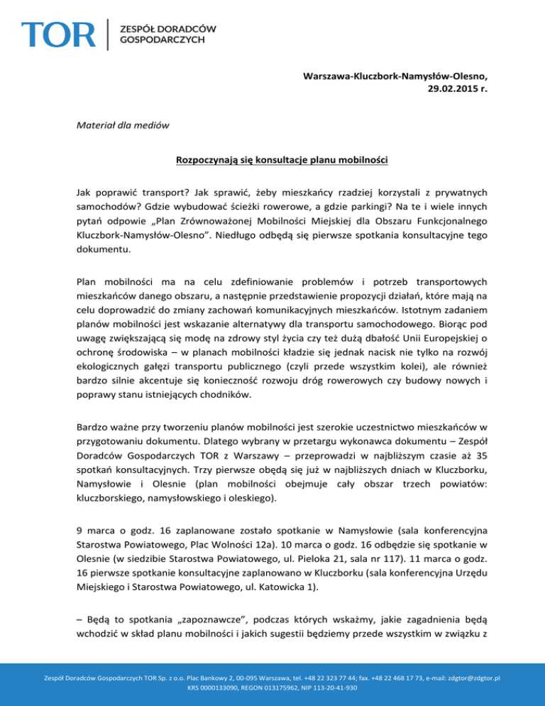 Warszawa-Kluczbork-Namysłów-Olesno, 29.02.2015 r. Materiał dla mediów Rozpoczynają się konsultacje planu mobilności Jak poprawić transport? Jak sprawić, żeby mieszkańcy rzadziej korzystali z prywatnych samochodów? Gdzie wybudować ścieżki rowerowe, a gdzie parkingi? Na te i wiele innych pytań odpowie „Plan Zrównoważonej Mobilności Miejskiej dla Obszaru Funkcjonalnego Kluczbork-Namysłów-Olesno”. Niedługo odbędą się pierwsze spotkania konsultacyjne tego dokumentu. Plan mobilności ma na celu zdefiniowanie problemów i potrzeb transportowych mieszkańców danego obszaru, a następnie przedstawienie propozycji działań, które mają na celu doprowadzić do zmiany zachowań komunikacyjnych mieszkańców. Istotnym zadaniem planów mobilności jest wskazanie alternatywy dla transportu samochodowego. Biorąc pod uwagę zwiększającą się modę na zdrowy styl życia czy też dużą dbałość Unii Europejskiej o ochronę środowiska – w planach mobilności kładzie się jednak nacisk nie tylko na rozwój ekologicznych gałęzi transportu publicznego (czyli przede wszystkim kolei), ale również bardzo silnie akcentuje się konieczność rozwoju dróg rowerowych czy budowy nowych i poprawy stanu istniejących chodników. Bardzo ważne przy tworzeniu planów mobilności jest szerokie uczestnictwo mieszkańców w przygotowaniu dokumentu. Dlatego wybrany w przetargu wykonawca dokumentu – Zespół Doradców Gospodarczych TOR z Warszawy – przeprowadzi w najbliższym czasie aż 35 spotkań konsultacyjnych. Trzy pierwsze obędą się już w najbliższych dniach w Kluczborku, Namysłowie i Olesnie (plan mobilności obejmuje cały obszar trzech powiatów: kluczborskiego, namysłowskiego i oleskiego). 9 marca o godz. 16 zaplanowane zostało spotkanie w Namysłowie (sala konferencyjna Starostwa Powiatowego, Plac Wolności 12a). 10 marca o godz. 16 odbędzie się spotkanie w Olesnie (w siedzibie Starostwa Powiatowego, ul. Pieloka 21, sala nr 117). 11 marca o godz. 16 pierwsze spotkanie konsultacyjne zaplanowano w Kluczborku (sala konferencyjna Urzędu Miejskiego i Starostwa Powiatowego, ul. Katowicka 1). – Będą to spotkania „zapoznawcze”, podczas których wskażmy, jakie zagadnienia będą wchodzić w skład planu mobilności i jakich sugestii będziemy przede wszystkim w związku z Zespół Doradców Gospodarczych TOR Sp. z o.o. Plac Bankowy 2, 00-095 Warszawa, tel. +48 22 323 77 44; fax. +48 22 468 17 73, e-mail: [email protected] KRS 0000133090, REGON 013175962, NIP 113-20-41-930 tym oczekiwać od mieszkańców. Później, prawdopodobnie w drugiej połowie marca, odbędą się kolejne spotkania, tym razem w każdej z 16 gmin objętych planem mobilności, podczas których szczegółowo będziemy omawiać z mieszkańcami problemy komunikacyjne ich najbliższej okolicy. Niedługo będzie również dostępna ankieta, w wersji papierowej i internetowej, za pośrednictwem której mieszkańcy będą mogli zgłaszać swoje postulaty komunikacyjne. Zebrane tą drogą opinie będą miały kluczową rolę w tworzeniu planu mobilności – mówi Paweł Rydzyński, dyrektor ds. projektów transportowych w Zespole Doradców Gospodarczych TOR. Dane do kontaktu: Paweł Rydzyński Zespół Doradców Gospodarczych TOR; Plac Bankowy 2; 00-095 Warszawa. Tel. 0-22-323-77-44; fax. 0-22-468-17-73. Tel. kom.: 0-609-025-897 E-mail: [email protected] W przypadku jakichkolwiek pytań, pozostaję do dyspozycji. Zespół Doradców Gospodarczych TOR Sp. z o.o. Plac Bankowy 2, 00-095 Warszawa, tel. +48 22 323 77 44; fax. +48 22 468 17 73, e-mail: [email protected] KRS 0000133090, REGON 013175962, NIP 113-20-41-930