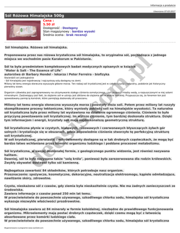 Informacje o produkcie Utworzono 07-03-2017 Sól Różowa Himalajska 500g Cena : 5.50 zł Dostępność : Dostępny Stan magazynowy : bardzo wysoki Średnia ocena : brak recenzji Sól himalajska. Różowa sól himalajska. m .p l Proponowana przez nas różowa krystaliczna sól himalajska, to oryginalna sól, pochodząca z jednego miejsca we wschodnim pasie Karakorum w Pakistanie. Sól ta była przedmiotem kompleksowych badań medycznych opisanych w książce "Water & Salt - The Essence of Life" autorstwa dr Barbary Hendel - lekarza i Peter Ferreira - biofizyka. Stwierdzili oni jednogłośnie - Sól himalajska jest najzdrowszą i najczystszą solą dostępną na ziemi. Miliony lat temu energia słoneczna wysuszyła główne morza. Ten rodzaj soli krystalicznej jest w całości czysty i naturalny, podobnie jak historyczny pierwotny ocean. .c o Organizm człowieka jest zaprogramowany na utrzymywanie stałego ciśnienia osmotycznego, czyli proporcji między wodą, a rozpuszczonymi w niej solami mineralnymi. Zadziwiający jest fakt, że stężenie soli w ustroju jest zbliżone do stężenia soli w wodzie morskiej. Przypuszcza się, że fenomen ten jest spowodowany pamięcią komórek, które pamiętają doskonałą sól praoceanu. es is Miliony lat temu energia słoneczna wysuszyła morza i powstały złoża soli. Potem przez miliony lat ruszyły skomplikowane procesy tektoniczne, który wyniosły pokłady soli na himalajskie wysokości. Ta naturalna sól krystaliczna była przez miliony lat wystawiona na działanie ogromnego ciśnienia. Ciśnienie to było przyczyną powstawania soli krystalicznej. Im wyższe ciśnienie, tym bardziej doskonała struktura. Dzięki tym informacjom i energii, kryształy soli mają najdoskonalszą geometryczną strukturę. Sól krystaliczna płynie w czystych, białawych, różowawych i czerwonawych błyszczących żyłach gór solnych i krystalizuje się w obszarach, gdzie odpowiednie ciśnienie stworzyło tę perfekcyjną strukturę soli krystalicznej. W soli krystalicznej, pierwiastki i mikroelementy dostępne są w tak drobnych cząsteczkach, że mogą być bardzo łatwo wchłaniane przez komórki organizmu ludzkiego i poddane procesowi metabolizmu. de Sól krystaliczna, w swojej doskonałej formie, z geologicznego punktu widzenia, jest również nazywana halitem. Dawniej, sól ta była nazywana także "solą króla", ponieważ była zarezerwowana dla rodzin królewskich. Zwykły obywatel dostawał tylko sól kamienną. Najbogatsza zawartość 84 składników, których potrzebuje nasz organizm. Przeznaczenie: spożywcze, kosmetyczne, dekoracyjne, neutralizacja elektrosmogu, kąpiele odmładzające, nawilżanie skóry, zdrowotne. Czysta, nieskażona sól z czasów, gdy ziemia była nieskazitelnie czysta. Nie ma żadnych zanieczyszczeń ze środowiska. Zawiera informacje z czasów ponad 250 mln lat temu. W przeciwieństwie do powszechnie używanego, szkodliwego chlorku sodu, himalajska sól krystaliczna wykazuje niezwykłe właściwości prozdrowotne. Sól himalajska zawiera aż 84 minerały w formie koloidalnej, niezbędne do prawidłowego funkcjonowania organizmu. Mikroelementy mają postać drobnych cząsteczek, dzięki czemu mogą być z łatwością absorbowane przez komórki ludzkiego ciała. W przeciwieństwie do powszechnie używanego, szkodliwego chlorku sodu, himalajska sól krystaliczna Wygenerowano w programie www.oscGold.com de es is .c o m .p l wykazuje niezwykłe właściwości prozdrowotne.