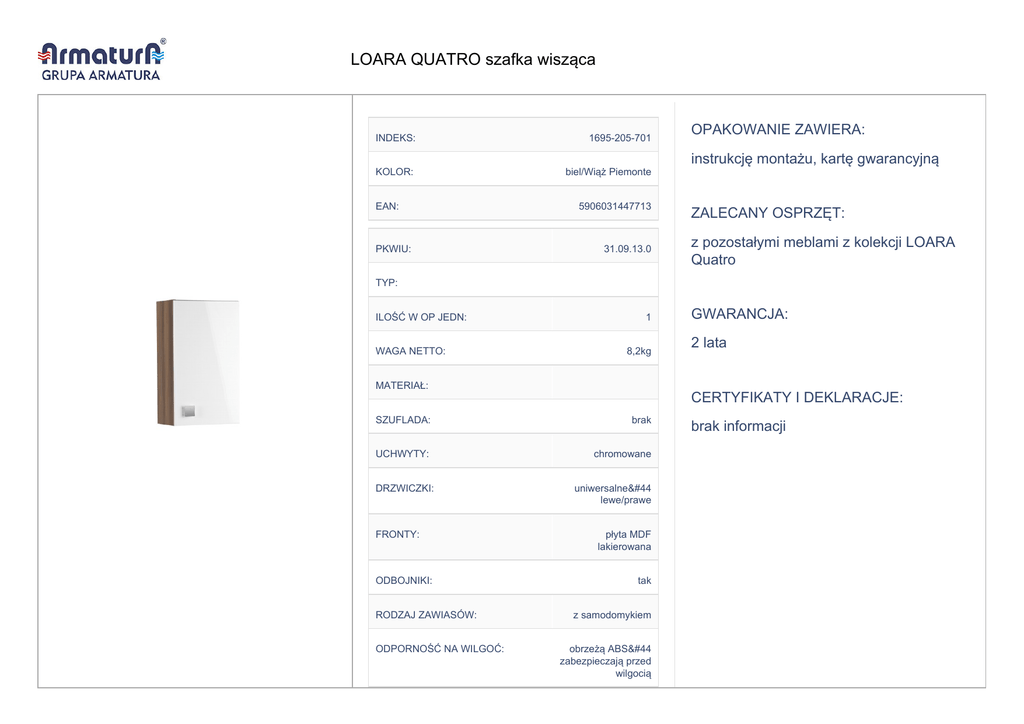 LOARA QUATRO szafka wisząca INDEKS: 1695-205-701 KOLOR: biel/Wiąż Piemonte OPAKOWANIE ZAWIERA: instrukcję montażu, kartę gwarancyjną EAN: PKWIU: 5906031447713 31.09.13.0 ZALECANY OSPRZĘT: z pozostałymi meblami z kolekcji LOARA Quatro TYP: ILOŚĆ W OP JEDN: WAGA NETTO: 1 8,2kg GWARANCJA: 2 lata MATERIAŁ: CERTYFIKATY I DEKLARACJE: SZUFLADA: brak UCHWYTY: chromowane DRZWICZKI: FRONTY: ODBOJNIKI: RODZAJ ZAWIASÓW: ODPORNOŚĆ NA WILGOĆ: uniwersalne, lewe/prawe płyta MDF lakierowana tak z samodomykiem obrzeżą ABS, zabezpieczają przed wilgocią brak informacji PÓŁKI: płyta wiórowa KORPUS: płyta wiórowa laminowana SYSTEM SPOWALNIAJACY: brak NÓŻKI: brak LOARA QUATRO szafka wisząca