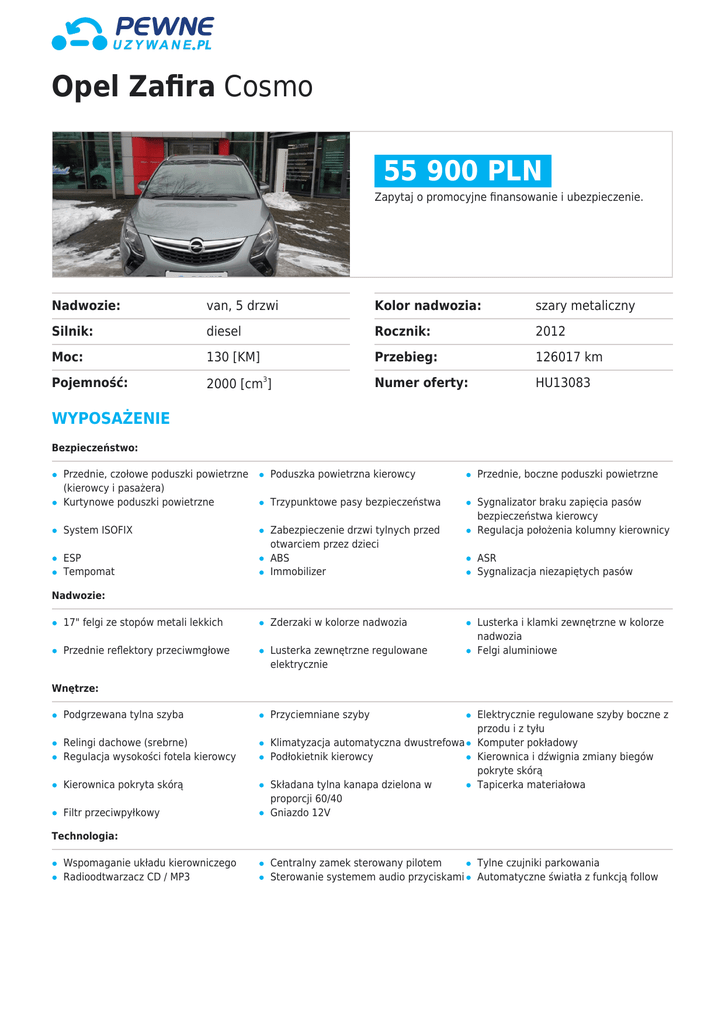 Opel Zafira Cosmo 55 900 PLN Zapytaj o promocyjne finansowanie i ubezpieczenie. Nadwozie: van, 5 drzwi Kolor nadwozia: szary metaliczny Silnik: diesel Rocznik: 2012 Moc: 130 [KM] Przebieg: 126017 km Pojemność: 2000 [cm ] Numer oferty: HU13083 3 WYPOSAŻENIE Bezpieczeństwo: Przednie, czołowe poduszki powietrzne (kierowcy i pasażera) Kurtynowe poduszki powietrzne Poduszka powietrzna kierowcy Przednie, boczne poduszki powietrzne Trzypunktowe pasy bezpieczeństwa System ISOFIX Zabezpieczenie drzwi tylnych przed otwarciem przez dzieci ABS Immobilizer Sygnalizator braku zapięcia pasów bezpieczeństwa kierowcy Regulacja położenia kolumny kierownicy ESP Tempomat ASR Sygnalizacja niezapiętych pasów Nadwozie: 17" felgi ze stopów metali lekkich Zderzaki w kolorze nadwozia Przednie reflektory przeciwmgłowe Lusterka zewnętrzne regulowane elektrycznie Lusterka i klamki zewnętrzne w kolorze nadwozia Felgi aluminiowe Wnętrze: Podgrzewana tylna szyba Przyciemniane szyby Relingi dachowe (srebrne) Regulacja wysokości fotela kierowcy Klimatyzacja automatyczna dwustrefowa Podłokietnik kierowcy Kierownica pokryta skórą Składana tylna kanapa dzielona w proporcji 60/40 Gniazdo 12V Filtr przeciwpyłkowy Elektrycznie regulowane szyby boczne z przodu i z tyłu Komputer pokładowy Kierownica i dźwignia zmiany biegów pokryte skórą Tapicerka materiałowa Technologia: Wspomaganie układu kierowniczego Radioodtwarzacz CD / MP3 Centralny zamek sterowany pilotem Sterowanie systemem audio przyciskami Tylne czujniki parkowania Automatyczne światła z funkcją follow Opel Zafira Cosmo Nawigacja satelitarna GPS na kierownicy Przednie czujniki parkowania me home DODATKOWE INFORMACJE: Salon Japan Motors Chorzów Autoryzowany Dealer marek Nissan oraz Suzuki wchodzący w skład sieci Pewne Używane oferuje do sprzedaży: Opel Zafira sprowadzony od pierwszego właściciela, serwisowany w ASO, po opłatach celno-skarbowych, poddany kontroli technicznej w naszym autoryzowanym serwisie Suzuki/Nissan. Pewne Używane gwarantuje: 1.Sprawdzony Stan Techniczny Oraz Pochodzenie Samochodów. 2.Atrakcyjną Ofertę Finansową Oraz Ubezpieczeń. 3.Odkup Twojego Samochodu. 4.Obejrzenie Samochodu W Zadaszonym Dobrze Oświetlonym Pomieszczeniu. 5.JAKOŚĆ OBSŁUGI POTWIERDZONĄ NAGRODĄ RYNKU DEALERSKIEGO: !!!NAJLEPSZY DEALER AUT UŻYWANYCH ROKU!!! Niniejsze ogłoszenie jest wyłącznie informacją handlową i nie stanowi oferty w myśl art. 66, §1. Kodeksu cywilnego. Sprzedający nie odpowiada za ewentualne błędu lub nieaktualność ogłoszenia. Pewne Używane Chorzów ul. Zielony Zaułek 2, tel.:32 609 04 27 www.blog.pgd.pl Nota prawna Dane zawarte w niniejszej propozycji handlowej mają wyłącznie charakter informacyjny. Podane informacje nie stanowią oferty ani zapewnienia, w szczególności w rozumieniu art. 66 § 1 oraz art. 5561 Kodeksu cywilnego. Wiążące ustalenie ceny, wyposażenia oraz specyfikacji samochodu następuje w pisemnej umowie sprzedaży/zamówienia samochodu. Ze względu na ograniczenia techniczne (np. odwzorowanie kolorów przez monitor lub sposób wydruku), kolory przedstawione w niniejszej propozycji handlowej mogą się różnić od rzeczywistych kolorów nadwozia i tapicerki. Niniejsza propozycja handlowa oraz wszelkie załączniki z nią związane są poufne i nie mogą być przekazywane osobom trzecim. Prezentowane zdjęcia mogą zawierać wyposażenie opcjonalne (akcesoryjne), dodatkowo płatne. Warunki oferty maja charakter orientacyjny i mogą zostać zmienione w momencie uaktualnienia cen lub warunków promocji.