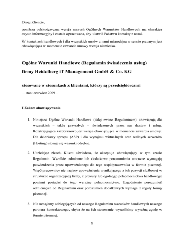 Drogi Kliencie, poniższa polskojęzyczna wersja naszych Ogólnych Warunków Handlowych ma charakter czysto informacyjny i została opracowana, aby ułatwić Państwu kontakty z nami. W kontaktach handlowych i dla wszystkich umów z nami miarodajna w sensie prawnym jest obowiązująca w momencie zawarcia umowy wersja niemiecka. Ogólne Warunki Handlowe (Regulamin świadczenia usług) firmy Heidelberg iT Management GmbH & Co. KG stosowane w stosunkach z klientami, którzy są przedsiębiorcami – stan: czerwiec 2009 – I Zakres obowiązywania 1. Niniejsze Ogólne Warunki Handlowe (dalej zwane Regulaminem) obowiązują dla wszystkich – także przyszłych – świadczonych przez nas dostaw i usług. Rozstrzygająca każdorazowo jest wersja obowiązująca w momencie zawarcia umowy. Dla dzierżawy sprzętu (ASP) i dla wynajmu wirtualnych oraz realnych serwerów (Hosting) stosuje się warunki odrębne. 2. Udzielając zleceń, Klient oświadcza, że akceptuje obowiązujący w tym czasie Regulamin. Wszelkie odmienne lub dodatkowe porozumienia umowne wymagają potwierdzenia przez upoważnionego do tego współpracownika w formie pisemnej. Współpracownicy nie mający upoważnienia wynikającego z ich pozycji służbowej w strukturze organizacyjnej firmy, z prokury lub ogólnego pełnomocnictwa handlowego powinni posiadać do tego wyraźne pełnomocnictwo. Uzgodnienie porozumień odmiennych od Regulaminu oraz porozumień dodatkowych wymaga z reguły formy pisemnej. 3. Nie uznajemy odbiegających od naszego Regulaminu warunków handlowych naszego partnera kontraktowego, chyba że na ich stosowanie wyraziliśmy wyraźną zgodę w formie pisemnej. 1 II Oferta i zawarcie umowy 1. Nasze oferty mają zawsze charakter dobrowolny i niewiążący, chyba że wyraźnie określono je jako wiążące lub jednoznacznie wynika to z okoliczności. W przypadku udzielenia zlecenia w odpowiedzi na naszą niewiążącą ofertę, umowa dochodzi do skutku dopiero w momencie potwierdzenia z naszej strony. Bezpośrednie wykonanie usługi jak również wystawienie rachunku stanowią takie potwierdzenie. Jeśli w terminie 4 tygodni brak jest z naszej strony potwierdzenia, przestajecie Państwo być związani udzielonym nam zleceniem. Przesłane przez nas cenniki jak również prezentacja produktów w Internecie nie stanowią prawnie wiążącej oferty. Dane techniczne, informacje o sposobie użytkowania, dane dotyczące przeznaczenia oraz odwzorowanie produktów w naszych materiałach reklamowych, prospektach oraz w pozostałej dokumentacji nie stanowią oferty do zawarcia umowy gwarancyjnej w rozumieniu § 443 niemieckiego Kodeksu Cywilnego (BGB) ani zapewnienia uzgodnionych właściwości. 2. Warunki zawarte w ofertach o charakterze wiążącym obowiązują 4 tygodnie, chyba że sama oferta określa inny termin. 3. Zastrzegamy sobie prawo własności i prawa autorskie na wszystkich dokumentach pozostających w związku z udzieleniem zlecenia, takich jak np. rysunki, wzory, obliczenia itp. Dokumenty te nie mogą być kopiowane ani w żaden inny sposób udostępniane osobom trzecim, chyba że udzieliliśmy Klientowi na to wyraźnego zezwolenia w formie pisemnej. Na nasze wezwanie wszystkie te dokumenty należy nam zwrócić. 4. Zawarcie umowy następuje z zastrzeżeniem otrzymania przez nas prawidłowej i terminowej oraz kompletnej dostawy. O „wąskich gardłach“ dostaw będziemy Państwa oczywiście natychmiast informować. Gdyby dostarczenie poszczególnych przedmiotów nie było możliwe, jesteśmy uprawnieni do dostarczenia równoważnych zamienników, o ile nie stoją temu na przeszkodzie uzasadnione interesy Państwa. 5. Współpracownicy, których wyraźne pełnomocnictwo nie wynika z ich pozycji służbowej, udzielonej prokury lub nieograniczonego pełnomocnictwa handlowego, nie są upoważnieni do udzielania gwarancji lub zapewnień. 2 6. W przypadku wątpliwości decyduje pisemny opis usługi. Zastrzegamy sobie prawo do dokonywania zmian wynikających z postępu technicznego, w tym w szczególności do dostarczenia nowszych modeli lub części. III Ceny 1. Cena wynika z potwierdzenia zamówienia i obowiązuje wyłącznie dla określonego w potwierdzeniu miejsca przeznaczenia dostawy. Wszystkie ceny należy rozumieć jako powiększone o obowiązującą w dniu dostawy, a w przypadku opłaty z góry – w dniu płatności, wartość podatku VAT. Koszty opakowania, prac i materiałów instalacyjnych, szkoleń, serwisu, pielęgnacji, towarzyszącego doradztwa oraz innych usług posiłkowych kalkuluje się odrębnie, chyba że wyraźnie ustalono coś odrębnego. O ile nie uzgodniono inaczej, zamówiony towar dostarczamy na koszt Klienta, za zaliczeniem pocztowym. 2. Jeśli dla zlecenia nie ustalono żadnej ceny, obowiązują ogólnie przyjęte w momencie wykonania usługi ceny katalogowe oraz stawki godzinowe. Jeżeli brak jest naszej ceny katalogowej, obowiązują sugerowane w chwili dostawy ceny producenta. Jeśli brak jest cen katalogowych oraz cen sugerowanych producenta, jesteśmy uprawnieni do wyznaczenia ceny w oparciu o zasady słuszności, uwzględniając stawki zwyczajowe (§ 315 BGB). 3. Jeseśmy uprawnieni do uzależnienia przyjęcia zlecenia do realizacji od uzgodnienia zaliczki lub dostaw za zaliczeniem pocztowym. 4. W przypadku usług na żądanie, usług serwisowych oraz pozostałych zobowiązań o charakterze ciągłym jesteśmy uprawnieni do stosownego dopasowania cen w trakcie stosunku zobowiązaniowego. Za stosowne uważa się dopasowania cen niepozostające w rażącej sprzeczności z rozwojem cen i płac typowym dla branży, ewentualnie z rozwojem kosztów w zakresie, w jakim są one istotne dla kształtowania się ceny danego produktu. Zmiany cen nie przekraczające 5 %w skali roku uważa się zasadniczo za stosowne. Jeśli dopasowanie ceny następuje ogólnie dla wszystkich bieżących umów, przy ustalaniu stosowności dopasowania należy wziąć pod uwagę ogólne kształtowanie się 