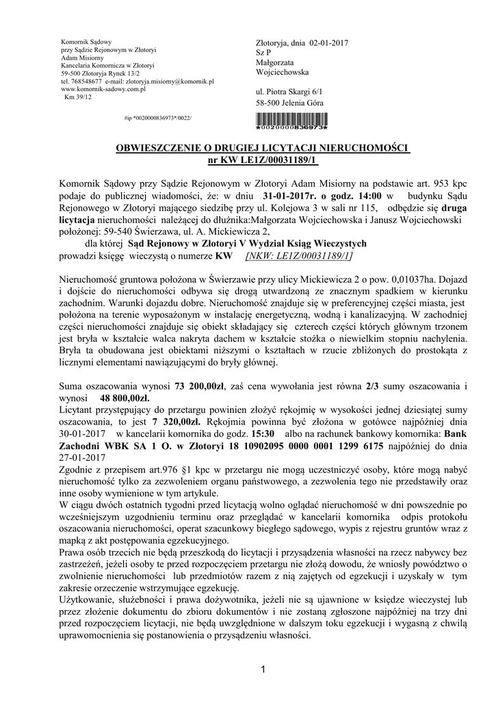 Komornik Sądowy przy Sądzie Rejonowym w Złotoryi Adam Misiorny Kancelaria Komornicza w Złotoryi 59-500 Złotoryja Rynek 13/2 tel. 768548677 e-mail: [email protected] www.komornik-sadowy.com.pl Km 39/12 #ip *0020000836973*/0022/ Złotoryja, dnia 02-01-2017 Sz P Małgorzata Wojciechowska ul. Piotra Skargi 6/1 58-500 Jelenia Góra *0020000836973* OBWIESZCZENIE O DRUGIEJ LICYTACJI NIERUCHOMOŚCI nr KW LE1Z/00031189/1 Komornik Sądowy przy Sądzie Rejonowym w Złotoryi Adam Misiorny na podstawie art. 953 kpc podaje do publicznej wiadomości, że: w dniu 31-01-2017r. o godz. 14:00 w budynku Sądu Rejonowego w Złotoryi mającego siedzibę przy ul. Kolejowa 3 w sali nr 115, odbędzie się druga licytacja nieruchomości należącej do dłużnika:Małgorzata Wojciechowska i Janusz Wojciechowski położonej: 59-540 Świerzawa, ul. A. Mickiewicza 2, dla której Sąd Rejonowy w Złotoryi V Wydział Ksiąg Wieczystych prowadzi księgę wieczystą o numerze KW [NKW: LE1Z/00031189/1] Nieruchomość gruntowa położona w Świerzawie przy ulicy Mickiewicza 2 o pow. 0,01037ha. Dojazd i dojście do nieruchomości odbywa się drogą utwardzoną ze znacznym spadkiem w kierunku zachodnim. Warunki dojazdu dobre. Nieruchomość znajduje się w preferencyjnej części miasta, jest położona na terenie wyposażonym w instalację energetyczną, wodną i kanalizacyjną. W zachodniej części nieruchomości znajduje się obiekt składający się czterech części których głównym trzonem jest bryła w kształcie walca nakryta dachem w kształcie stożka o niewielkim stopniu nachylenia. Bryła ta obudowana jest obiektami niższymi o kształtach w rzucie zbliżonych do prostokąta z licznymi elementami nawiązującymi do bryły głównej. Suma oszacowania wynosi 73 200,00zł, zaś cena wywołania jest równa 2/3 sumy oszacowania i wynosi 48 800,00zł. Licytant przystępujący do przetargu powinien złożyć rękojmię w wysokości jednej dziesiątej sumy oszacowania, to jest 7 320,00zł. Rękojmia powinna być złożona w gotówce najpóżniej dnia 30-01-2017 w kancelarii komornika do godz. 15:30 albo na rachunek bankowy komornika: Bank Zachodni WBK SA 1 O. w Złotoryi 18 10902095 0000 0001 1299 6175 najpóźniej do dnia 27-01-2017 Zgodnie z przepisem art.976 §1 kpc w przetargu nie mogą uczestniczyć osoby, które mogą nabyć nieruchomość tylko za zezwoleniem organu państwowego, a zezwolenia tego nie przedstawiły oraz inne osoby wymienione w tym artykule. W ciągu dwóch ostatnich tygodni przed licytacją wolno oglądać nieruchomość w dni powszednie po wcześniejszym uzgodnieniu terminu oraz przeglądać w kancelarii komornika odpis protokołu oszacowania nieruchomości, operat szacunkowy biegłego sądowego, wypis z rejestru gruntów wraz z mapką z akt postępowania egzekucyjnego. Prawa osób trzecich nie będą przeszkodą do licytacji i przysądzenia własności na rzecz nabywcy bez zastrzeżeń, jeżeli osoby te przed rozpoczęciem przetargu nie złożą dowodu, że wniosły powództwo o zwolnienie nieruchomości lub przedmiotów razem z nią zajętych od egzekucji i uzyskały w tym zakresie orzeczenie wstrzymujące egzekucję. Użytkowanie, służebności i prawa dożywotnika, jeżeli nie są ujawnione w księdze wieczystej lub przez złożenie dokumentu do zbioru dokumentów i nie zostaną zgłoszone najpóźniej na trzy dni przed rozpoczęciem licytacji, nie będą uwzględnione w dalszym toku egzekucji i wygasną z chwilą uprawomocnienia się postanowienia o przysądzeniu własności. 1 Komornik Sądowy Adam Misiorny 2