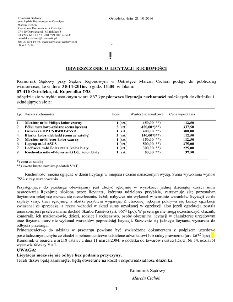 Komornik Sądowy przy Sądzie Rejonowym w Ostrołęce Marcin Cichoń Kancelaria Komornicza w Ostrołęce 07-410 Ostrołęka ul. Kilińskiego 5 tel. (29) 691 71 55, 601 789 602 e-mail: [email protected] fax: 29 691 19 92, www.ostroleka-komornik.pl Km 612/14 Ostrołęka, dnia 21-10-2016 . * OBWIESZCZENIE O LICYTACJI RUCHOMOŚCI Komornik Sądowy przy Sądzie Rejonowym w Ostrołęce Marcin Cichoń podaje do publicznej wiadomości, że w dniu 30-11-2016r. o godz. 11:00 w lokalu: 07-410 Ostrołęka, ul. Kopernika 7/38 odbędzie się w trybie ustalonym w art. 867 kpc pierwsza licytacja ruchomości należących do dłużnika i składających się z: ____________________________________________________________________________________________________ Lp. Nazwa ruchomości Ilość Wartość szacunkowa Cena wywołania _____________________________________________________________________________________________________ 1. Monitor m-ki Philips kolor czarny 1 [szt.] 150,00 **) 112,50 2. Półki metalowo-szklane (cena łączna) 3 [szt.] 450,00*)**) 337,50 3. Drukarka HP CNBW83W5Y9 1 [szt.] 400,00 **) 300,00 4. Biurka kolor niebieski (cena za sztukę) 3 [szt.] 150,00*)**) 112,50 5. Monitor m-ki Acer kolor czarny 1 [szt.] 150,00 **) 112,50 6. Laptop m-ki ASUS 1 [szt.] 500,00 **) 375,00 7. Lodówka m-ki Polar mała, kolor biały 1 [szt.] 300,00 **) 225,00 8. Kuchenka mikrofalowa m-ki LG, kolor biały 1 [szt.] 50,00 **) 37,50 _______________________________________________________________________________________________________________________ *) cena za sztukę **) kwota brutto zawiera podatek VAT Ruchomości można oglądać w dzień licytacji w miejscu i czasie oznaczonym wyżej. Suma wywołania wynosi 75% sumy oszacowania. Przystępujący do przetargu obowiązany jest złożyć rękojmię w wysokości jednej dziesiątej części sumy oszacowania. Rękojmię złożoną przez licytanta, któremu udzielono przybicia, zatrzymuje się; pozostałym licytantom rękojmię zwraca się niezwłocznie. Jeżeli nabywca nie wykonał w terminie warunków licytacji co do zapłaty ceny, traci rękojmię, a skutki przybicia wygasają. Z utraconej rękojmi pokrywa się koszty egzekucji związanej ze sprzedażą, a reszta wchodzi w skład sumy uzyskanej w egzekucji albo jeżeli egzekucja została umorzona jest przelewana na dochód Skarbu Państwa (art. 8671 kpc). W przetargu nie mogą uczestniczyć: dłużnik, komornik, ich małżonkowie, dzieci, rodzice i rodzeństwo, osoby obecne na licytacji w charakterze urzędowym oraz licytant, który nie wykonał warunków poprzedniej licytacji. Stawienie się jednego licytanta wystarcza do odbycia przetargu. Pełnomocnictwo do udziału w przetargu powinno być stwierdzone dokumentem z podpisem urzędowo poświadczonym, chyba że chodzi o pełnomocnictwo udzielone adwokatowi lub radcy prawnemu (art. 8672 kpc) Komornik w oparciu o art.18 ustawy z dnia 11 marca 2004r o podatku od towarów i usług (Dz.U. Nr 54, poz.535) wystawia faktury VAT. UWAGA: Licytacja może się nie odbyć bez podania przyczyny. Jeżeli drzwi będą zamknięte, będą otwierane na koszt i odpowiedzialność dłużnika. Komornik Sądowy Marcin Cichoń 1
