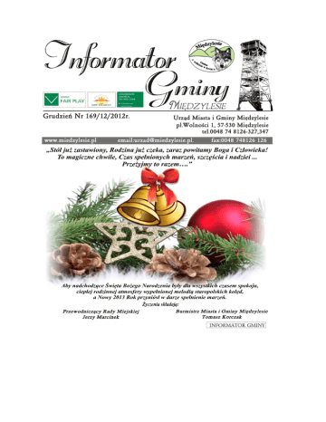 ROZMOWA Z TOMASZEM KORCZAKIEM BURMISTRZEM MIĘDZYLESIA Kolejny już raz spotykamy się u schyłku roku, by porozmawiać o sprawach, które w sposób szczególny interesują naszych współmieszkańców. Aktualnie trwają prace nad przyszłorocznym budżetem. Czy mógłby pan przybliżyć czytelnikom jego założenia ? Rzeczywiście, prace nad budżetem trwają i są już w znacznym stopniu zaawansowane. Jego projekt zyskał pozytywną opinię Regionalnej Izby Obrachunkowej, co znaczy że dążymy w dobrym kierunku. Aktualnie jego założenia omawiane są szczegółowo na posiedzeniach wszystkich komisji rady, Zaplanowany został w oparciu o wskaźniki Ministerstwa Finansów, przy czym natychmiast zaznaczyć trzeba, że nie napawają one optymizmem… Staramy się, by budżet był zrównoważony i realistyczny. Zagrożeniem są dochody, bo jeśli Polski nie ominie kryzys, to nie ominie on i naszej gminy ! To wszystko jest system naczyń połączonych o czym cały czas należy pamiętać… Praca nad budżetem wymaga szczególnej odpowiedzialności, dlatego chciałbym podziękować radnym za ich merytoryczne i konstruktywne podejście do tego odpowiedzialnego i niełatwego przecież zadania. Jednocześnie korzystając z okazji chciałbym wyjaśnić pewną istotną, związaną z finansami gminy kwestię. Otóż mówi się sporo o zadłużeniu gminy. Jest ono na poziomie 45 % wartości budżetu. Zgodnie z przepisami do zadłużenia nie wlicza się działań związanych z wykorzystaniem środków unijnych, jednak ja podaję zawsze globalne zadłużenie, czyli owe 45 %, a gdyby tak liczyć, to mógłbym mówić o zadłużeniu kilkunastu %. Nasze zadłużenie powstało na skutek finansowania udziału własnego w inwestycjach unijnych tj. kanalizacje, wodociągowanie, remonty obiektów komunalnych, basen, stadion i inne… Sprawą nie mniej interesującą mieszkańców jest trwająca przebudowa basenu… Basen przebudowywany jest w tempie, które mnie nie zadawala. Przy okazji poprzedniej naszej rozmowy mówiłem, że firma która wygrała przetarg została usunięta z placu budowy. Wyłoniona została firma nowa, która kontynuuje zadanie. Jednakże czas niezbędny do przejęcia placu budowy od poprzedników spowodował, że tak naprawdę prace ruszyły dopiero od września i na wiosnę zostaną zakończone. Wszystkie szczegóły związane z wykonywanymi pracami opisujemy na łamach „Informatora”, oraz w specjalnej zakładce na naszej stronie internetowej (www.miedzylesie.pl). Wiem, że inwestycja ta budzi wiele emocji, stąd moje starania, by informacja była jak najbardziej wyczerpująca. Parlament przyszykował gminom niezbyt smaczny pasztet w postaci ustawy „śmieciowej”. W jaki sposób „twórcze” działania parlamentarzystów przełożą się na życie gminy i jej mieszkańców ? Rzeczywiście. Kolejnym „prezentem” jaki szykuje się nam na rok przyszły jest sprawa śmieci. Od wielu miesięcy poprzez „Informator” staramy się przybliżać ten temat. Moim zdaniem rozwiązania jakie mają być w Polsce zastosowane w tej sprawie są niekorzystne dla obywateli. Według nowych przepisów jedno wysypisko śmieci ma obsługiwać minimum 120.000 ludzi. Koszt budowy takiej instalacji, to kilkadziesiąt milionów złotych. Oprócz tego nowe przepisy wprowadzają „podatek śmieciowy”, który każdy obywatel będzie płacił gminie. Natomiast gmina musi w przetargu wybrać firmę, która – po wygraniu, za pieniądze zebrane od mieszkańców będzie wywozić śmieci. W przetargu nie może brać udziału zakład budżetowy gminy, a spółka komunalna nie będzie miała żadnych gwarancji, że wygra przetarg z firmą o zasięgu ogólnopolskim ! Takie rozwiązania zwielokrotniają koszty, co musi się przełożyć na znaczną podwyżkę cen za usuwanie śmieci. Mam wrażenie, że będzie gorzej i drożej…O wszystkich działaniach w tej sprawie będziemy nadal informować na stronach naszego „Informatora” i stronie internetowej gminy. Po raz pierwszy usłyszeliśmy o „zbiorowym przetargu” na dostawę energii elektrycznej… Nasza gmina i kilkadziesiąt innych gmin, wystąpiła z pomysłem „dogadania” się i zorganizowania przetargu na dostawę energii elektrycznej wykorzystywanej przez jednostki organizacyjne gminy i do oświetlania dróg. Nasza w pozytywnym tego słowa znaczeniu „zmowa” spowodowała, że udało się uzyskać prąd tańszy niż dotychczas. Przymierzamy się wspólnie do innych podobnych przetargów np. na dostawę gazu, ubezpieczenia itp. Widzę na ścianie nowy, kolejny już certyfikat „Gminy Fair Play”. Zdobycie go cieszy na pewno władającego gminą ? Oczywiście, że odczuwam satysfakcję ! Od wielu lat w Polsce organizowany jest w Polsce konkurs „Gmina i Przedsiębiorstwo Fair Play”. Generalnie konkurs polega na tym, że jednostka poddaje się szczegółowej ocenie ekspertów Krajowej Izby Gospodarczej. Oceniana jest transparentność, przejrzystość i jasność przepisów podejmowanych przez radę i działań gminy. Gminy i przedsiębiorstwa które dostają oceny pozytywne, uzyskują stosowny certyfikat. Takich gmin w Polsce jest ponad sześćdziesiąt, a wśród nich nasza gmina ! Na zakończenie naszej rozmowy może pan burmistrz powie coś od siebie… Chciałbym podziękować mieszkańcom za ich pomoc i wsparcie odczuwane przez cały rok. Kończy się rok 2012, za nami wiele wspólnych inicjatyw, a przed nami rok 2013. Życzę wszystkim, ale także i sobie, by był dla nas pomyślny ! Dziękuję radzie za merytoryczną i intensywną pracę. Nie chcę tutaj wymieniać wszystkich, którzy pomagali, bo boję się, że kogoś pominę, ale raz jeszcze składam im serdeczne podziękowania ! Dziękuję za rozmowę SPOTKANIE Z SYBIRAKAMI… 5. grudnia 2012 r. w Bibliotece Publicznej w Międzylesiu odbyło się kolejne spotkanie międzyleskiej grupy Sybiraków, tym razem poświęcone wysłuchaniu relacji pana J. Kobrynia z uczestnictwa