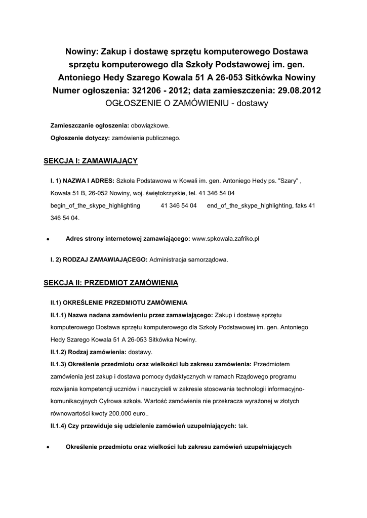 Nowiny: Zakup i dostawę sprzętu komputerowego Dostawa sprzętu komputerowego dla Szkoły Podstawowej im. gen. Antoniego Hedy Szarego Kowala 51 A 26-053 Sitkówka Nowiny Numer ogłoszenia: 321206 - 2012; data zamieszczenia: 29.08.2012 OGŁOSZENIE O ZAMÓWIENIU - dostawy Zamieszczanie ogłoszenia: obowiązkowe. Ogłoszenie dotyczy: zamówienia publicznego. SEKCJA I: ZAMAWIAJĄCY I. 1) NAZWA I ADRES: Szkoła Podstawowa w Kowali im. gen. Antoniego Hedy ps. "Szary" , Kowala 51 B, 26-052 Nowiny, woj. świętokrzyskie, tel. 41 346 54 04 begin_of_the_skype_highlighting 41 346 54 04 end_of_the_skype_highlighting, faks 41 346 54 04. Adres strony internetowej zamawiającego: www.spkowala.zafriko.pl I. 2) RODZAJ ZAMAWIAJĄCEGO: Administracja samorządowa. SEKCJA II: PRZEDMIOT ZAMÓWIENIA II.1) OKREŚLENIE PRZEDMIOTU ZAMÓWIENIA II.1.1) Nazwa nadana zamówieniu przez zamawiającego: Zakup i dostawę sprzętu komputerowego Dostawa sprzętu komputerowego dla Szkoły Podstawowej im. gen. Antoniego Hedy Szarego Kowala 51 A 26-053 Sitkówka Nowiny. II.1.2) Rodzaj zamówienia: dostawy. II.1.3) Określenie przedmiotu oraz wielkości lub zakresu zamówienia: Przedmiotem zamówienia jest zakup i dostawa pomocy dydaktycznych w ramach Rządowego programu rozwijania kompetencji uczniów i nauczycieli w zakresie stosowania technologii informacyjnokomunikacyjnych Cyfrowa szkoła. Wartość zamówienia nie przekracza wyrażonej w złotych równowartości kwoty 200.000 euro.. II.1.4) Czy przewiduje się udzielenie zamówień uzupełniających: tak. Określenie przedmiotu oraz wielkości lub zakresu zamówień uzupełniających Zamawiający przewiduje udzielenia zamówień uzupełniających, stanowiących nie więcej niż 20% wartości zamówienia podstawowego i polegających na rozszerzeniu dostawy, jeżeli wykonawcy powodowałyby konieczność nabywania rzeczy o innych parametrach technicznych, co powodowałyby niekompatybilność techniczną lub nieproporcjonalnie duże trudności techniczne w użytkowaniu i dozorze, zgodnie z zapisami art 67. ust1 pkt.7 Pzp II.1.5) Wspólny Słownik Zamówień (CPV): 30.23.60.00-2. II.1.6) Czy dopuszcza się złożenie oferty częściowej: nie. II.1.7) Czy dopuszcza się złożenie oferty wariantowej: nie. II.2) CZAS TRWANIA ZAMÓWIENIA LUB TERMIN WYKONANIA: Okres w dniach: 30. SEKCJA III: INFORMACJE O CHARAKTERZE PRAWNYM, EKONOMICZNYM, FINANSOWYM I TECHNICZNYM III.2) ZALICZKI Czy przewiduje się udzielenie zaliczek na poczet wykonania zamówienia: nie III.3) WARUNKI UDZIAŁU W POSTĘPOWANIU ORAZ OPIS SPOSOBU DOKONYWANIA OCENY SPEŁNIANIA TYCH WARUNKÓW III. 3.1) Uprawnienia do wykonywania określonej działalności lub czynności, jeżeli przepisy prawa nakładają obowiązek ich posiadania Opis sposobu dokonywania oceny spełniania tego warunku o Ocena spełniania warunku, zostanie dokonana na podstawie oświadczenia o spełnianiu warunków udziału w postępowaniu określonych w art. 22 ust. 1 Pzp wskazanego w rozdz. IX pkt 2 lit. a) siwz; III.3.2) Wiedza i doświadczenie Opis sposobu dokonywania oceny spełniania tego warunku o Ocena spełniania warunku, zostanie dokonana na podstawie oświadczenia o spełnianiu warunków udziału w postępowaniu określonych w art. 22 ust. 1 Pzp wskazanego w rozdz. IX pkt 2 lit. a) siwz. III.3.3) Potencjał techniczny Opis sposobu dokonywania oceny spełniania tego warunku o Ocena spełniania warunku, zostanie dokonana na podstawie oświadczenia o spełnianiu warunków udziału w postępowaniu określonych w art. 22 ust. 1 Pzp wskazanego w rozdz. IX pkt 2 lit. a) siwz. III.3.4) Osoby zdolne do wykonania zamówienia Opis sposobu dokonywania oceny spełniania tego warunku o Ocena spełniania warunku, zostanie dokonana na podstawie oświadczenia o spełnianiu warunków udziału w postępowaniu określonych w art. 22 ust. 1 Pzp wskazanego w rozdz. IX pkt 2 lit. a) siwz. III.3.5) Sytuacja ekonomiczna i finansowa Opis sposobu dokonywania oceny spełniania tego warunku o Ocena spełniania warunku, zostanie dokonana na podstawie oświadczenia o spełnianiu warunków udziału w postępowaniu określonych w art. 22 ust. 1 Pzp wskazanego w rozdz. IX pkt 2 lit. a) siwz. III.4) INFORMACJA O OŚWIADCZENIACH LUB DOKUMENTACH, JAKIE MAJĄ DOSTARCZYĆ WYKONAWCY W CELU POTWIERDZENIA SPEŁNIANIA WARUNKÓW UDZIAŁU W POSTĘPOWANIU ORAZ NIEPODLEGANIA WYKLUCZENIU NA PODSTAWIE ART. 24 UST. 1 USTAWY III.4.1) W zakresie wykazania spełniania przez wykonawcę warunków, o których mowa w art. 22 ust. 1 ustawy, oprócz oświadczenia o spełnieniu warunków udziału w postępowaniu, należy przedłożyć: III.4.2) W zakresie potwierdzenia niepodlegania wykluczeniu na podstawie art. 24 ust. 1 ustawy, należy przedłożyć: oświadczenie o braku podstaw do wykluczenia aktualny odpis z właściwego rejestru, jeżeli odrębne przepisy wymagają wpisu do rejestru, w celu wykazania braku podstaw do wykluczenia w oparciu o art. 24 ust. 1 pkt 2 ustawy, wystawiony nie wcześniej niż 6 miesięcy przed upływem terminu składania wniosków o dopuszczenie do udziału w postępowaniu o udzielenie zamówienia albo składania ofert, a w stosunku do osób fizycznych oświadczenie w zakresie art. 24 ust. 1 pkt 2 ustawy III.7) Czy ogranicza się możliwość ubiegania się o zamówienie publiczne tylko dla wykonawców, u których ponad 50 % pracowników stanowią osoby niepełnosprawne: nie SEKCJA IV: PROCEDURA IV.1) TRYB UDZIELENIA ZAMÓWIENIA IV.1.1) Tryb udzielenia zamówienia: przetarg nieograniczony. IV.2) KRYTERIA OCENY OFERT IV.2.1) Kryteria oceny ofert: najniższa cena. IV.2.2) Czy przeprowadzona będzie aukcja elektroniczna: nie. IV.3) ZMIANA UMOWY Czy przewiduje się istotne zmiany postanowień zawartej umowy w stosunku do treści oferty, na podstawie której dokonano wyboru wykonawcy: nie IV.4) INFORMACJE ADMINISTRACYJNE IV.4.1) Adres strony internetowej, na której jest dostępna specyfikacja istotnych warunków zamówienia: www.spkowala.zafriko.pl Specyfikację istotnych 