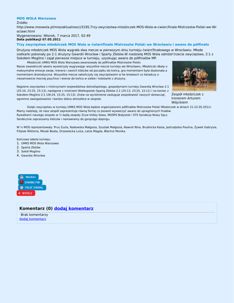 MOS WOLA Warszawa Źródło: http://www.moswola.pl/mos/aktualnosci/3195,Trzy-zwyciestwa-mlodziczek-MOS-Wola-w-cwiercfinale-Mistrzostw-Polski-we-Wr oclawi.html Wygenerowano: Wtorek, 7 marca 2017, 02:49 Data publikacji 07.05.2011 Trzy zwycięstwa młodziczek MOS Wola w ćwierćfinale Mistrzostw Polski we Wrocławiu i awans do półfinału Drużyna młodziczek MOS Wola wygrała dwa mecze w pierwszym dniu turnieju ćwierćfinałowego w Wrocławiu. Młode siatkarki pokonały po 2:1 drużyny Gwardii Wrocław i Sparty Złotów.W niedzielę MOS Wola odniósł trzecie zwycięstwo, 2:1 z Sokołem Mogilno i zajął pierwsze miejsce w turnieju, uzyskując awans do półfinałów MP. Młodziczki UMKS MOS Wola Warszawa awansowały do półfinałów Mistrzostw Polski. Nasze zawodniczki awans wywalczyły wygrywając wszystkie mecze turnieju we Wrocławiu. Młodziczki dbały o maksymalne emocje swoje, trenera i swoich kibiców od początku do końca, gra momentami była doskonała a momentami dramatyczna. Wszystkie mecze zakończyły się zwycięstwami w tie breakach co świadczy o niesamowicie mocnej psychice i wierze do końca w siebie i koleżanki z drużyny. Najpierw zwycięstwo z mistrzyniami województwa dolnośląskiego, gospodyniami turnieju Gwardią Wrocław 2:1 (25:10, 23:25, 15:13), następnie z mistrzem Wielkopolski Spartą Złotów 2:1 (25:13, 23:25, 15:11) i na koniec z Zespół młodziczek z Sokołem Mogilno 2:1 (26:24, 15:25, 15:13). Znów na wyróżnienie zasługuje zespołowość naszych dziewcząt, trenerem Arturem ogromne zaangażowanie i bardzo dobra atmosfera w zespole. Wójcikiem Dzięki zwycięstwu w turnieju UMKS MOS Wola będzie organizatorem półfinałów Mistrzostw Polski Młodziczek w dniach 21-22.05.2011r. Mamy nadzieję, że nasz zespół zaprezentuje równą formę co pozwoli wywalczyć awans do upragnionych finałów. Rywalkami naszego zespołu w ½ będą zespoły Zryw-Volley Iława, MOSPS Białystok i STS Sandecja Nowy Sącz. Serdecznie zapraszamy kibiców i namawiamy do gorącego dopingu. W ¼ MOS reprezentowały: Prus Zuzia, Nadowska Małgosia, Szustak Małgosia, Nawrot Nina, Brudnicka Kasia, Jastrzębska Paulina, Żywek Gabrysia, Filipiak Wiktoria, Misiak Beata, Drzewiecka Luiza, Latos Magda, Błachut Monika. Końcowa tabela turnieju: 1. UMKS MOS Wola Warszawa 2. Sparta Złotów 3. Sokół Mogilno 4. Gwardia Wrocław Komentarz (0) dodaj komentarz Brak komentarzy dodaj komentarz