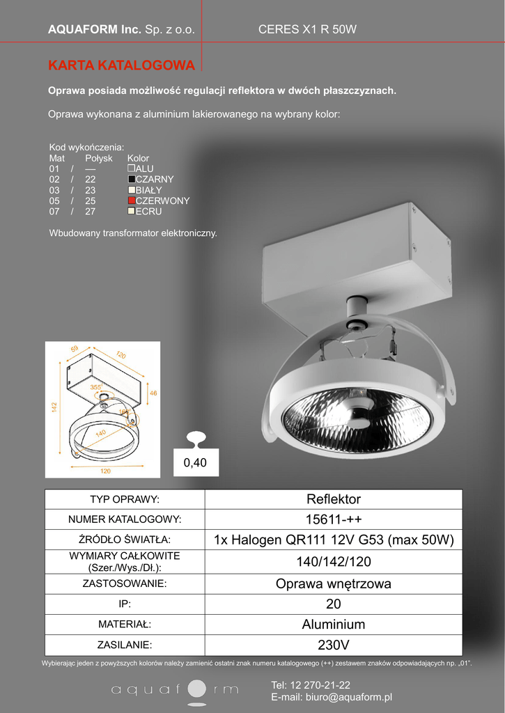 AQUAFORM Inc. Sp. z o.o. CERES X1 R 50W KARTA KATALOGOWA Oprawa posiada możliwość regulacji reflektora w dwóch płaszczyznach. Oprawa wykonana z aluminium lakierowanego na wybrany kolor: Kod wykończenia: Mat Połysk Kolor 01 / –– ALU 02 / 22 CZARNY 03 / 23 BIAŁY 05 / 25 CZERWONY 07 / 27 ECRU Wbudowany transformator elektroniczny. 0,40 NUMER KATALOGOWY: Reflektor 15611-++ ŹRÓDŁO ŚWIATŁA: 1x Halogen QR111 12V G53 (max 50W) WYMIARY CAŁKOWITE (Szer./Wys./Dł.): 140/142/120 ZASTOSOWANIE: Oprawa wnętrzowa IP: 20 MATERIAŁ: Aluminium ZASILANIE: 230V TYP OPRAWY: Wybierając jeden z powyższych kolorów należy zamienić ostatni znak numeru katalogowego (++) zestawem znaków odpowiadających np. „01”. Tel: 12 270-21-22 E-mail: [email protected]
