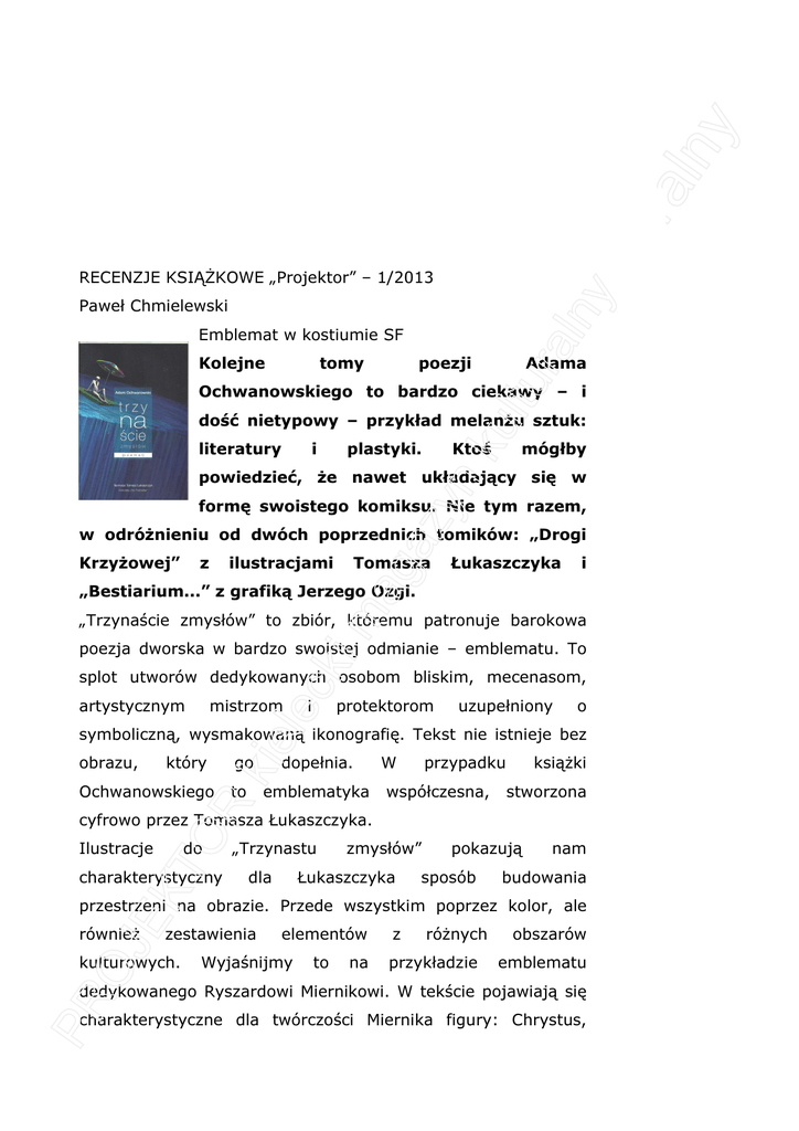 RECENZJE KSIĄŻKOWE „Projektor” – 1/2013 Paweł Chmielewski Emblemat w kostiumie SF Kolejne tomy poezji Adama Ochwanowskiego to bardzo ciekawy – i dość nietypowy – przykład melanżu sztuk: literatury i plastyki. Ktoś mógłby powiedzieć, że nawet układający się w formę swoistego komiksu. Nie tym razem, w odróżnieniu od dwóch poprzednich tomików: „Drogi Krzyżowej” z ilustracjami Tomasza Łukaszczyka i „Bestiarium...” z grafiką Jerzego Ozgi. „Trzynaście zmysłów” to zbiór, któremu patronuje barokowa poezja dworska w bardzo swoistej odmianie – emblematu. To splot utworów dedykowanych osobom bliskim, mecenasom, artystycznym mistrzom i protektorom uzupełniony o symboliczną, wysmakowaną ikonografię. Tekst nie istnieje bez obrazu, który Ochwanowskiego go to dopełnia. emblematyka W przypadku współczesna, książki stworzona cyfrowo przez Tomasza Łukaszczyka. Ilustracje do charakterystyczny „Trzynastu dla zmysłów” Łukaszczyka pokazują sposób nam budowania przestrzeni na obrazie. Przede wszystkim poprzez kolor, ale również zestawienia kulturowych. elementów Wyjaśnijmy to na z różnych przykładzie obszarów emblematu dedykowanego Ryszardowi Miernikowi. W tekście pojawiają się charakterystyczne dla twórczości Miernika figury: Chrystus, Barabasz (dowódca partyzancki), motyw drewna odsyłający do symboliki krzyża. W ilustracji widzimy postać przypominającą maszkarony na gotyckich katedrach, usadowioną w pozie prawie rodinowskiego „Myśliciela”, ale i wysoki drewniany blok to zarazem „Odyseja 2001” Kubricka oraz słup, na którym siadali asceci. Ten skrótowy opis pokazuje nam jak część ikoniczna spaja poetykę średniowiecznej, modernistycznej rzeźby z science fiction. Bogata symbolika tekstów wprowadzająca czytelnika w klimat trenu Jeremiasza (pojawia się w jednym z tekstów), symbolikę biblijną i apokryfów, Wyspiańskiego, „Balladyny”... tworzy klimat elegijny. To są nie tylko emblematy, tym wierszom coraz bliżej do popularnej w barokowym (sarmackim) świecie literackim formy epitafium. Ochwanowski żegnał się z minionym czasem już w „Siedmiu wierszach głównych”, zaś konterfekty tworzył w tomie sprzed trzech lat „Dwunastu gniewnych błaznów”. Tam był jednak sowizdrzalski, tu jest poważny. Fraza A ja finałowych widziałem rozpoczynająca dystychów i będąca każdy z trzynastu zarazem tytułem dziesięciowersowych liryków (o stałej konstrukcji – pęknięta oktawa i dwuwers) odsyłana nas do mrocznej twórczości dwóch poetów Cypriana Kamila Norwida i Krzysztofa Kamila Baczyńskiego, liryków stojących – tu użyję popkulturowego sloganu – na granicy „ciemnej strony mocy”. Eksplorujących tematykę strachu, młodością, śmierci. upadku wartości, żalu za utraconą Adam Ochwanowski, „Trzynaście zmysłów”, s. 32, il. Tomasz Łukaszczyk, Drukarnia Panzet, Kielce 2013.