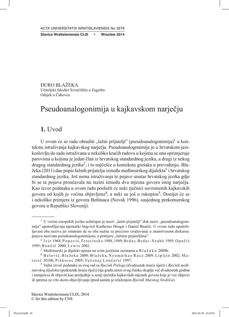Blažeka Đ., 2005, Neke zanimljivosti u prevođenju s kajkavskoga na standardni jezik, [u:] Semantika prirodnog jezika i metajezik semantike. Zbornik, ur. J. Granić, Zagreb-Split: Hrvatsko