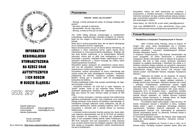PRZEDMOWA Internet - warto, czy nie warto? - Słuchaj, o której otwierają ten sklep, do którego mieliśmy dziś jechać? - Nie wiem, sprawdź w internecie. - Sprawdzałem, ale nie mają strony. - Słuchaj, a może ta firma już nie istnieje? Zespół redakcyjny: Danuta Billewicz [email protected] Liliana Bujała [email protected] Monika Sokołowska Numer zamknięto: 28 stycznia 2004 My w Internecie: http://www.autyzmirodzina.republika.pl/ Ten, krótki dialog obrazuje funkcjonujące w świadomości przeciętnego współczesnego człowieka podejście do Intenetu: jeżeli nie ma czegoś w Internecie to prawdopodobnie to nie istnieje. Może jest to trochę przesadna teza, ale na pewno obowiązuje ona w odniesieniu do firm i organizacji. Nasze stowarzyszenie ma już od dawna stronę internetową, od niedawna w nieco zmienionej formie. Adres naszej strony internetowej to www.autyzmirodzina.republika.pl. Znajduje się tam dużo bardzo użytecznej, a co najważniejsze aktualnej informacji, strona jest co jakiś czas wzbogacana o nowe informacje o autyzmie, metodach terapii, organizacjach oraz o sprawach codziennych, z którymi borykają się rodziny dzieci niepełnosprawnych umysłowo. Wszystkich gorąco zachęcam do odwiedzania naszej strony. Jest ona dla wszystkich członków naszego stowarzyszenia nieocenionym medium komunikacyjnym. Oczywiście, sprawa skorzystania ze strony internetowej jest rzeczą prostą dla osób posiadających komputer i możliwość podłączenia do internetu (wystarczy posiadać tradycyjny telefon). Gorzej jest w przypadku osób nie posiadających komputera lub telefonu. Poniżej przedstawię krótko listę sprzętu potrzebnego do tego, aby korzystać z internetu: - oczywiście komputer, nie musi być to super maszyna, za "grube" tysiące, może to być komputer klasy Pentium z systemem operacyjnym Windows 98, najprostsze komputery tego typu można na rynku wtórnym nabyć za kwotę do 500 PLN, - jeżeli chcemy korzystać z internetu poprzez linię telefoniczną będziemy potrzebowali modem, czyli urządzenie, przy pomocy którego komputer może dzwonić do dostawcy internetowego, to rozwiązanie wymaga opłacania czasu połączenia, tak jak za rozmowę telefoniczna, jednak pomiędzy godziną 18.00 i 8.00 korzystanie z internetu jest o połowę tańsze od rozmowy telefonicznej, - z internetu można korzystać również poprzez tzw. łącze stałe, czyli opłacone abonamentem (od 40 do 50 PLN na miesiąc), które pozwala na korzystanie z internetu bez dodatkowych opłat, w tym przypadku istnieje jednak opłata instalacyjna ok. 300 PLN, komputer musi być wyposażony w kartę sieciową oraz na twoim terenie musi być dostępny operator, który oferuje taką usługę (w przypadku większości osiedli mieszkaniowych nie jest to problemem). Wszystkich, którzy nie mieli dotychczas do czynienia z komputerem, a chcieliby korzystać z informacji dostępnych w internecie zachęcam do tego, jednak podczas zakupu sprzętu i jego uruchamiania poproście o pomoc kogoś doświadczonego, być może kogoś z rodziny. Adam Kalisz, tel. 246-52-59, e-mail: [email protected] Czyli nasz WEBMASTER, a więc administrator strony www, która nareszcie jest stroną profesjonalną (sprawdźcie!)! (LB). FORUM RODZICÓW Współpraca z Instytutem Terapeutycznym w Toruniu. Mam 14-letnia córkę, Patrycję, chorą na autyzm. W drugim roku życia, kiedy dowiedziałam się o chorobie, rozpoczęłam wędrówkę w poszukiwaniu pomocy. Byłam w różnych ośrodkach i turnusach rehabilitacyjnych (Kraków, Wrocław, Warszawa, Toruń). O Instytucie Terapeutycznym "Daj Szansę" dowiedziałam się przez przypadek, od mamy dziewczynki z porażeniem mózgowym. Bardzo namawiała mnie na wejście do programu w Instytucie. Nie było to takie proste, ponieważ warunkiem przyjęcia na wstępną konsultację z dzieckiem był udział w 2dniowym szkoleniu obojga rodziców, po uprzednim zapoznaniu się z odpowiednią literaturą (Keith Pennock "Ratowanie dzieci z uszkodzeniem mózgu", Glenn Doman "Jak nauczyć małe dziecko czytać", Carl Delacato "Dziwne, niepojęte. Autystyczne dziecko"). Właściwie nie miałam nic do stracenie. W czerwcu 1996 zgłosiłam się telefonicznie i opłaciłam kurs, a od 30 liostopada-1 grudnia, wraz z mężem odbyłam szkolenie, z którego bardzo dużo wyniosłam. Szkolenie opierało się o teorie i praktykę. Przedstawiono podstawowe zasady ciągłej stymulacji rozwoju dzieci z uszkodzeniem mózgu. Poznałam ciekawych ludzi. Szkolenie prowadzone było przez lekarzy i terapeutów (m.in. dr Krzysztof Liszcz – psychiatra, dyrektor Instytutu; dr Anna Grochnal – neurolog). Zespół terapeutyczny pracuje różnymi metodami, np. metoda Domana (czytanie globalne), metoda Dennisona, m. Dobrego Startu, itd. Każde dziecko ma opracowany indywidualny program. Po szkoleniu byłam pełna zapału i chęci do pracy. Po dwóch miesiącach ćwiczeń z dzieckiem w domu, wysłałam kasetę wideo i raport z wstępnego, domowego programu usprawniania. Dostałam pisemną odpowiedź na temat wykonywanych ćwiczeń (czy wykonujemy je poprawnie). Później otrzymaliśmy termin na pierwszą 3-dniową wizytę w Toruniu (6-8 października 97). Po konsultacji dostałam program dla Patrycji, który obejmował dietę, leki wspomagające (witaminy), ćwiczenia ruchowe i intelektualne. Obecnie jeździmy do Torunia 2 razy w roku, na 2dniowe wizyty. Pomiędzy wizytami wysyłam raport, który jest przydatny dla terapeutów do układania nowego programu dla dziecka. Dla mnie jest to mobilizacja do pracy. Współpraca z Instytutem nie jest łatwa, ponieważ jest dość kosztowna (wizyta - 780 zł – udaje się nam jednak zebrać pieniądze na koncie od sponsorów), wymaga zdobywania wolontariuszy, bez których praca jest praktycznie niemożliwa. Potrzeba dużo wytrwałości, systematyczności, a z tym tez różnie bywa, bo są wzloty i upadki. Jednak w programie jesteśmy już 7 lat i jak do tej pory nie mam zamiary z