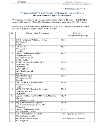 Załącznik do Zarządzenia nr 22 103/SU/2016 Kanclerza AWF z dnia 16 kwietnia 2014 Warszawa, 11.07.2016 r. WYBÓR OFERTY W ZAPYTANIU OFERTOWYM NR 103/SU/2016 Dostawa Koszulek z logo AWF Warszawa W związku z wycofaniem się z realizacji zamówienia Oferty nr 15 firmy - ZPH LULEX Janusz Lulkowski, Ul. 3 Maja 108, Skarżysko-Kamienna, ceną oferty 1955,70 zł. brutto Do realizacji zamówienia została wybrana oferta nr 1 - F.H.U. Imperator Waldemar Nowak Ul. Głuska 6, Lublin, z cena oferty 2 063,94 zł. brutto Lp. 1. 2. 3. 4. 5. 6. 7. 8. 9. 10. 11. 12. 13. Kryterium Cena (przyznane punkty) Nazwa i adres Wykonawcy F.H.U. Imperator Waldemar Nowak Ul. Głuska 6 Lublin AKART 3 s.c. Ul. Ciepła 7 Kraków Agencja 4 Reklamowa AFIRA Maja Dąbrowska Ul. Narutowicza 27/1 20-004 Lublin LOGO 5 Jacygrad, Zawadzki Sp. J. Modlińska 266, Warszawa ART. 6 STYLE Al. Piłsudskiego 44 Olsztyn PRO-Factum 7 Sp. J. Winogronowa 17, Rozalin ART.-FLOCK 8 Zygmunt Małecki Szafirowa 15/43, Lublin GIFT 9 EXPERT Mirosław Borysewicz Strąkowa 46 lok. 4 Warszawa Agencja 10 Reklamowa OPTIMA Anita MakarskaGurgacz Techniczna 4, Lublin Big 11Surprise Barbara Sygocka Al. Wojska Polskiego 25 lok. 207 Warszawa Agencja 12 Reklamowa” KJM” Ul. Młyńska 6, Leszno AKTON 13 Bogdański Warchulski Ul. Gdańska 54, Łódź GIFTKAN 14 Tomasz Kania Ul. Weigla 18 94,76 83,38 84,57 68,53 76,76 66,58 39,95 73,95 71,30 61,39 76,37 Oferta wpłynęła po terminie Oferta wpłynęła po terminie 103/SU/2016 Załącznik do Zarządzenia nr 22 Kanclerza AWF z dnia 16 kwietnia 2014 Częstochowa 14. PROWEAR 15 Tomasz Pawlak Czajków 10, Jastrzębniki 15. ZPH 16 LULEX Janusz Lulkowski Ul. 3 Maja 108 Skarżysko-Kamienna 16. Sim Koło Sp z o.o. Ul. Asnyka 35, 62-600 Koło Oferta wpłynęła po terminie 100,00 – wykonawca wycofał się z realizacji zamówienia 78,33 Ewa Bujalska Dział Promocji i Marketingu