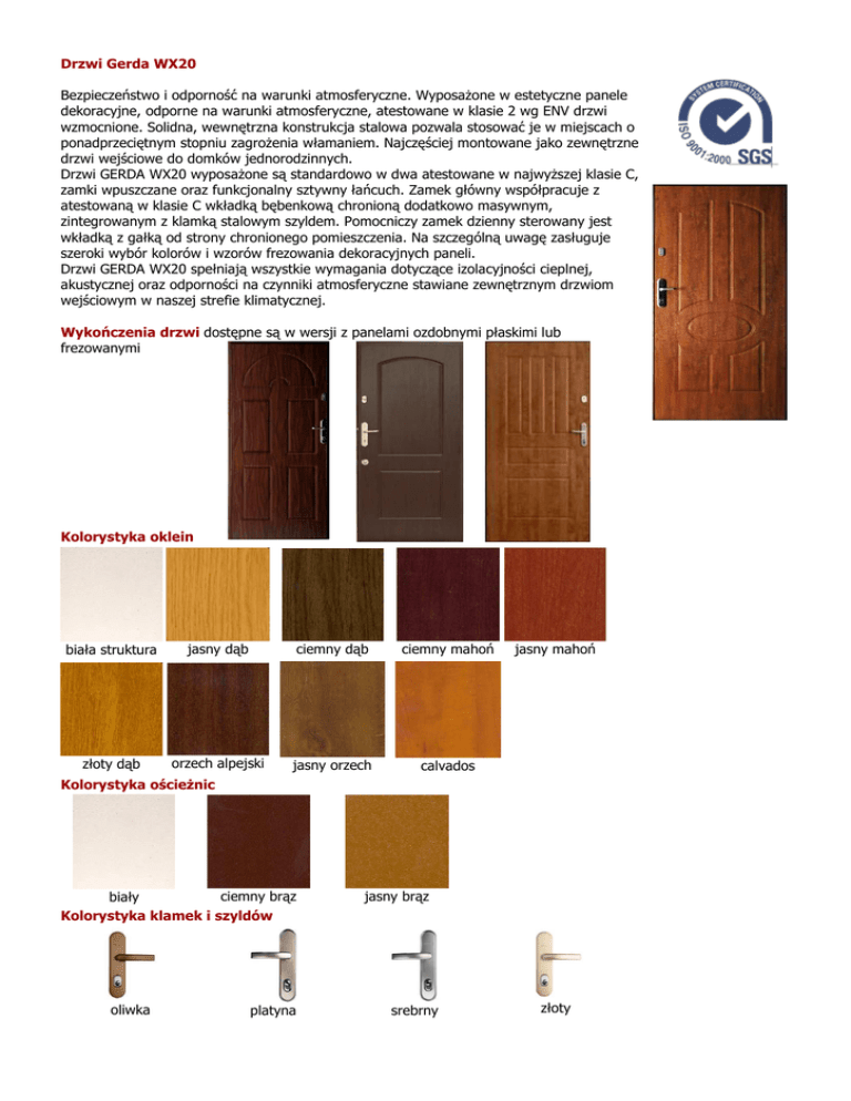 Drzwi Gerda WX20 Bezpieczeństwo i odporność na warunki atmosferyczne. WyposaŜone w estetyczne panele dekoracyjne, odporne na warunki atmosferyczne, atestowane w klasie 2 wg ENV drzwi wzmocnione. Solidna, wewnętrzna konstrukcja stalowa pozwala stosować je w miejscach o ponadprzeciętnym stopniu zagroŜenia włamaniem. Najczęściej montowane jako zewnętrzne drzwi wejściowe do domków jednorodzinnych. Drzwi GERDA WX20 wyposaŜone są standardowo w dwa atestowane w najwyŜszej klasie C, zamki wpuszczane oraz funkcjonalny sztywny łańcuch. Zamek główny współpracuje z atestowaną w klasie C wkładką bębenkową chronioną dodatkowo masywnym, zintegrowanym z klamką stalowym szyldem. Pomocniczy zamek dzienny sterowany jest wkładką z gałką od strony chronionego pomieszczenia. Na szczególną uwagę zasługuje szeroki wybór kolorów i wzorów frezowania dekoracyjnych paneli. Drzwi GERDA WX20 spełniają wszystkie wymagania dotyczące izolacyjności cieplnej, akustycznej oraz odporności na czynniki atmosferyczne stawiane zewnętrznym drzwiom wejściowym w naszej strefie klimatycznej. Wykończenia drzwi dostępne są w wersji z panelami ozdobnymi płaskimi lub frezowanymi Kolorystyka oklein biała struktura jasny dąb ciemny dąb ciemny mahoń złoty dąb orzech alpejski jasny orzech calvados jasny mahoń Kolorystyka ościeŜnic ciemny brąz biały Kolorystyka klamek i szyldów oliwka platyna jasny brąz srebrny złoty Wzory paneli ozdobnych R00 Płaskie R09 Madryt R13 Londyn R20 Olympia WyposaŜenie standardowe • Zamek główny - atestowany zamek wpuszczany Gerda ZW 1000. Certyfikat klasy C (najwyŜsza klasa odporności na włamanie); • Atestowana wkładka profilowa Gerda WK M3M umoŜliwia 107 600 kombinacji wzoru klucza co zapewnia niepowtarzalność kaŜdej z wkładek. Certyfikat klasy C; • Zespół klamek z szyldami, z ochroną wkładki TD 200 (Orient) klamka/klamka, w kolorach: platyna, srebrny, oliwka, złoty; • Zamek dodatkowy - atestowany zamek wpuszczany Gerda ZW 550 - Certyfikat klasy C; • Wkładka z gałką WK E1; • Komplet sztywnego łańcucha; • Bolce antywywaŜeniowe (3 szt.); • Zawiasy trójdzielne (3 szt.); • OścieŜnica profilowa wykonana z najwyŜszej jakości blachy stalowej 1,5 mm, laminowanej folią PVC z warstwą antyzadrapaniową; • Uszczelka przylgowa; • Wizjer panoramiczny; • Uszczelka szczotkowa (dodatkowe uszczelnienie w obrębie progu). R46 Wenecja R52 Kapitol R53 Barcelona R91 Werona WyposaŜenie dodatkowe • Próg montaŜowy z blachy ocynkowanej; • Próg drewniany z uszczelką; • Okapnik w kolorze listew mocujących panele za zaślepkami i elementami mocującymi; • OścieŜnica naroŜna; • Zespół klamek z szyldami, z ochroną wkładki TD 200 (Orient) klamka/gałka, w kolorach: platyna, srebrny, oliwka, złoty; • Zespół klamek z szyldami, z ochroną wkładki TD 1000 (Orient) klamka/klamka lub klamka/gałka, w kolorach: platyna, srebrny, oliwka, złoty; • Atestowana wkładka WK M3M w zamku dodatkowym; • Komplet dwóch atestowanych wkładek w systemie jednego klucza (WK M3M). 1. Wewnętrzny płat stalowy z blachy gr. 0,8 mm, ocynkowanej. 2. Płyta z twardego polistyrenu spienionego FS 35. 3. Wymienne panele ozdobne z płyty MDF laminowane folią dekoracyjną (płaskie i frezowane) odporna na warunki atmosferyczne. 4. Pręty ze stali hartowanej. 5. Zamek główny. 6. Zamek dodatkowy. 7. Sztywny łańcuch 8. Regulowane zawiasy. 9. Stałe bolce antywywaŜeniowe. 10. Aluminiowe listwy mocujące panele dekoracyjne. 11. Listwa zamykająca. 12. Uszczelka szczotkowa. Atesty i certyfikaty • Instytut Mechaniki Precyzyjnej (IMP) • Instytut Techniki Budowlanej (ITB) • Państwowy Zakład Higieny (PZH) sztywny łańcuch