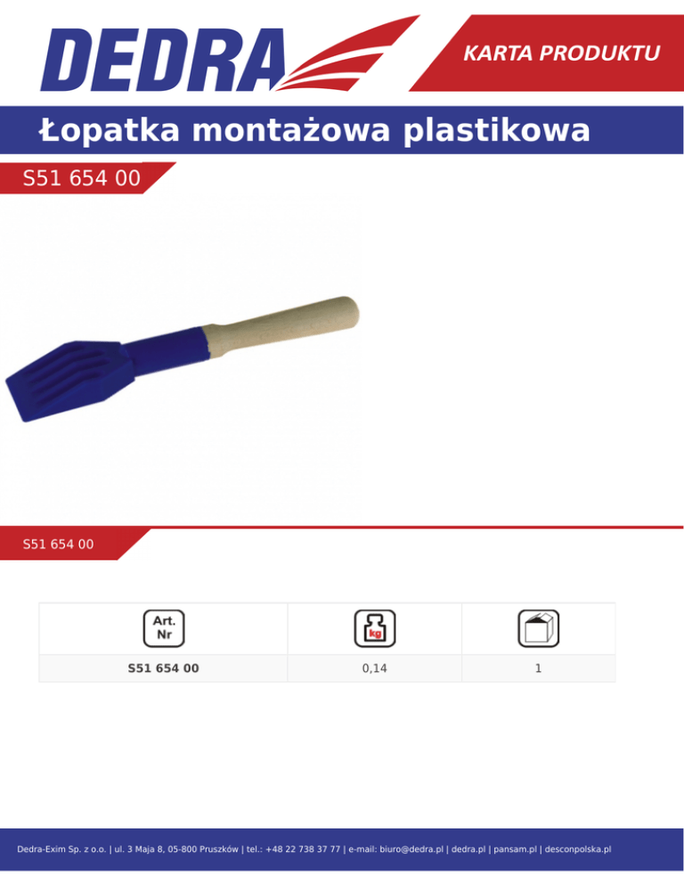 Łopatka montażowa plastikowa S51 654 00 S51 654 00 S51 654 00 0,14 1 Dedra-Exim Sp. z o.o. | ul. 3 Maja 8, 05-800 Pruszków | tel.: +48 22 738 37 77 | e-mail: [email protected] | dedra.pl | pansam.pl | desconpolska.pl