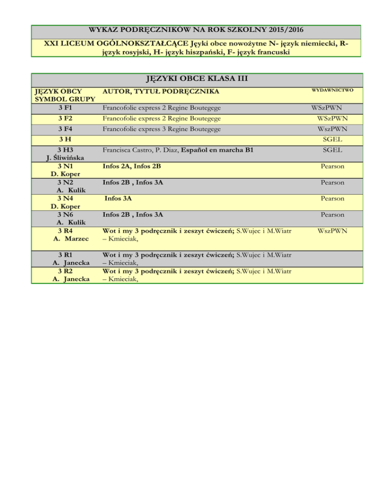 WYKAZ PODRĘCZNIKÓW NA ROK SZKOLNY 2015/2016 XXI LICEUM OGÓLNOKSZTAŁCĄCE Jęyki obce nowożytne N- język niemiecki, Rjęzyk rosyjski, H- język hiszpański, F- język francuski JĘZYKI OBCE KLASA III JĘZYK OBCY AUTOR, TYTUŁ PODRĘCZNIKA SYMBOL GRUPY 3 F1 Francofolie express 2 Regine Boutegege WYDAWNICTWO WSzPWN 3 F2 Francofolie express 2 Regine Boutegege WSzPWN 3 F4 Francofolie express 3 Regine Boutegege WszPWN 3H 3 H3 J. Śliwińska 3 N1 D. Koper 3 N2 A. Kulik 3 N4 D. Koper 3 N6 A. Kulik 3 R4 A. Marzec 3 R1 A. Janecka 3 R2 A. Janecka SGEL Francisca Castro, P. Diaz, Español en marcha B1 SGEL Infos 2A, Infos 2B Pearson Infos 2B , Infos 3A Pearson Infos 3A Pearson Infos 2B , Infos 3A Pearson Wot i my 3 podręcznik i zeszyt ćwiczeń; S.Wujec i M.Wiatr – Kmieciak, Wot i my 3 podręcznik i zeszyt ćwiczeń; S.Wujec i M.Wiatr – Kmieciak, Wot i my 3 podręcznik i zeszyt ćwiczeń; S.Wujec i M.Wiatr – Kmieciak, WszPWN