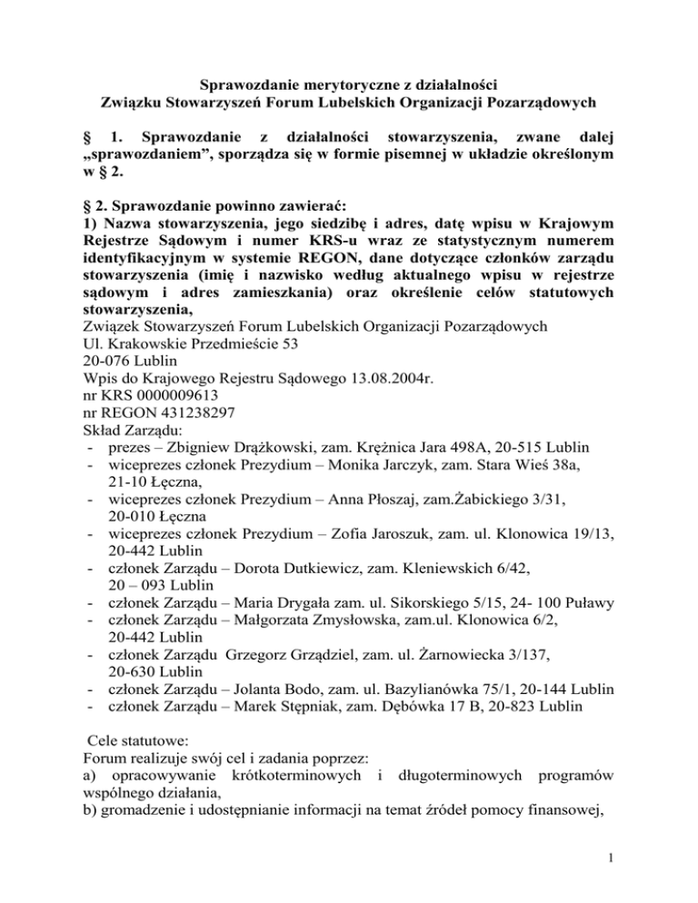 Sprawozdanie merytoryczne z działalności Związku Stowarzyszeń Forum Lubelskich Organizacji Pozarządowych § 1. Sprawozdanie z działalności stowarzyszenia, zwane dalej „sprawozdaniem”, sporządza się w formie pisemnej w układzie określonym w § 2. § 2. Sprawozdanie powinno zawierać: 1) Nazwa stowarzyszenia, jego siedzibę i adres, datę wpisu w Krajowym Rejestrze Sądowym i numer KRS-u wraz ze statystycznym numerem identyfikacyjnym w systemie REGON, dane dotyczące członków zarządu stowarzyszenia (imię i nazwisko według aktualnego wpisu w rejestrze sądowym i adres zamieszkania) oraz określenie celów statutowych stowarzyszenia, Związek Stowarzyszeń Forum Lubelskich Organizacji Pozarządowych Ul. Krakowskie Przedmieście 53 20-076 Lublin Wpis do Krajowego Rejestru Sądowego 13.08.2004r. nr KRS 0000009613 nr REGON 431238297 Skład Zarządu: - prezes – Zbigniew Drążkowski, zam. Krężnica Jara 498A, 20-515 Lublin - wiceprezes członek Prezydium – Monika Jarczyk, zam. Stara Wieś 38a, 21-10 Łęczna, - wiceprezes członek Prezydium – Anna Płoszaj, zam.Żabickiego 3/31, 20-010 Łęczna - wiceprezes członek Prezydium – Zofia Jaroszuk, zam. ul. Klonowica 19/13, 20-442 Lublin - członek Zarządu – Dorota Dutkiewicz, zam. Kleniewskich 6/42, 20 – 093 Lublin - członek Zarządu – Maria Drygała zam. ul. Sikorskiego 5/15, 24- 100 Puławy - członek Zarządu – Małgorzata Zmysłowska, zam.ul. Klonowica 6/2, 20-442 Lublin - członek Zarządu Grzegorz Grządziel, zam. ul. Żarnowiecka 3/137, 20-630 Lublin - członek Zarządu – Jolanta Bodo, zam. ul. Bazylianówka 75/1, 20-144 Lublin - członek Zarządu – Marek Stępniak, zam. Dębówka 17 B, 20-823 Lublin Cele statutowe: Forum realizuje swój cel i zadania poprzez: a) opracowywanie krótkoterminowych i długoterminowych programów wspólnego działania, b) gromadzenie i udostępnianie informacji na temat źródeł pomocy finansowej, 1 c) wymianę informacji o działalności prowadzonej przez poszczególne organizacje, d) analizę doświadczeń poszczególnych organizacji i ich rozpowszechnianie, e) wypracowywanie wspólnych stanowisk w sprawach istotnych dla Forum, f) podejmowanie i koordynowanie wspólnych działań organizacji, g) działalność wspomagająca rozwój wspólnot i społeczności lokalnych, h) działania na rzecz integracji europejskiej oraz rozwijania kontaktów i współpracy między społeczeństwami, i) promocję i organizację wolontariatu, j)działalność wspomagająca technicznie, szkoleniowo, informacyjnie lub finansowo członków Forum oraz inne organizacje pozarządowe. 2) Zasady, formy i zakres działalności statutowej z podaniem realizacji celów statutowych, a także opis głównych zdarzeń prawnych w jej działalności o skutkach finansowych, W okresie od stycznia 2005r. do 31 grudnia 2005 roku były realizowane następujące projekty: - Uzyskanie dofinansowania z Sieci SPLOT realizacja projektu „Nasza Wizja. Cykl Seminariów na temat rozwoju województwa lubelskiego w ujęciu NPR na lata 2007-2013”; Projekt był skierowany do organizacji pozarządowych, jednostek samorządu terytorialnego. Cel został osiągnięty poprzez zoorganizowanie cyklu spotkań seminaryjnych oraz wypracowanie wspólnego stanowiska organizacji pozarządowych naszego Regionu, w zakresie Narodowego Planu Rozwoju (NPR) 2007 - 2013 oraz wzmocnienie aktywnego udziału Związku Stowarzyszeń FLOP w procesach promowania i upowszechniania wiedzy o Europejskim Funduszu Społecznym wśród regionalnych instytucji woj. Lubelskiego. Kwota dofinansowania 2 000,00 PLN. Czas realizacji 01.04.2005-04.05.2005 - Uzyskanie dofinansowania przez Powiatowy Urząd Pracy w Chełmie na przeprowadzenie dwutygodniowych zajęć z tematyki Europejskiego Funduszu Społecznego pt.: „Szkolenie Trenerów EFS” Kwota dofinansowania 11 500,00 PLN Czas realizacji 21.02.2005-04.03.2005 - Uzyskanie dofinansowania i realizacja projektu „Regionalny Ośrodek Szkoleniowy Europejskiego Funduszu Społecznego – Lubelszczyzna”. Dofinansowanie ze środków programu PHARE 2002 - Rozwój umiejętności zarządzania Europejskim Funduszem Społecznym. Zorganizowane zostały szkolenia, w tym 3 dniowe pt. „Rozwój kompetencji w zarządzaniu projektami finansowanymi z Europejskiego Funduszu Społecznego” i 2 dniowe „Procedura 2 przygotowania projektów z Europejskiego Funduszu Społecznego”; świadczone były usługi doradcze przez animatorów regionalnych. Prowadzone były działania informacyjne, poradnictwo, konsultacja a głównie animacja z zakresu możliwości aplikowania o środki Europejskiego Funduszu Społecznego w województwie lubelskim. Z usługami animacji wychodziliśmy do klienta, spotykaliśmy się w siedzibach danych organizacji, omawiane były te działania do których mogą aplikować potencjalni beneficjenci. Prowadzone były województwie lubelskim 5 Punktów Konsultacyjnych (tzw. PKEFSy) m.in. w Zamościu, Chełmie, Tomaszowie Lubelskim, Biłgoraju i Świdniku. Czas realizacji 17.01.2005 – 24.11.2005r. Kwota dofinansowania 70 000,00 EUR. - Uzyskanie dofinansowania i realizcaja projektu CEI Funding of Cooperation Activities, Forum Współpracy na Rzecz Ekonomii Społecznej organizacja wiodąca Associazione di volontariato promossa da CNA V.le Duccio di Buoninsegna, Arezzo. Głównym celem projektu było wypracowanie trójstronnej współpracy zagranicznej z Ukrainą, Włochami, Polską. W listopadzie 2005 roku została zoorganizowana w ramach tego projektu międzynarodowa konferencja w Dąbrowicy koło Lublina w dniach 17-18 listopada 2005 r. z udziałem parterów z Ukrainy, Białorusi, Włoch i Polski w tym organizacji pozarządowych, przedstawicieli biznesu, przedsatwicieli jednostek samorządu terytorialnego „Ekonomia społeczna – wymiana informacji, nawiązanie międzysektorowej współpracy”. Kwota dofinansowania 74 685,12 PLN Czas realizacji 17.11.2005 – 18.11.2005r. - Uzyskanie dofinansowania