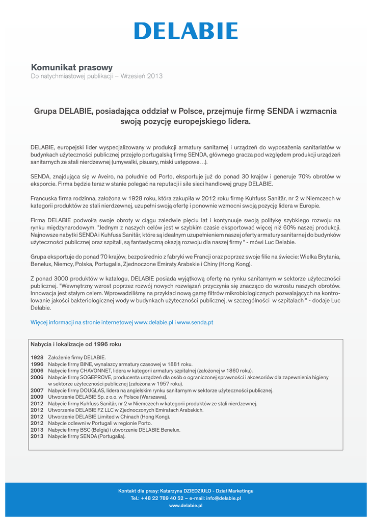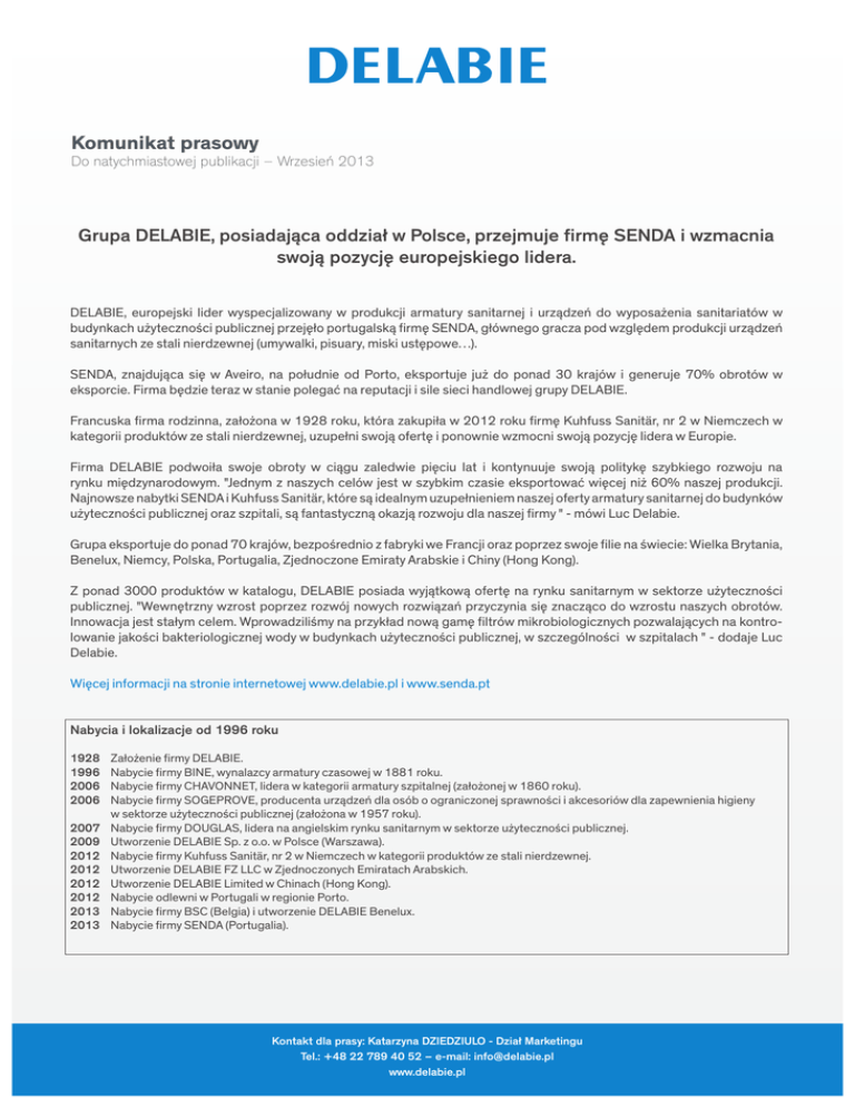 Komunikat prasowy Do natychmiastowej publikacji – Wrzesień 2013 Grupa DELABIE, posiadająca oddział w Polsce, przejmuje firmę SENDA i wzmacnia swoją pozycję europejskiego lidera. DELABIE, europejski lider wyspecjalizowany w produkcji armatury sanitarnej i urządzeń do wyposażenia sanitariatów w budynkach użyteczności publicznej przejęło portugalską firmę SENDA, głównego gracza pod względem produkcji urządzeń sanitarnych ze stali nierdzewnej (umywalki, pisuary, miski ustępowe…). SENDA, znajdująca się w Aveiro, na południe od Porto, eksportuje już do ponad 30 krajów i generuje 70% obrotów w eksporcie. Firma będzie teraz w stanie polegać na reputacji i sile sieci handlowej grupy DELABIE. Francuska firma rodzinna, założona w 1928 roku, która zakupiła w 2012 roku firmę Kuhfuss Sanitär, nr 2 w Niemczech w kategorii produktów ze stali nierdzewnej, uzupełni swoją ofertę i ponownie wzmocni swoją pozycję lidera w Europie. Firma DELABIE podwoiła swoje obroty w ciągu zaledwie pięciu lat i kontynuuje swoją politykę szybkiego rozwoju na rynku międzynarodowym. "Jednym z naszych celów jest w szybkim czasie eksportować więcej niż 60% naszej produkcji. Najnowsze nabytki SENDA i Kuhfuss Sanitär, które są idealnym uzupełnieniem naszej oferty armatury sanitarnej do budynków użyteczności publicznej oraz szpitali, są fantastyczną okazją rozwoju dla naszej firmy " - mówi Luc Delabie. Grupa eksportuje do ponad 70 krajów, bezpośrednio z fabryki we Francji oraz poprzez swoje filie na świecie: Wielka Brytania, Benelux, Niemcy, Polska, Portugalia, Zjednoczone Emiraty Arabskie i Chiny (Hong Kong). Z ponad 3000 produktów w katalogu, DELABIE posiada wyjątkową ofertę na rynku sanitarnym w sektorze użyteczności publicznej. "Wewnętrzny wzrost poprzez rozwój nowych rozwiązań przyczynia się znacząco do wzrostu naszych obrotów. Innowacja jest stałym celem. Wprowadziliśmy na przykład nową gamę filtrów mikrobiologicznych pozwalających na kontrolowanie jakości bakteriologicznej wody w budynkach użyteczności publicznej, w szczególności w szpitalach " - dodaje Luc Delabie. Więcej informacji na stronie internetowej www.delabie.pl i www.senda.pt Nabycia i lokalizacje od 1996 roku 1928 1996 2006 2006 2007 2009 2012 2012 2012 2012 2013 2013 Założenie firmy DELABIE. Nabycie firmy BINE, wynalazcy armatury czasowej w 1881 roku. Nabycie firmy CHAVONNET, lidera w kategorii armatury szpitalnej (założonej w 1860 roku). Nabycie firmy SOGEPROVE, producenta urządzeń dla osób o ograniczonej sprawności i akcesoriów dla zapewnienia higieny w sektorze użyteczności publicznej (założona w 1957 roku). Nabycie firmy DOUGLAS, lidera na angielskim rynku sanitarnym w sektorze użyteczności publicznej. Utworzenie DELABIE Sp. z o.o. w Polsce (Warszawa). Nabycie firmy Kuhfuss Sanitär, nr 2 w Niemczech w kategorii produktów ze stali nierdzewnej. Utworzenie DELABIE FZ LLC w Zjednoczonych Emiratach Arabskich. Utworzenie DELABIE Limited w Chinach (Hong Kong). Nabycie odlewni w Portugali w regionie Porto. Nabycie firmy BSC (Belgia) i utworzenie DELABIE Benelux. Nabycie firmy SENDA (Portugalia). Kontakt dla prasy: Katarzyna DZIEDZIULO - Dział Marketingu Tel.: +48 22 789 40 52 – e-mail: [email protected] www.delabie.pl Załącznik ikonograficzny Do natychmiastowej publikacji – Wrzesień 2013 1. Logo DELABIE 2. Zarząd DELABIE Od lewej do prawej : Luc Delabie, Gérard Delabie, Jean-Claude Delabie i jego syn Patrick 3. Fabryka we Friville – Francja 4. Armatura elektroniczna TEMPOMATIC 4 5. Bateria szpitalna z filtrującą głowicą BIOFIL 6. Pisuary ze stali nierdzewnej SENDA 7. Miski ustępowe ze stali nierdzewnej SENDA Kontakt dla prasy: Katarzyna DZIEDZIULO - Dział Marketingu Tel.: +48 22 789 40 52 – e-mail: [email protected] www.delabie.pl