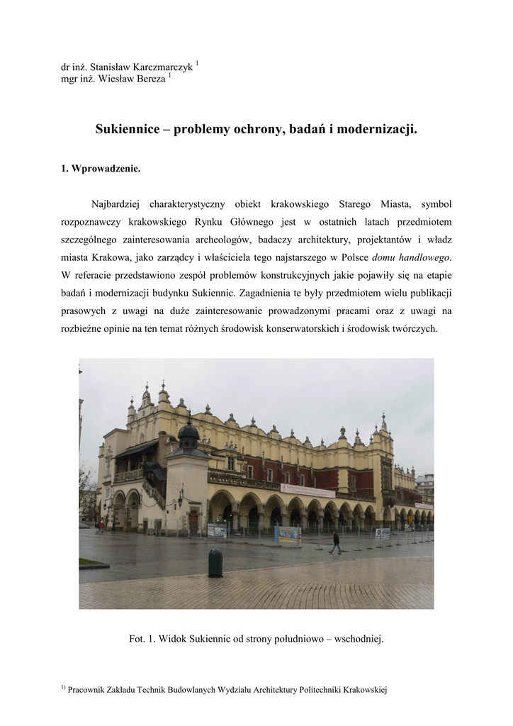 dr inŜ. Stanisław Karczmarczyk 1 mgr inŜ. Wiesław Bereza 1 Sukiennice – problemy ochrony, badań i modernizacji. 1. Wprowadzenie. Najbardziej charakterystyczny obiekt krakowskiego Starego Miasta, symbol rozpoznawczy krakowskiego Rynku Głównego jest w ostatnich latach przedmiotem szczególnego zainteresowania archeologów, badaczy architektury, projektantów i władz miasta Krakowa, jako zarządcy i właściciela tego najstarszego w Polsce domu handlowego. W referacie przedstawiono zespół problemów konstrukcyjnych jakie pojawiły się na etapie badań i modernizacji budynku Sukiennic. Zagadnienia te były przedmiotem wielu publikacji prasowych z uwagi na duŜe zainteresowanie prowadzonymi pracami oraz z uwagi na rozbieŜne opinie na ten temat róŜnych środowisk konserwatorskich i środowisk twórczych. Fot. 1. Widok Sukiennic od strony południowo – wschodniej. 1) Pracownik Zakładu Technik Budowlanych Wydziału Architektury Politechniki Krakowskiej 2 Dla przybliŜenia podstawowych cech budowlanych tego obiektu warto przypomnieć najwaŜniejsze dane z bogatej historii Sukiennic. Początek historii Sukiennic to czasy panowania Kazimierza Wielkiego, kiedy to wzniesiono najstarszą część środkowego traktu Sukiennic o szerokości 10,2 m. Górna część traktu głównego, zwieńczona attykami i maszkaronami została wzniesiona w 1556 roku po poŜarze Sukiennic. Tą fazę przebudowy Sukiennic projektował J.M Padovano. Rys. 2. Rzut Sukiennic Kolejna znacząca przebudowa miała miejsce w latach 1876-79, kiedy to po wyburzeniu zewnętrznych kramów dobudowano po obydwu zewnętrznych stronach hali głównej po dwa trakty podpiwniczone w całym obrysie dobudowanych części. Ta bardzo znacząca przebudowa została zrealizowana według projektu T. Prylińskiego. Dobudowane trakty sklepowe mają szerokość od 5,7m do 6,05m zaś trakty podcieni mają głębokość od 3,16m do 3,40m. Od czasu tej przebudowy znany powszechnie obraz Sukiennic nie uległ zmianie. Obecnie jest to dwukondygnacyjny, częściowo podpiwniczony budynek o wymiarach prostokątnego rzutu 111,20 x 35,20m. Budynek nie posiada na tej długości Ŝadnej dylatacji. Na początku XX stulecia w okresie prezydentury Leo rozbudowano podziemną część Sukiennic, dobudowując przy południowej i przy północnej ścianie szczytowej publiczne podziemne ustępy. Późniejsze remonty obejmowały przebudowę stropów przekrywających halę główną i ryzality. W hali głównej wprowadzono wówczas dźwigary strunobetonowe o przekroju dwuteowym i wysokości 65cm rozmieszczone w rytmie co 1,30 m. Między dźwigarami wykonano sklepienia odcinkowe z cegły. Stropy w skrajnych ryzalitach 3 Sukiennic przebudowano jako monolityczne Ŝelbetowe. Na stan techniczny Sukiennic miała istotny wpływ budowa stacji trafo przy północno – zachodnim naroŜniku. Budowa stacji trafo w latach 70-tych XX stulecia wiązała się z głębokimi wykopami w bezpośrednim sąsiedztwie fundamentów arkad sięgającymi 1,67m poniŜej poziomu posadowienia wykusza Sukiennic i odpowiednio 0,44m poniŜej posadowienia arkad. Hala główna obecnych Sukiennic, budowana za czasów Kazimierza Wielkiego, wznoszona była w miejscu, gdzie wcześniej miała miejsce intensywna zabudowa przedlokacyjna. Stąd teŜ część fundamentów gotyckiej części Sukiennic posadowiono juŜ na nasypach kulturowych, czego skutki ujawniają się do czasów współczesnych. 2. Zakres badań archeologicznych i architektonicznych realizowanych w latach 20042006 i ich wpływ na bezpieczeństwo Sukiennic. Pierwsze badania rozpoznawcze przeprowadzono w 2003 roku we wschodniej części płyty Rynku Głównego. Program badań archeologicznych obejmował północny odcinek zachodniego traktu Kramów Bogatych i Wagę Wielką usytuowaną przy południowo – wschodnim naroŜniku Sukiennic. JuŜ wtedy w mediach podnoszono problem bezpieczeństwa Sukiennic, poniewaŜ zauwaŜono zarysowanie arkad Sukiennic w naroŜniku północnowschodnim. Zarysowanie to istniało od co najmniej kilku lat, ale prowadzone prace spowodowały nakierowanie zainteresowania na ten fragment budynku. Fot. 3. Skala prac archeologicznych – prace w części Wielkiej i Małej Wagi 4 Kolejne badania połączone z odsłanianiem ścian fundamentowych Sukiennic przeprowadzono w 2004 roku w zachodniej części Rynku Głównego. Badania te poprzedzały wykonanie nowej nawierzchni w tej części płyty Rynku Głównego. Bezpośredni wpływ na warunki posadowienia zachodniej ściany Sukiennic z ciągiem kolumn miał wykop wzdłuŜ zachodniej ściany dla celów związanych z budową kanału zbiorczego instalacji. Głębokość wykopu uwzględniała poziom posadowienia fundamentów pod ciągiem kolumn arkad. Największą skalę badań i związanych z nimi wykopów zrealizowano we wschodniej części płyty Rynku Głównego. Skala tych badań obejmowała cały odcinek wschodniej, zewnętrznej, podłuŜnej ściany Sukiennic oraz ściany szczytowe – północną i południową. Skala eksploracji archeologicznej powodowała, Ŝe lokalnie osiągano głębokość wykopów poniŜej poziomu posadowienia Sukiennic. Relacje poziomu wykopów w stosunku do poziomu posadowienia były na bieŜąco kontrolowane i na bieŜąco podejmowano rozwiązania uwzględniające bezpieczeństwo Sukiennic. Fot. 4. Zakres prac archeologicznych w rejonie wschodniej części Rynku Głównego w Krakowie. Odcinki przegłębień realizowano na zasadach identycznych jak podbijanie fundamentów. W pewnym etapie badań odsłonięcia zewnętrznych ścian Sukiennic 5 obejmowało cały obwód północny, wschodni i południowy. Zniknęły zatem siły biernego parcia gruntu na ściany piwnic. Ten stan został oceniony przez zespół projektu konstrukcyjnego jako potencjalnie niebezpieczny dla budynku Sukiennic. Przyczyną zagroŜenia był brak stabilizującego parcia nasypu na ściany piwnic. Odsłonięcie ścian piwnic nastąpiło w okresie jesienno – zimowym 20