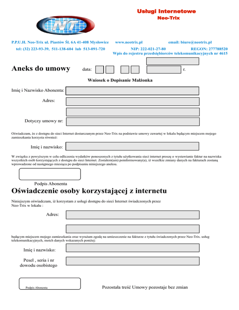 Usługi Internetowe Neo-Trix P.P.U.H. Neo-Trix ul. Piastów Śl. 6A 41-408 Mysłowice tel: (32) 223-93-39, 511-138-604 lub 513-091-720 Aneks do umowy www.neotrix.pl email: [email protected] NIP: 222-021-27-80 REGON: 277788520 Wpis do rejestru przedsiębiorców telekomunikacyjnych nr 4615 data: r. Wniosek o Dopisanie Małżonka Imię i Nazwisko Abonenta: Adres: Dotyczy umowy nr: Oświadczam, że z dostępu do sieci Internet dostarczanym przez Neo-Trix na podstawie umowy zawartej w lokalu będącym miejscem mojego zamieszkania korzysta również: Imię i nazwisko: W związku z powyższym w celu odliczenia wydatków ponoszonych z tytułu użytkowania sieci internet proszę o wystawianie faktur na nazwiska wszystkich osób korzystających z dostępu do sieci Internet. Zostałem(am) poinformowany(a), iż wszelkie zmiany danych na fakturach zostaną wprowadzone od następnego miesiąca po podpisaniu niniejszego aneksu. Podpis Abonenta Oświadczenie osoby korzystającej z internetu Niniejszym oświadczam, iż korzystam z usługi dostępu do sieci Internet świadczonych przez Neo-Trix w lokalu : Adres: będącym miejscem mojego zamieszkania oraz wyrażam zgodę na umieszczenie na fakturze z tytułu świadczonych przez Neo-Trix. usług telekomunikacyjnych, moich danych wskazanych poniżej: Imię i nazwisko: Pesel , seria i nr dowodu osobistego Podpis Abonenta Pozostała treść Umowy pozostaje bez zmian