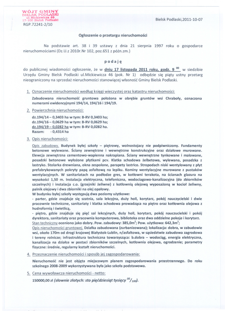 -WÓJT ---- -- (JMIN~ BlELSK pODLASKI ul. Mickiewicza 46 17 -100 Blelsk Podlaski Bielsk Podlaski,2011-1O-07 RGP.72241-2j10 Ogloszenie o przetargu nieruchomosci Na podstawie art. 38 i 39 ustawy z dnia 21 sierpnia 1997 roku o gospodarce nieruchomosciami (Dz.U.z2010r.Nr 102, poz.651 z pózn.zm.) podaje do publicznej wiadomosci ogloszenie, ze w dniu 17 listoDada 2011 roku. Rodz. 9 00 w siedzibie Urzedu Gminy Bielsk Podlaski ul.Mickiewicza 46 (pok. Nr 1) odbedzie sie piaty ustny przetarg nieograniczony na sprzedaz nieruchomosci stanowiacej wlasnosc Gminy Bielsk Podlaski. 1:. Oznaczenie nieruchomosci wedlug ksiegiwieczystei oraz katastru nieruchomosci: Zabudowana nieruchomosc gruntowa polozona w obrebie gruntów wsi Chraboly, oznaczona numerami ewidencyjnymi 194/14, 194/16 i 194/19. 2. Powierzchnia nieruchomosci: dz.194/14 - 0,3403 ha w tym: B-RV0,3403 ha; dz.194/16 - 0,0629 ha w tym: B-RV0,0629 ha; dz.194/19 - 0.0282 ha w tym: B-RV0,0282 ha. Razam: - 0,4314 ha 3. Opis nieruchomosci: Opis zabudowy. Budynek bylej szkoly - pietrowy, wolnostojacy nie podpiwniczony. Fundamenty betonowe wylewane. Sciany zewnetrzne i wewnetrzne konstrukcyjne oraz dzialowe murowane. Elewcja zewnetrzna cementowo-wapienna nakrapiana. Sciany wewnetrzne tynkowane i malowane, posadzki betonowe wylozone plytkami pcv. Klatka schodowa zelbetowa, wylewana, posadzka z lastryko. Stolarka drewniana, okna zespolone, parapety lastrico. Stropodach niski wentylowany z plyt prefabrykowanych pokryty papa asfaltowa na lepiku. Kominy wentylacyjne murowane z pustaków wentylacyjnych. W sanitariatach na podlodze gres, w kotlowni terakota, na scianach glazura na wysokosci 1,50 m. Instalacja elektryczna, telefoniczna, wodociagowo-kanalizacyjna (do zbiorników szczelnych) i instalacja c.o. (grzejniki zeliwne) z kotlownia olejowa wyposazona w kociol zeliwny, palnik olejowy i dwa zbiorniki na olej opalowy. W budynku bylej szkoly wystepuja dwa poziomy uzytkowe: parter, gdzie znajduje sie szatnia, sala lekcyjna, duzy holi, korytarz, pokój nauczycielski i dwie pracownie techniczne, sanitariaty i klatka schodowa prowadzaca na pietro oraz kotlownia olejowa z hudrofornia i swietlica, pietro, gdzie znajduje sie piec sal lekcyjnych, duzy holi, korytarz, pokój nauczucielski i pokój dyrektora, sanitariaty oraz pracownia komputerowa, biblioteka oraz dwa oddzielne pokoje i korytarz. Stan techniczny oceniono jako dobry. Pow. zabudowy: 385,Om2;Pow. uzytkowa: 642,3m2; Opis nieruchomosci gruntowei. Dzialkazabudowana (zurbanizowana); lokalizacja: dobra, w zabudowie wsi, okolo 170m od drogi krajowej Bialystok-Lublin,n/asfaltowa, w sasiedztwie zabudowa zagrodowa i tereny rolnicze; infrastruktura techniczna towarzyszaca: b.dobra wodociag, energia elektryczna, kanalizacja na dzialce w postaci zbiorników szczelnych, kotlownia olejowa, ogrodzenie; parametry fizyczne: srednie, regularny ksztalt nieruchomosci. - - 4. Przeznaczenie nieruchomosci i sposób iei zagospodarowania: Nieruchomosc nie jest objeta miejscowym planem zagospodarowania przestrzennego. Do roku szkolnego2008-2009wykorzystywanabylajako szkolapodstawowa. 5. Cena wywolawcza nieruchomosci - netto: 150000,00 zl (slownie zlotych: sto piecdziesiqt tysiecy OD/JOD). - - - --- -- -- Term iny przeprowadzen ia: przetargów zakonczonychwynikaminegatywnymi ustalone byly na: pierwszy - 11 czerwca 2010 roku godz. gOO,drugi -10 sierpnia 2010 roku godz. gOO,trzeci - 16 listopada 2010 roku godz. gOO,czwarty - 05 kwietnia 2011 roku godz. gOo. rokowan (brak zgloszen udzialu) ustalone byly na 22 czerwca 2011 roku. Ostateczna cena zostanie ustalona w przetargu z tym, ze sprzedaz nieruchomosci zwolniona jest z podatku VAT. Warunkiem przystapienia do przetargu jest: wniesienie wadium w wysokosci 15000,00 zl (slownie zlotych: pietnascie tysiecy °°/100)w terminie do dnia 14 listopada 2011 roku w kasie tut. urzedu do godz.14°° lub na konto Urzedu Gminy BielskPodlaski ul.Mickiewicza46 w Banku Spóldzielczymw Bransku O/BielskPodlaskinr 32 8063 0001 00100706 2138 0006 (liczysie data wlywu srodków na konto urzedu), przedlozenie komisji przetargowej przed otwarciem przetargu dowodu wniesienia wadium, okazanie przewodniczacemu komisji, przed otwarciem przetargu, dokumentu tozsamosci ze zdjeciem w celu ustalenia zgodnosci danych osobowych przystepujacego do przetargu i wplacajacego wadium, pelnomocnicy wystepujacy w imieniu innych musza okazac przewodniczacemu komisji, przed otwarciem przetargu, pelnomocnictwio udzielone w formie notarialnej, w celu dolaczenia do akt. Wadium zostanie niezwlocznie zwrócone osobom, które przystapia do przetargu, ale go nie wygraja. Osobie, która przetarg wygra - wadium zostanie zaliczone w poczet ceny sprzedazy. Wadium nie podlega zwrotowi w razie uchylenia sie uczestnika, który wygral przetarg od zawarcia umowy. Termin uiszczenia kwoty za nieruchomosc uplywa najpózniej w dniu zawarcia umowy. Postapienie nie moze wynosic mniej niz 1% ceny wywolawczej, z zaokragleniem w góre do pelnych dziesiatek zlotych. Przetarg jest wazny bez wzgledu na liczbe uczestników, jezeli choc jeden uczestnik zaoferuje cene wyzsza od ceny wywolawczej. Zastrzega sie prawo uniewaznienia przetargu. Dodatkowe informacje dotyczace przetargu mozna uzyskac w Urzedzie Gminy Bielsk Podlaski, ul.Mickiewicza46, pokój nr l, e-mail: [email protected]. tel.:85 7304532 w godzinach pracy urzedu - osoba odpowiedzialna, LeonMajstrowicz. Ogloszenie o przetargu wywieszone zostanie na tablicy ogloszen w lokalu Urzedu Gminy Bielsk Podlaski oraz w miejscowosci polozenia gruntów, opublikowane na stronie internetowej Urzedu Gminy BielskPodlaski-"BlP"i prasie. ~~T.i ( ~~