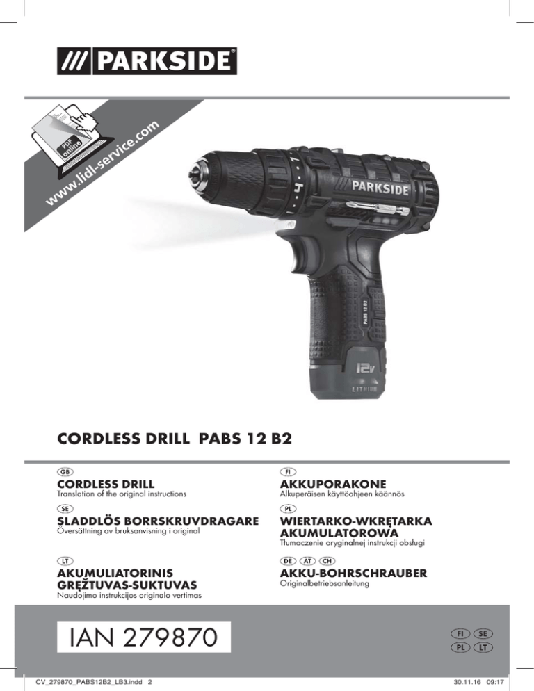 CORDLESS DRILL PABS 12 B2 CORDLESS DRILL AKKUPORAKONE Translation of the original instructions Alkuperäisen käyttöohjeen käännös SLADDLÖS BORRSKRUVDRAGARE WIERTARKO-WKRĘTARKA AKUMULATOROWA Översättning av bruksanvisning i original Tłumaczenie oryginalnej instrukcji obsługi AKUMULIATORINIS GRĘŽTUVAS-SUKTUVAS AKKU-BOHRSCHRAUBER Originalbetriebsanleitung Naudojimo instrukcijos originalo vertimas IAN 279870 CV_279870_PABS12B2_LB3.indd 2 30.11.16 09:17 Before reading, unfold the page containing the illustrations and familiarise yourself with all functions of the device. Käännä ennen lukemista kuvallinen sivu esiin ja tutustu seuraavaksi laitteen kaikkiin toimintoihin. Vik ut bildsidan och ha den till hands när du läser igenom anvisningarna och gör dig bekant med apparatens / maskinens funktioner. Przed przeczytaniem proszę rozłożyć stronę z ilustracjami, a następnie proszę zapoznać się z wszystkimi funkcjami urządzenia. Prieš skaitydami atsiverskite lapą su paveikslėliais ir susipažinkite su visomis prietaiso funkcijomis. Klappen Sie vor dem Lesen die Seite mit den Abbildungen aus und machen Sie sich anschließend mit allen Funktionen des Gerätes vertraut. GB FI SE PL LT DE / AT / CH Translation of the original instructions Alkuperäisen käyttöohjeen käännös Översättning av bruksanvisning i original Tłumaczenie oryginalnej instrukcji obsługi Naudojimo instrukcijos originalo vertimas Originalbetriebsanleitung CV_279870_PABS12B2_LB3.indd 3 Page Sivu Sidan Strona Seite Seite 1 13 25 37 49 61 30.11.16 09:17 CV_279870_PABS12B2_LB3.indd 4 30.11.16 09:17 Contents Introduction . . . . . . . . . . . . . . . . . . . . . . . . . . . . . . . . . . . . . . . . . . . . . . . . . . . . . . 2 Intended use . . . . . . . . . . . . . . . . . . . . . . . . . . . . . . . . . . . . . . . . . . . . . . . . . . . . . . . . . . . . . . . . 2 Features . . . . . . . . . . . . . . . . . . . . . . . . . . . . . . . . . . . . . . . . . . . . . . . . . . . . . . . . . . . . . . . . . . . 2 Package contents . . . . . . . . . . . . . . . . . . . . . . . . . . . . . . . . . . . . . . . . . . . . . . . . . . . . . . . . . . . . 2 Technical details . . . . . . . . . . . . . . . . . . . . . . . . . . . . . . . . . . . . . . . . . . . . . . . . . . . . . . . . . . . . . 2 General Power Tool Safety Warnings . . . . . . . . . . . . . . . . . . . . . . . . . . . . . . . . 3 1. Work area safety . . . . . . . . . . . . . . . . . . . . . . . . . . . . . . . . . . . . . . . . . . . . . . . . . . . . . . . . . . 3 2. Electrical safety . . . . . . . . . . . . . . . . . . . . . . . . . . . . . . . . . . . . . . . . . . . . . . . . . . . . . . . . . . . 4 3. Personal safety . . . . . . . . . . . . . . . . . . . . . . . . . . . . . . . . . . . . . . . . . . . . . . . . . . . . . . . . . . . . 4 4. Power tool use and care . . . . . . . . . . . . . . . . . . . . . . . . . . . . . . . . . . . . . . . . . . . . . . . . . . . . 5 5. Use and handling of the cordless electrical power tool . . . . . . . . . . . . . . . . . . . . . . . . . . . . . 5 6. Service . . . . . . . . . . . . . . . . . . . . . . . . . . . . . . . . . . . . . . . . . . . . . . . . . . . . . . . . . . . . . . . . . . 5 Safety guidelines for cordless drill . . . . . . . . . . . . . . . . . . . . . . . . . . . . . . . . . . . . . . . . . . . . . . . 6 Safety guidelines for battery chargers . . . . . . . . . . . . . . . . . . . . . . . . . . . . . . . . . . . . . . . . . . . . 6 Before use . . . . . . . . . . . . . . . . . . . . . . . . . . . . . . . . . . . . . . . . . . . . . . . . . . . . . . . 6 Removing/charging/inserting the battery pack . . . . . . . . . . . . . . . . . . . . . . . . . . . . . . . . . . . . . 6 Checking the battery charge level . . . . . . . . . . . . . . . . . . . . . . . . . . . . . . . . . . . . . . . . . . . . . . . 6 Changing tools . . . . . . . . . . . . . . . . . . . . . . . . . . . . . . . . . . . . . . . . . . . . . . . . . . . . . . . . . . . . . . 7 2 speed gearbox . . . . . . . . . . . . . . . . . . . . . . . . . . . . . . . . . . . . . . . . . . . . . . . . . . . . . . . . . . . . 7 Torque selection ring/drill setting . . . . . . . . . . . . . . . . . . . . . . . . . . . . . . . . . . . . . . . . . . . . . . . . 7 Operation . . . . . . . . . . . . . . . . . . . . . . . . . . . . . . . . . . . . . . . . . . . . . . . . . . . . . . . 7 Change direction of rotation/unlock appliance . . . . . . . . . . . . . . . . . . . . . . . . . . . . . . . . . . . . . 7 Switching on and off . . . . . . . . . . . . . . . . . . . . . . . . . . . . . . . . . . . . . . . . . . . . . . . . . . . . . . . . . 7 Adjusting the rotational speed . . . . . . . . . . . . . . . . . . . . . . . . . . . . . . . . . . . . . . . . . . . . . . . . . . 7 Activate lock . . . . . . . . . . . . . . . . . . . . . . . . . . . . . . . . . . . . . . . . . . . . . . . . . . . . . . . . . . . . . . . . 7 Tips and tricks . . . . . . . . . . . . . . . . . . . . . . . . . . . . . . . . . . . . . . . . . . . . . . . . . . . . . . . . . . . . . . . 8 Maintenance and cleaning. . . . . . . . . . . . . . . . . . . . . . . . . . . . . . . . . . . . . . . . . . 8 Kompernass Handels GmbH warranty . . . . . . . . . . . . . . . . . . . . . . . . . . . . . . . 9 Service . . . . . . . . . . . . . . . . . . . . . . . . . . . . . . . . . . . . . . . . . . . . . . . . . . . . . . . . . 10 Importer . . . . . . . . . . . . . . . . . . . . . . . . . . . . . . . . . . . . . . . . . . . . . . . . . . . . . . . 10 Disposal . . . . . . . . . . . . . . . . . . . . . . . . . . . . . . . . . . . . . . . . . . . . . . . . . . . . . . . . 11 Translation of the original Conformity Declaration . . . . . . . . . . . . . . . . . . . . . 11 PABS 12 B2 IB_279870_PABS12B2_LB3.indb 1 GB│ 1 ■ 09.08.16 16:01 CORDLESS DRILL PABS 12 B2 Introduction Congratulations on the purchase of your new appliance. You have selected a high-quality product. The operating instructions are part of t