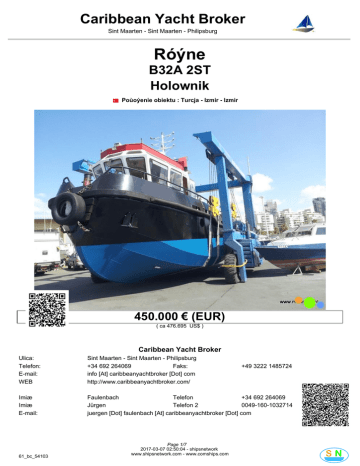 Caribbean Yacht Broker Sint Maarten - Sint Maarten - Philipsburg Róýne B32A 2ST Holownik Poùoýenie obiektu : Turcja - Izmir - Izmir 450.000 € (EUR) ( ca 476.695 US$ ) Caribbean Yacht Broker Ulica: Telefon: E-mail: WEB Sint Maarten - Sint Maarten - Philipsburg +34 692 264069 Faks: info [At] caribbeanyachtbroker [Dot] com http://www.caribbeanyachtbroker.com/ Imiæ Imiæ E-mail: Faulenbach Telefon +34 692 264069 Jürgen Telefon 2 0049-160-1032714 juergen [Dot] faulenbach [At] caribbeanyachtbroker [Dot] com 61_bc_54103 Page 1/7 2017-03-07 02:50:04 - shipsnetwork www.shipsnetwork.com - www.comships.com +49 3222 1485724 Caribbean Yacht Broker Sint Maarten - Sint Maarten - Philipsburg Typ ùodzi Numer kodu Model Producent: Stan Zgùoú Materiaù Rok suchego doku Dùugoúã LOA Dùugoúã LWL Wysokoúã pomieszczeñ Waga DWT Waga BRT 61_bc_54103 Róýne (B32A 2ST) Holownik Panama Stal 2011 14,90 m ( 48,9 ft ) Numer kodu Ksztaùt kadùuba Naprawianych roku Kolor Szerokoúã Szkic Wolna burta Waga Tdwat Waga NRT Jednokadùubowy czarny 5,10 m ( 16,7 ft ) 1,60 m ( 5,2 ft ) 48,5 to ( 106.924 lbs ) Dane na temat silnika - Napædy Silnik gùówny Prowadziã Wydajnoúã Rok Propeller Silnik gùówny Prowadziã Wydajnoúã Rok Propeller Generator Prowadziã Wydajnoúã Rok Propeller Proste SCANIA Model Paliwo: 359,0 HP( 268 KW ) Godziny otwarcia SCANIA Model Paliwo: 359,0 HP( 268 KW ) Godziny otwarcia Cummins – Perkins Model Paliwo: 25,0 KW Godziny otwarcia 9 kt Prædkoúã maksymalna Tankdaten Iloúã paliwa zbiornik balastowy Woda Kanalizacja 61_bc_54103 DI12 59 M 10 45J 4.000 L( 1.057 Gal ) 21.000 L( 5.548 Gal ) Page 2/7 2017-03-07 02:50:04 - shipsnetwork www.shipsnetwork.com - www.comships.com DI12 59 M 10 45J Caribbean Yacht Broker Sint Maarten - Sint Maarten - Philipsburg Sprzæt Okræty Instruments Zaloguj Compass GPS Anemometr Scoreboard Sonar Radar Ploter NavText Fax Pogoda VHF Radio SSB Pactor El Autopilot Wiatr Kontroli Fishfinder AIS Komputer Wyposaýenie techniczne Odtwarzacz CD Radio Telewizja Ùàcznoúã satelitarna Systemu 12 V DC Systemu 24 V DC Ùadowarka Solar Cells Wiatr Generator Wave Generator Generator 110-220 V Invertor 110-220 V Moc Shore Ogrzewanie Klimatyzacja Druckwasseranlage Systemu ciepùej wody Gazowniæ Watermaker Ster strumieniowy Divecompressor Bilgepump elektrycznie Bilgepump Maunel 61_bc_54103 Urzadzenie & podzial Kabiny Koje Toalety Zùy Wùaúciciele kabiny Spiýarnia Zatopiã Kuchenka gazowa Kuchenka elektryczna Piec Benzyna Piekarnik gazowy Piekarnik Elektryczny Lodówka Zamraýarka Kuchenka mikrofalowa Zmywarka Pralnia Bezpieczeñstwo Kamizelki ratunkowe Liferaft EPRIB Szperacze System Gaúnice Page 3/7 2017-03-07 02:50:04 - shipsnetwork www.shipsnetwork.com - www.comships.com Boat Equipment 2 Anchor Winda kotwiczna Teak Kàpieliska Ladder Prysznic rufowy Rack Equipment Trap Daivits Davit Ùódki Ùódki m. AB Bukszpryt Trim Tabs Wyposaýenie wnætrz Flybridge 2. Helm na lot Boat Trailer Inne dodatki Szyber dach Hafenpersenning Latajàcy most Ganzpersenning Cieñ niedz Fly Markiza na rufie pokùad Bimini Sprayhood Caribbean Yacht Broker Sint Maarten - Sint Maarten - Philipsburg 61_bc_54103 Page 4/7 2017-03-07 02:50:04 - shipsnetwork www.shipsnetwork.com - www.comships.com Caribbean Yacht Broker Sint Maarten - Sint Maarten - Philipsburg MPP Tug/Workboat MPP Tug/Workboat 61_bc_54103 Page 5/7 2017-03-07 02:50:04 - shipsnetwork www.shipsnetwork.com - www.comships.com Caribbean Yacht Broker Sint Maarten - Sint Maarten - Philipsburg MPP Tug/Workboat MPP Tug/Workboat 61_bc_54103 Page 6/7 2017-03-07 02:50:04 - shipsnetwork www.shipsnetwork.com - www.comships.com Caribbean Yacht Broker Sint Maarten - Sint Maarten - Philipsburg MPP Tug/Workboat 61_bc_54103 Page 7/7 2017-03-07 02:50:04 - shipsnetwork www.shipsnetwork.com - www.comships.com