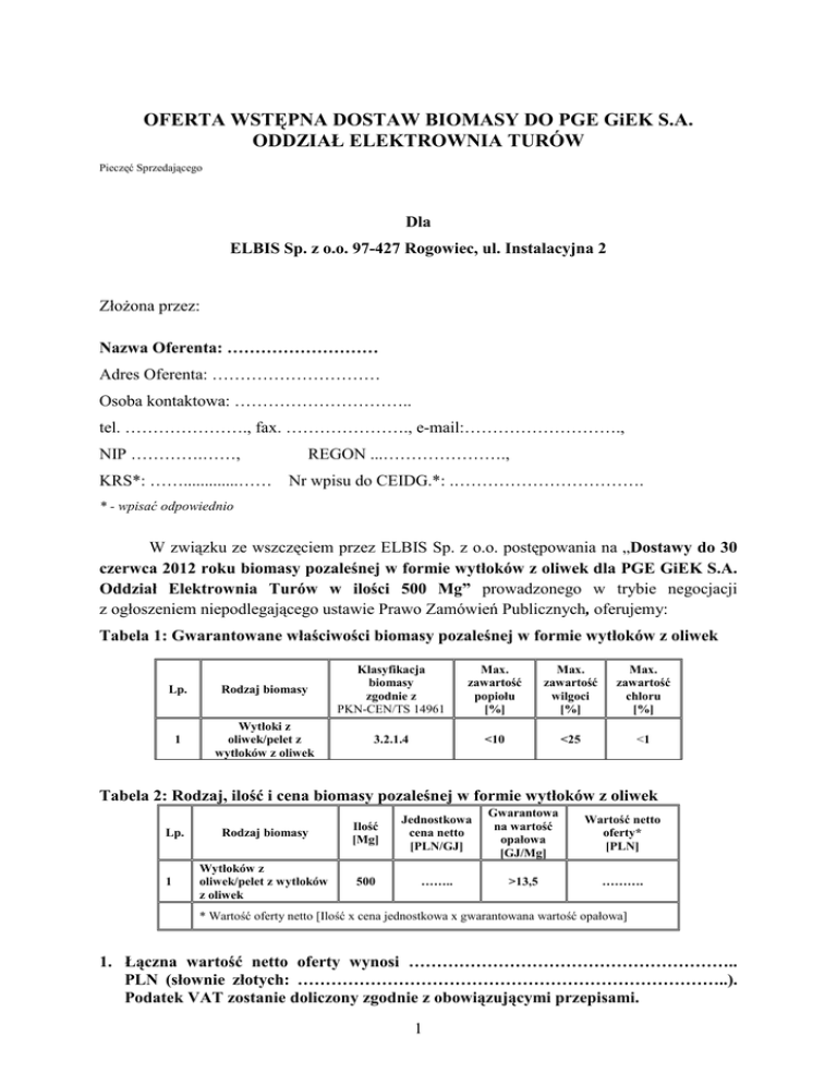 OFERTA WSTĘPNA DOSTAW BIOMASY DO PGE GiEK S.A. ODDZIAŁ ELEKTROWNIA TURÓW Pieczęć Sprzedającego Dla ELBIS Sp. z o.o. 97-427 Rogowiec, ul. Instalacyjna 2 Złożona przez: Nazwa Oferenta: ……………………… Adres Oferenta: ………………………… Osoba kontaktowa: ………………………….. tel. …………………., fax. …………………., e-mail:………………………., NIP ………….……, REGON ...…………………., KRS*: …….............…… Nr wpisu do CEIDG.*: .……………………………. * - wpisać odpowiednio W związku ze wszczęciem przez ELBIS Sp. z o.o. postępowania na „Dostawy do 30 czerwca 2012 roku biomasy pozaleśnej w formie wytłoków z oliwek dla PGE GiEK S.A. Oddział Elektrownia Turów w ilości 500 Mg” prowadzonego w trybie negocjacji z ogłoszeniem niepodlegającego ustawie Prawo Zamówień Publicznych, oferujemy: Tabela 1: Gwarantowane właściwości biomasy pozaleśnej w formie wytłoków z oliwek Lp. Rodzaj biomasy Klasyfikacja biomasy zgodnie z PKN-CEN/TS 14961 1 Wytłoki z oliwek/pelet z wytłoków z oliwek 3.2.1.4 Max. zawartość popiołu [%] Max. zawartość wilgoci [%] Max. zawartość chloru [%] <10 <25 <1 Tabela 2: Rodzaj, ilość i cena biomasy pozaleśnej w formie wytłoków z oliwek Lp. 1 Rodzaj biomasy Ilość [Mg] Jednostkowa cena netto [PLN/GJ] Gwarantowa na wartość opałowa [GJ/Mg] Wartość netto oferty* [PLN] Wytłoków z oliwek/pelet z wytłoków z oliwek 500 …….. >13,5 ………. * Wartość oferty netto [Ilość x cena jednostkowa x gwarantowana wartość opałowa] 1. Łączna wartość netto oferty wynosi ………………………………………………….. PLN (słownie złotych: …………………………………………………………………..). Podatek VAT zostanie doliczony zgodnie z obowiązującymi przepisami. 1 2. Oświadczamy, że oferowana przez nas biomasa zgodnie z Częścią F Załącznika nr 1 do Rozporządzenia Ministra Środowiska z dnia 12 stycznia 2006 (Dz.U.2006.16.124, z późn. zm.) zaliczana jest do czystej biomasy neutralnej pod względem CO2, a w związku z tym energia elektryczna lub cieplna wytworzona w wyniku jej spalania zostanie zaliczona do energii wytworzonej w odnawialnym źródle energii zgodnie z Rozporządzeniem Ministra Środowiska z dnia 14 sierpnia 2008 r. (Dz.U.2008.156.969), z późn. zm.). 3. Oświadczamy, że dostarczana do Miejsca Dostawy biomasa: a) nie będzie wytwarzana z odpadów drewna, które mogą zawierać związki fluorowcoorganiczne lub metale ciężkie, jako wynik obróbki środkami do konserwacji drewna lub powlekania, w skład których wchodzą w szczególności odpady drewna pochodzącego z budownictwa i odpady z rozbiórki, tj. spełnia wymogi §2 pkt.1 lit. e Rozporządzenia Ministra Środowiska z 22 kwietnia 2011 roku, w sprawie standardów emisyjnych z instalacji (Dz.U.2011r. Nr 95, poz. 558), b) nie będzie zanieczyszczona frakcjami torfowymi i uwęglonymi skamieniałościami materiałów pochodzenia biomasowego (zgodnie z Załącznikiem nr 1 do Rozporządzenia Ministra Środowiska z dnia 12 stycznia 2006 r. – Dz.U.2006.16.124, z późn. zm.), c) nie będzie zawierać frakcji pochodzących z drewna twardego – dębu i buku (Rozporządzenie Ministra Zdrowia z dnia 01 grudnia 2004 r. w sprawie substancji, preparatów, czynników lub procesów technologicznych o działaniu rakotwórczym lub mutagennym w środowisku pracy - Dz.U.2004.280.2771), d) nie będzie zawierać zanieczyszczeń stałych takich jak: elementy metalowe, kamienie, gruz, korzenie, deski, itp. 4. Oświadczamy, że biomasa do Miejsca Dostawy będzie dostarczana samochodami samowyładowczymi na koszt Wykonawcy. 5. Wyrażamy zgodę na 23- dniowy termin płatności od otrzymania przez Zamawiającego prawidłowo wystawionej faktury VAT. 6. Informujemy o wniesieniu wadium w wysokości: 5 000 PLN, (słownie złotych: pięć tysięcy). 7. Zapoznaliśmy się z otrzymaną od Zamawiającego Specyfikacją i nie wnosimy do niej zastrzeżeń. 8. Czujemy się związani niniejszą ofertą przez okres 90 dni, licząc od dnia upływu terminu składania ofert. 9. Oferta została złożona na ..... stronach kolejno ponumerowanych. Dokumenty stanowiące tajemnicę handlową zawarte są na stronach ........... Miejscowość, data:...........................…….. ………….……..................................... Podpis osoby uprawnionej do reprezentowania Sprzedającego 2