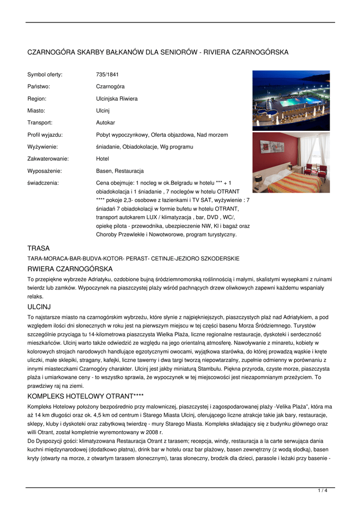 CZARNOGÓRA SKARBY BAŁKANÓW DLA SENIORÓW - RIVIERA CZARNOGÓRSKA Symbol oferty: 735/1841 Państwo: Czarnogóra Region: Ulcinjska Riwiera Miasto: Ulcinj Transport: Autokar Profil wyjazdu: Pobyt wypoczynkowy, Oferta objazdowa, Nad morzem Wyżywienie: śniadanie, Obiadokolacje, Wg programu Zakwaterowanie: Hotel Wyposażenie: Basen, Restauracja świadczenia: Cena obejmuje: 1 nocleg w ok.Belgradu w hotelu *** + 1 obiadokolacja i 1 śniadanie , 7 noclegów w hotelu OTRANT **** pokoje 2,3- osobowe z łazienkami i TV SAT, wyżywienie : 7 śniadań 7 obiadokolacji w formie bufetu w hotelu OTRANT, transport autokarem LUX / klimatyzacja , bar, DVD , WC/, opiekę pilota - przewodnika, ubezpieczenie NW, Kl i bagaż oraz Choroby Przewlekłe i Nowotworowe, program turystyczny. TRASA TARA-MORACA-BAR-BUDVA-KOTOR- PERAST- CETINJE-JEZIORO SZKODERSKIE RWIERA CZARNOGÓRSKA To przepiękne wybrzeże Adriatyku, ozdobione bujną śródziemnomorską roślinnością i małymi, skalistymi wysepkami z ruinami twierdz lub zamków. Wypoczynek na piaszczystej plaży wśród pachnących drzew oliwkowych zapewni każdemu wspaniały relaks. ULCINJ To najstarsze miasto na czarnogórskim wybrzeżu, które słynie z najpiękniejszych, piaszczystych plaż nad Adriatykiem, a pod względem ilości dni słonecznych w roku jest na pierwszym miejscu w tej części basenu Morza Śródziemnego. Turystów szczególnie przyciąga tu 14-kilometrowa piaszczysta Wielka Plaża, liczne regionalne restauracje, dyskoteki i serdeczność mieszkańców. Ulcinj warto także odwiedzić ze względu na jego orientalną atmosferę. Nawoływanie z minaretu, kobiety w kolorowych strojach narodowych handlujące egzotycznymi owocami, wyjątkowa starówka, do której prowadzą wąskie i kręte uliczki, małe sklepiki, stragany, kafejki, liczne tawerny i dwa targi tworzą niepowtarzalny, zupełnie odmienny w porównaniu z innymi miasteczkami Czarnogóry charakter. Ulcinj jest jakby miniaturą Stambułu. Piękna przyroda, czyste morze, piaszczysta plaża i umiarkowane ceny - to wszystko sprawia, że wypoczynek w tej miejscowości jest niezapomnianym przeżyciem. To prawdziwy raj na ziemi. KOMPLEKS HOTELOWY OTRANT**** Kompleks Hotelowy położony bezpośrednio przy malowniczej, piaszczystej i zagospodarowanej plaży -Velika Plaża”, która ma aż 14 km długości oraz ok. 4,5 km od centrum i Starego Miasta Ulcinj, oferującego liczne atrakcje takie jak bary, restauracje, sklepy, kluby i dyskoteki oraz zabytkową twierdzę - mury Starego Miasta. Kompleks składający się z budynku głównego oraz willi Otrant, został kompletnie wyremontowany w 2008 r. Do Dyspozycji gości: klimatyzowana Restauracja Otrant z tarasem; recepcja, windy, restauracja a la carte serwująca dania kuchni międzynarodowej (dodatkowo płatna), drink bar w hotelu oraz bar plażowy, basen zewnętrzny (z wodą słodką), basen kryty (otwarty na morze, z otwartym tarasem słonecznym), taras słoneczny, brodzik dla dzieci, parasole i leżaki przy basenie - 1/4 bezpłatne, centrum SPA-płatne, minigolf i boisko wielofunkcyjne. Serwis plażowy dodatkowo płatny - 10EUR/dziennie/parasol +2 leżaki ZAKWATEROWANIE Pokoje 2 - os. (możliwość 1 dostawki), łazienka (WC, prysznic, suszarka do włosów), mini bar (dodatkowo płatny), klimatyzacja (centralnie sterowana, bezpłatnie).Wszystkie pokoje o wysokim standardzie, komfortowo wyposażone. Niektóre pokoje z balkonem. WYŻYWIENIE 2 x dziennie (śniadanie, obiadokolacja - w formie BUFETU). Pierwsze świadczenie - obiadokolacja, ostatnie świadczenie śniadanie. PROGRAM I DZIEŃ - Wyjazd. Przejazd przez: Słowację, Węgry, Serbię. W autokarze kawa, herbata bezpłatnie. Przyjazd do hotelu w ok. Belgradu w Serbii. Obiadokolacja, nocleg. II DZIEŃ - Po śniadaniu wyjazd z Serbii w kierunku Czarnogóry. W trakcie przejazdu postój nad Kanionem rzeki Tara - najgłębszy kanion w Europie - jego głębokość dochodzi miejscami do 1250m oraz Kanionu Moraca z XIII-wiecznym Monastyrem Moraca średniowieczny pomnik prawosławnej Czarnogóry z przepięknymi freskami. Przyjazd do hotelu w Ulcinij obiadokolacja, nocleg. III DZIEŃ - Po śniadaniu- plażowanie, kąpiele, wypoczynek obiadokolacja - nocleg. IV DZIEŃ - Po śniadaniu Wyjazd z hotelu zwiedzanie BARU- największego portu Czarnogóry, zespół pałacowy Topolica otoczony egzotycznym ogrodem, Stary Bar - perła architektury, -młodszy brat” włoskiego Bari, brama miejska z X-XI w, kościoły św. Katarzyny i św. Venerada, łaźnia turecka, ruiny katedry św. Jerzego, ruiny pałacu biskupów, turecki akwedukt, następnie MIROVICA - jeden z najstarszych gajów oliwnych na świecie. Przejazd autokarem nad JEZIORO SZKODERSKIE- największe jezioro na Półwyspie Bałkańskim, położone na granicy Czarnogóry i Albanii. Park Narodowy obejmuje znaczną część czarnogórskiej części jeziora z licznymi wyspami, zabytkowymi monastyrami, Rejs stateczkiem - przepłynięcie do wyspy Grmozur gdzie w czasach austro-węgierskich było więzienie. Na wyspie można zobaczyć różne gatunki ptaków (ok. 220). Po obejrzeniu wyspy przepłynięcie do serca jeziora gdzie znajduje się ukryta plaża -Pjesacac” - która jest dostępna tylko od strony wody. Plażowanie - kąpiel. Powrót do Hotelu - obiadokolacja, nocleg V DZIEŃ - Po śniadaniu- plażowanie,kąpiele, wypoczynek, obiadokolacja - nocleg. VI DZIEŃ - po śniadaniu wyjazd autokarem nad ZATOKĘ KOTERSKĄ,która niczym fiord wcina się w głąb lądu. Następnie BUDWA nazywana -małym Dubrownikiem” otoczona XV-wiecznymi murami, zwiedzanie miniaturowego starego miasta,gdzie znajduje się m.in. Kościoł Św.Jana - dawna katedra i średniowieczna kaplica św. Sawy. I wreszcie KOTOR - miasto wpisane na Listę Światowego Dziedzictwa UNESCO, położone nad Zatoką Kotorską porównywaną często do krajobrazu norweskich fiordów, spacer po starym mieście otoczonym murami obronnymi: Brama Morska, wieża zegarowa, katedra romańska św. Tripuna