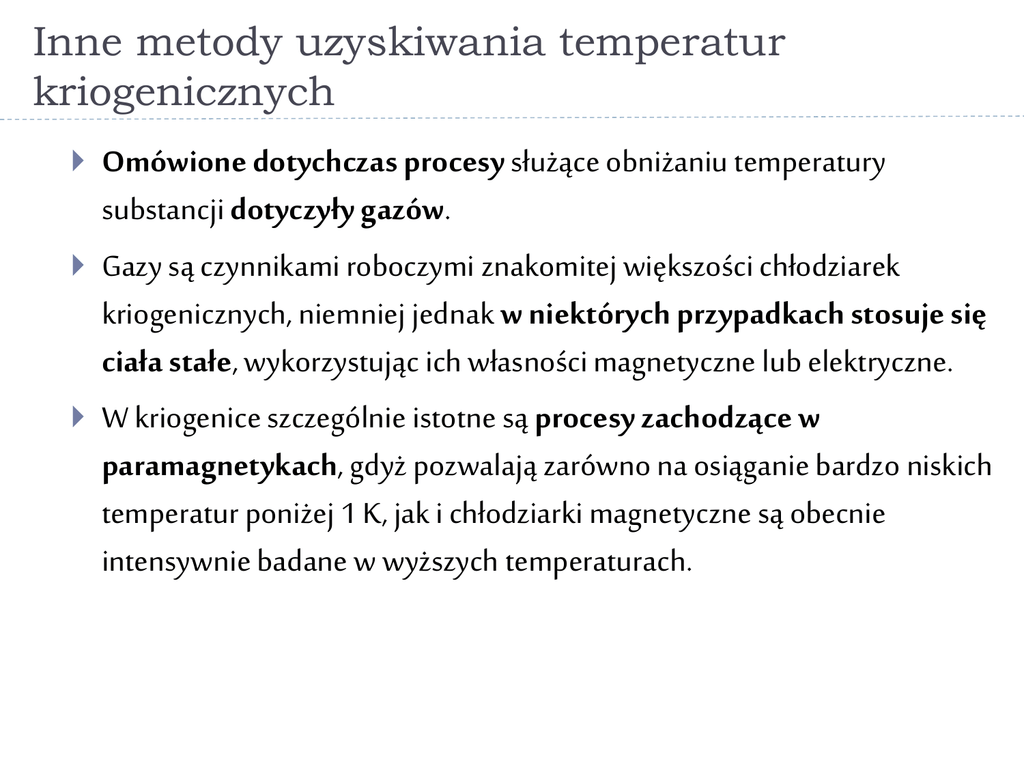 Inne metody uzyskiwania temperatur kriogenicznych Omówione dotychczas procesy służące obniżaniu temperatury substancji dotyczyły gazów. Gazy są czynnikami roboczymi znakomitej większości chłodziarek kriogenicznych, niemniej jednak w niektórych przypadkach stosuje się ciała stałe, wykorzystując ich własności magnetyczne lub elektryczne. W kriogenice szczególnie istotne są procesy zachodzące w paramagnetykach, gdyż pozwalają zarówno na osiąganie bardzo niskich temperatur poniżej 1 K, jak i chłodziarki magnetyczne są obecnie intensywnie badane w wyższych temperaturach. Rozmagnesowanie adiabatyczne Rozmagnesowanie adiabatyczne to metoda oziębiania, która jest stosowana głównie w celu osiągnięcia temperatury poniżej 1 Kelwina. W metodzie tej wyzyskuje się zjawisko polegające na zmianie temperatury magnetyka wskutek zmian pola magnetycznego, w którym się on znajduje. Ze względu na własności magnetyczne ciała można podzielić na: Diamagnetyki, Paramagnetyki Ferromagnetyki. Diamagnetyki Diamagnetyzm - zjawisko polegające na indukcji w ciele, znajdującym się w zewnętrznym polu magnetycznym pola przeciwnego, osłabiającego działanie zewnętrznego pola. Diamagnetyki samorzutnie nie wykazują właściwości magnetycznych i są odpychane przez magnes. Umieszczenie diamagnetyka w zewnętrznym polu magnetycznym powoduje powstanie w tym materiale pola magnetycznego skierowanego przeciwnie. Dla tych ciał względna przenikalność magnetyczna μ ośrodka jest nieco mniejsza od jedności (diamagnetyki nieznacznie osłabiają pole magnetyczne) Paramagnetyki Paramagnetyzm - zjawisko magnesowania się makroskopowego ciała w zewnętrznym polu magnetycznym w kierunku zgodnym z kierunkiem pola zewnętrznego. Substancja wykazująca takie własności to paramagnetyk, jest on przyciągany przez magnes, jednak znacznie słabiej niż ferromagnetyk. Paramagnetyki W paramagnetykach atomy lub cząsteczki maja własne momenty magnetyczne, lecz oddziaływania pomiędzy tymi momentami są bardzo słabe i z powodu fluktuacji cieplnych wypadkowy moment magnetyczny paramagnetyków jest równy zeru. Przyłożenie zewnętrznego pola magnetycznego prowadzi do uporządkowania momentów magnetycznych i powstania momentu wypadkowego, zgodnego z kierunkiem zewnętrznego pola magnetycznego. W niezbyt niskich temperaturach oraz dla niezbyt silnych pól magnetycznych paramagnetyki wykazują liniową wielkość namagnesowania od pola zewnętrznego. Paramagnetyzm Dla Paramagnetyków i diamagnetyków prawdziwy jest związek: M H M - namagnesowanie (moment magnetyczny jednostki objętości substancji) χ - objętościowa podatność magnetyczna H - natężenie pola magnetycznego. Przyczyną paramagnetyzmu jest porządkowanie się spinów elektronów ciała zgodnie z liniami zewnętrznego pola magnetycznego Uporządkowaniu przeciwdziałają drgania cieplne cząsteczek. Ferromagnetyzm Ferromagnetyzm – zjawisko, w którym materia wykazuje własne, spontaniczne namagnesowanie. Jest odpowiedzialny za większość magnetycznych zachowań spotykanych w życiu codziennym. Jest podstawą istnienia wszystkich magnesów trwałych - jak i zauważalnego przyciągania innych ferromagnetycznych metali przez magnesy trwałe. Rozmagnesowanie adiabatyczne Elementarna praca namagnesowania substancji ferromagnetycznej lub paramagnetycznej jest równa: dLM 0 HdM µ0 - przenikalność magnetyczna próżni [weber/Am lubVs/Am], H - natężenia pola magnetycznego [A/m], M - wektor namagnesowania [A/m2] dU TdS pdV 0 HdM Pomijamy, zaniedbując zmiany objętości podczas magnesowania Rozmagnesowanie adiabatyczne T < 0,3 K – adiabatyczne rozmagnesowanie spinów elektronów soli paramagnetycznych – osiąga się temperatury do 1 mK Metoda ta została zaproponowana już w 1926 przez Debye Temperatury rzędu 1 μK można osiągnąć poprzez adiabatyczne rozmagnesowanie spinów jąder atomowych W 1965 r. Kurti osiągnął temp. 1,2x10-6K rozmagnesowując jądra miedzi T = 280 pK uzyskał Hakonen dla izotopu rodu 103Rh w 1993r Rozmagnesowanie adiabatyczne Entropia paramagnetyków zależy nie tylko od fluktuacji cieplnych cząsteczek lecz również od ich orientacji. S S (T , H ) H - natężenie pola magnetycznego, A-B - izotermiczne namagnesowanie, B-C – adiabatyczne rozmagnesowanie. q Tm (S A S B ) Rozmagnesowanie adiabatyczne Jeśli S = S(T, H), to różniczka zupełna S wyniesie: S S dS dT dH 0 T X H T Zatem różniczkowy współczynnik efektu magnetokalorycznego będzie wynosił: S dT H T s S dH S T X Rozmagnesowanie adiabatyczne Na podstawie wzorów dla uogólnionego procesu oziębiania wewnętrznego: Y T dT T X S cX dX S S M T T 0 dT H T T H S cH cH dH S M H W przypadku diamagnetyków χ < 0 oraz (∂χ / ∂T ) = 0 , więc rozmagnesowanie diamagnetyków nie prowadzi do zmiany ich temperatury Rozmagnesowanie adiabatyczne Korzystając z prawa Curie: C T C – stała zależna od rodzaju substancji (stała Curie) Otrzymamy zależność: A po przekształceniu: s 0CH cH T Tk T0 1 cH T02 0CH 2 M Q T T H 2T 0 H Wydajność chłodniczą wyznaczamy 0CH 0 2 Rozmagnesowanie adiabatyczne a – wstępne chłodzenie próbki, b – izotermiczne namagnesowanie, c – usunięcie gazu pośredniczącego w wymianie ciepła, d – rozmagnesowanie adiabatyczne; 1 – substancja paramagnetyczna, 2 – naczynie z próbką, 3 – zawór pozwalający na usunięcie gazu pośredniczącego w wymianie ciepła, 4 – magnes, 5 – zawór. Chłodziarka magnetyczna 1 – blok miedziany ziębiony chłodziarką McMahona, 2 - magnes nadprzewodzący pracujący w sposób ciągły, 3 - izolacja próżniowa, 4 - magnetyk (GGG), 5 - tłok, 6 - miernik poziomu Zadania urządzeń i systemów kriogenicznych: Kriostatowanie - termostatowanie w przypadku temperatur niższych niż 120 K Oziębianie do temperatur kriogenicznych Skraplanie gazów Rozdział mieszanin gazowych Zarówno kriostatowanie różnych obiektów, jak też ich oziębianie do temperatu