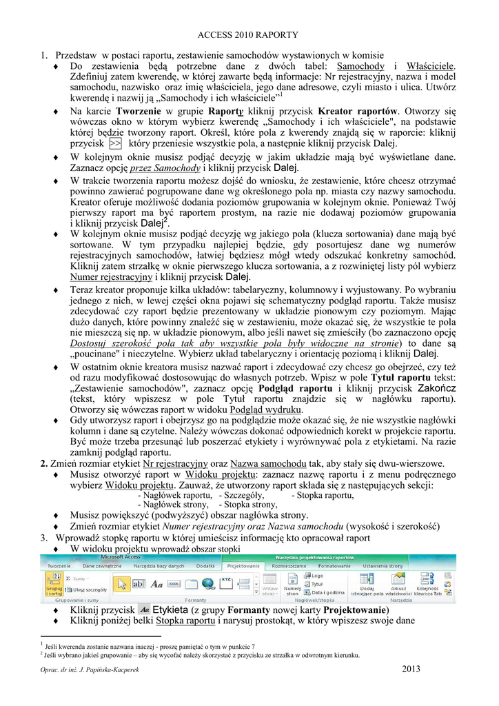 ACCESS 2010 RAPORTY 1. Przedstaw w postaci raportu, zestawienie samochodów wystawionych w komisie ♦ Do zestawienia będą potrzebne dane z dwóch tabel: Samochody i Właściciele. Zdefiniuj zatem kwerendę, w której zawarte będą informacje: Nr rejestracyjny, nazwa i model samochodu, nazwisko oraz imię właściciela, jego dane adresowe, czyli miasto i ulica. Utwórz kwerendę i nazwij ją „Samochody i ich właściciele”1 ♦ Na karcie Tworzenie w grupie Raporty kliknij przycisk Kreator raportów. Otworzy się wówczas okno w którym wybierz kwerendę „Samochody i ich właściciele", na podstawie której będzie tworzony raport. Określ, które pola z kwerendy znajdą się w raporcie: kliknij przycisk >> który przeniesie wszystkie pola, a następnie kliknij przycisk Dalej. ♦ W kolejnym oknie musisz podjąć decyzję w jakim układzie mają być wyświetlane dane. Zaznacz opcję przez Samochody i kliknij przycisk Dalej. ♦ W trakcie tworzenia raportu moŜesz dojść do wniosku, Ŝe zestawienie, które chcesz otrzymać powinno zawierać pogrupowane dane wg określonego pola np. miasta czy nazwy samochodu. Kreator oferuje moŜliwość dodania poziomów grupowania w kolejnym oknie. PoniewaŜ Twój pierwszy raport ma być raportem prostym, na razie nie dodawaj poziomów grupowania i kliknij przycisk Dalej2. ♦ W kolejnym oknie musisz podjąć decyzję wg jakiego pola (klucza sortowania) dane mają być sortowane. W tym przypadku najlepiej będzie, gdy posortujesz dane wg numerów rejestracyjnych samochodów, łatwiej będziesz mógł wtedy odszukać konkretny samochód. Kliknij zatem strzałkę w oknie pierwszego klucza sortowania, a z rozwiniętej listy pól wybierz Numer rejestracyjny i kliknij przycisk Dalej. ♦ Teraz kreator proponuje kilka układów: tabelaryczny, kolumnowy i wyjustowany. Po wybraniu jednego z nich, w lewej części okna pojawi się schematyczny podgląd raportu. TakŜe musisz zdecydować czy raport będzie prezentowany w układzie pionowym czy poziomym. Mając duŜo danych, które powinny znaleźć się w zestawieniu, moŜe okazać się, Ŝe wszystkie te pola nie mieszczą się np. w układzie pionowym, albo jeśli nawet się zmieściły (bo zaznaczono opcję Dostosuj szerokość pola tak aby wszystkie pola były widoczne na stronie) to dane są „poucinane" i nieczytelne. Wybierz układ tabelaryczny i orientację poziomą i kliknij Dalej. ♦ W ostatnim oknie kreatora musisz nazwać raport i zdecydować czy chcesz go obejrzeć, czy teŜ od razu modyfikować dostosowując do własnych potrzeb. Wpisz w pole Tytuł raportu tekst: „Zestawienie samochodów", zaznacz opcję Podgląd raportu i kliknij przycisk Zakończ (tekst, który wpiszesz w pole Tytuł raportu znajdzie się w nagłówku raportu). Otworzy się wówczas raport w widoku Podgląd wydruku. ♦ Gdy utworzysz raport i obejrzysz go na podglądzie moŜe okazać się, Ŝe nie wszystkie nagłówki kolumn i dane są czytelne. NaleŜy wówczas dokonać odpowiednich korekt w projekcie raportu. Być moŜe trzeba przesunąć lub poszerzać etykiety i wyrównywać pola z etykietami. Na razie zamknij podgląd raportu. 2. Zmień rozmiar etykiet Nr rejestracyjny oraz Nazwa samochodu tak, aby stały się dwu-wierszowe. ♦ Musisz otworzyć raport w Widoku projektu: zaznacz nazwę raportu i z menu podręcznego wybierz Widoku projektu. ZauwaŜ, Ŝe utworzony raport składa się z następujących sekcji: ♦ ♦ - Nagłówek raportu, - Szczegóły, - Nagłówek strony, - Stopka strony, - Stopka raportu, Musisz powiększyć (podwyŜszyć) obszar nagłówka strony. Zmień rozmiar etykiet Numer rejestracyjny oraz Nazwa samochodu (wysokość i szerokość) 3. Wprowadź stopkę raportu w której umieścisz informację kto opracował raport ♦ W widoku projektu wprowadź obszar stopki ♦ ♦ 1 2 Kliknij przycisk Etykieta (z grupy Formanty nowej karty Projektowanie) Kliknij poniŜej belki Stopka raportu i narysuj prostokąt, w który wpiszesz swoje dane Jeśli kwerenda zostanie nazwana inaczej - proszę pamiętać o tym w punkcie 7 Jeśli wybrano jakieś grupowanie – aby się wycofać naleŜy skorzystać z przycisku ze strzałka w odwrotnym kierunku. Oprac. dr inŜ. J. Papińska-Kacperek 2013 ACCESS 2010 RAPORTY ♦ W widoku Podglądu wydruku lub Widoku raportu stopka pojawi się na końcu raportu 4. Zmień kolejność sortowania w raporcie ♦ W widoku projektu kliknij w belkę sekcji Szczegóły, z grupy Grupowanie i sumy wybierz polecenie Grupuj i sortuj. W pojawiającym się na dole oknie dialogowym zmień klucz sortowania - .kliknij strzałkę obok dotychczasowego klucza i z rozwiniętej listy pól wybierz np. Nazwisko. ♦ Zamknij okno Grupowanie sortowanie i sumowanie. Przejdź do widoku raportu i zobacz efekt. 5. Pogrupuj raport wg marki samochodu ♦ wybierz polecenie Grupuj i sortuj. Gdy pojawi się okno Grupowanie sortowanie i sumowanie jako klucz sortowania wybierz pole Nazwa samochodu. Następnie kliknij przycisk Dodaj grupę i takŜe wybierz pole Nazwa samochodu. Do raportu zostanie dołączona wówczas jeszcze jedna sekcja Nazwa samochodu-nagłówek. Zamknij okno Grupowanie sortowanie i sumowanie ♦ NaleŜy jeszcze w nagłówku grupy umieścić pole, wg którego dane będą grupowane: w tym celu kliknij przycisk Dodaj istniejące pola a gdy otworzy się okno Lista pól, wybierz pole Nazwa samochodu i przeciągnij je do sekcji Nazwa samochodu-nagłówek. Pole zostanie umieszczone wraz ze standardową etykietą, która nie będzie potrzebna: zaznacz ją i usuń. Następnie przesuń pole Nazwa samochodu do lewej krawędzi sekcji ♦ Zobacz raport w widoku Podglądu wydruku. Raport zajmuje pewnie 2 strony3. ♦ Wróć do projektu raportu. Sformatuj pole Nazwa samochodu tak, aby odróŜniało się od pozostałych pól w raporcie, np. zwiększ czcionkę, nadaj kolor, pogrub, pochyl itp. Zobacz efekt 6. Wstaw nr rekordów w grupie ♦ Do sekcji szczegółów wstaw licznik rekordów. Powinien znaleźć s