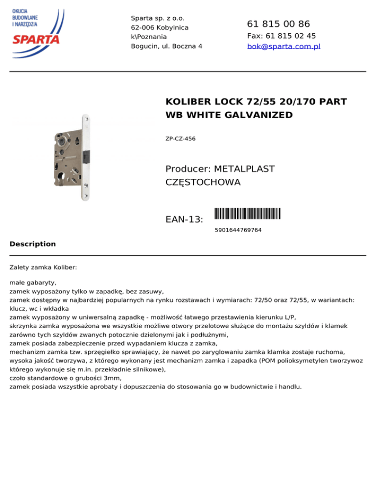 Sparta sp. z o.o. 62-006 Kobylnica 61 815 00 86 k\Poznania Fax: 61 815 02 45 Bogucin, ul. Boczna 4 [email protected] KOLIBER LOCK 72/55 20/170 PART WB WHITE GALVANIZED ZP-CZ-456 Producer: METALPLAST CZĘSTOCHOWA EAN-13: 5901644769764 5901644769764 Description Zalety zamka Koliber: małe gabaryty, zamek wyposażony tylko w zapadkę, bez zasuwy, zamek dostępny w najbardziej popularnych na rynku rozstawach i wymiarach: 72/50 oraz 72/55, w wariantach: klucz, wc i wkładka zamek wyposażony w uniwersalną zapadkę - możliwość łatwego przestawienia kierunku L/P, skrzynka zamka wyposażona we wszystkie możliwe otwory przelotowe służące do montażu szyldów i klamek zarówno tych szyldów zwanych potocznie dzielonymi jak i podłużnymi, zamek posiada zabezpieczenie przed wypadaniem klucza z zamka, mechanizm zamka tzw. sprzęgiełko sprawiający, że nawet po zaryglowaniu zamka klamka zostaje ruchoma, wysoka jakość tworzywa, z którego wykonany jest mechanizm zamka i zapadka (POM polioksymetylen tworzywoz którego wykonuje się m.in. przekładnie silnikowe), czoło standardowe o grubości 3mm, zamek posiada wszystkie aprobaty i dopuszczenia do stosowania go w budownictwie i handlu.