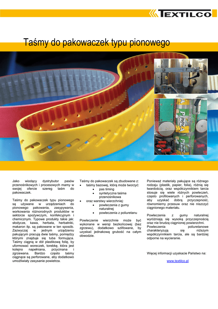 Taśmy do pakowaczek typu pionowego Jako wiodący dystrybutor pasów przenośnikowych i procesowych mamy w swojej ofercie szereg taśm do pakowaczek. Taśmy do pakowaczek typu pionowego są używane w urządzeniach do pionowego pakowania, zasypywania, workowania różnorodnych produktów w sektorze spożywczym, konfekcyjnym i chemicznym. Typowe produkty takie jak: słodycze, kawa, herbata, herbatniki, makaron itp. są pakowane w ten sposób. Zazwyczaj w jednym urządzeniu pakującym pracują dwie taśmy, pomiędzy którymi znajduje się tuba formująca. Taśmy ciągną w dół plastikową folię, by uformować woreczek, torebkę, która jest kolejno napełniana, przycinana i zgrzewana. Bardzo często taśmy ciągnące są perforowane, aby dodatkowo umożliwiały zasysanie powietrza. Taśmy do pakowaczek są zbudowane z: taśmy bazowej, którą może tworzyć: pas timing syntetyczna taśma przenośnikowa oraz warstwy wierzchniej: powleczenia z gumy naturalnej powleczenia z poliuretanu Powleczenie wierzchnie może być wykonane w wersji bezkońcowej (bez zgrzewu), dodatkowo szlifowane, by uzyskać jednakową grubość na całym obwodzie. Ponieważ materiały pakujące są różnego rodzaju (plastik, papier, folia), różnią się twardością, oraz współczynnikiem tarcia stosuje się wiele różnych powleczeń, często profilowanych i perforowanych, aby uzyskać dobrą przyczepność, równomierny przesuw oraz nie niszczyć ciągnionego materiału. Powleczenia z gumy naturalnej wyróżniają się wysoką przyczepnością oraz nie brudzą ciągnionej powierzchni. Powleczenia poliuretanowe charakteryzują się niższym współczynnikiem tarcia, ale są bardziej odporne na wycieranie. Więcej informacji uzyskacie Państwo na: www.textilco.pl ZALETY PRODUKTU poliuretanowe powleczenie o wysokiej odporności na wycieranie, nie brudzące gumowe powleczenie zapewniające dużą przyczepność, nie brudzące doskonała odporność na otarcia i rozerwania wysoka sprężystość jednakowa grubość na obwodzie taśmy możliwość profilowania strony wierzchniej taśm Tam, gdzie standardowe taśmy nie wystarczają stosujemy innowacyjne, indywidualne rozwiązania PRZYKŁADY DOSTĘPNYCH PRODUKTÓW Wymiar w mm (długość/szerokość/grubość) Typ PU 50T10 – 920K + PUS600 żółty, typ A Guma 280XL097 + NRC035 czerwony Guma 50T10 – 630 + NRC040 czerwony, typ 3 PU 40T10 – 840K + NRS055 czerwony 920.0/50.0/7.5 711.2/23.9/9.4 630.0/30.0/9.5 840.0/40.0/9.5 NOMENKLATURA TAŚM DO PAKOWACZEK PU 50T10 – 920K Guma 50T10 – 630 Guma 270H200 +PU +NR +NR S C S 600 040 040 Żółty Czerwony Czerwony + typ A + typ 2 1. Część bieżna – rdzeń 2. Część nośna – pokrycie 3. Metoda produkcji 4. Twardość (Shore A) 5. Kolor 6. Informacje dodatkowe WIĘCEJ INFORMACJI Aby uzyskać więcej informacji proszę skonsultować: arkusz informacji o produkcie arkusze z danymi technicznymi folder z informacją branżową KONTAKT Textilco ul. Łanowa 15/21 91-103 Łódź tel: fax: email: web: . 042 611 07 10 042 611 07 20 [email protected] www.textilco.pl