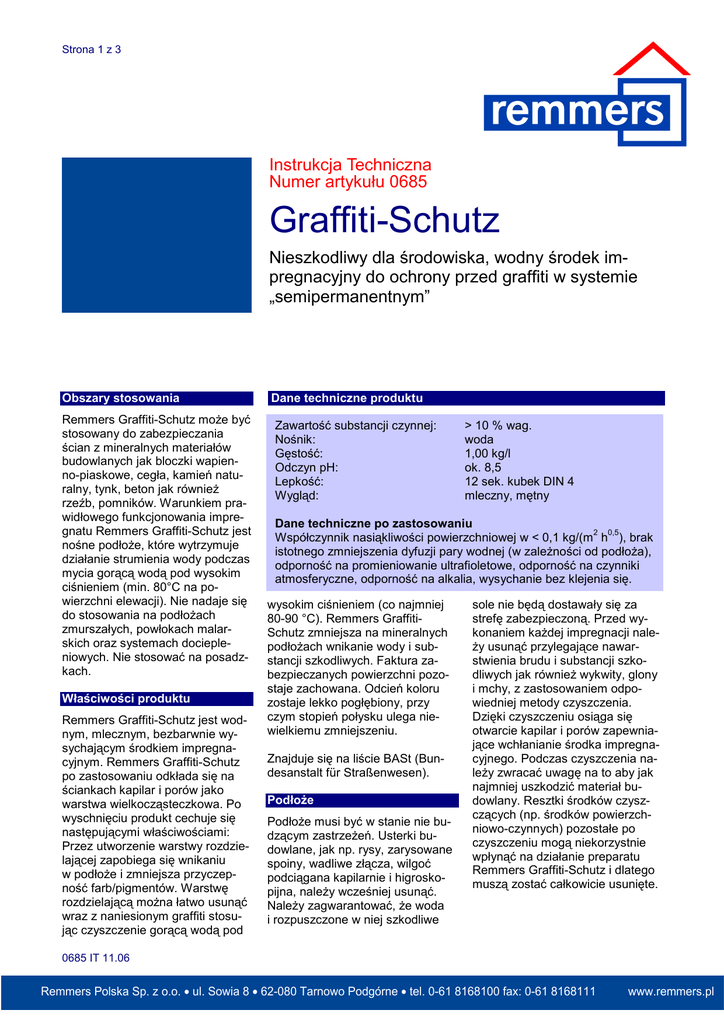 Strona 1 z 3 Instrukcja Techniczna Numer artykułu 0685 Graffiti-Schutz Nieszkodliwy dla środowiska, wodny środek impregnacyjny do ochrony przed graffiti w systemie „semipermanentnym” Obszary stosowania Remmers Graffiti-Schutz może być stosowany do zabezpieczania ścian z mineralnych materiałów budowlanych jak bloczki wapienno-piaskowe, cegła, kamień naturalny, tynk, beton jak również rzeźb, pomników. Warunkiem prawidłowego funkcjonowania impregnatu Remmers Graffiti-Schutz jest nośne podłoże, które wytrzymuje działanie strumienia wody podczas mycia gorącą wodą pod wysokim ciśnieniem (min. 80°C na powierzchni elewacji). Nie nadaje się do stosowania na podłożach zmurszałych, powłokach malarskich oraz systemach dociepleniowych. Nie stosować na posadzkach. Właściwości produktu Remmers Graffiti-Schutz jest wodnym, mlecznym, bezbarwnie wysychającym środkiem impregnacyjnym. Remmers Graffiti-Schutz po zastosowaniu odkłada się na ściankach kapilar i porów jako warstwa wielkocząsteczkowa. Po wyschnięciu produkt cechuje się następującymi właściwościami: Przez utworzenie warstwy rozdzielającej zapobiega się wnikaniu w podłoże i zmniejsza przyczepność farb/pigmentów. Warstwę rozdzielającą można łatwo usunąć wraz z naniesionym graffiti stosując czyszczenie gorącą wodą pod Dane techniczne produktu Zawartość substancji czynnej: Nośnik: Gęstość: Odczyn pH: Lepkość: Wygląd: > 10 % wag. woda 1,00 kg/l ok. 8,5 12 sek. kubek DIN 4 mleczny, mętny Dane techniczne po zastosowaniu 2 0,5 Współczynnik nasiąkliwości powierzchniowej w < 0,1 kg/(m h ), brak istotnego zmniejszenia dyfuzji pary wodnej (w zależności od podłoża), odporność na promieniowanie ultrafioletowe, odporność na czynniki atmosferyczne, odporność na alkalia, wysychanie bez klejenia się. wysokim ciśnieniem (co najmniej 80-90 °C). Remmers GraffitiSchutz zmniejsza na mineralnych podłożach wnikanie wody i substancji szkodliwych. Faktura zabezpieczanych powierzchni pozostaje zachowana. Odcień koloru zostaje lekko pogłębiony, przy czym stopień połysku ulega niewielkiemu zmniejszeniu. Znajduje się na liście BASt (Bundesanstalt für Straßenwesen). Podłoże Podłoże musi być w stanie nie budzącym zastrzeżeń. Usterki budowlane, jak np. rysy, zarysowane spoiny, wadliwe złącza, wilgoć podciągana kapilarnie i higroskopijna, należy wcześniej usunąć. Należy zagwarantować, że woda i rozpuszczone w niej szkodliwe sole nie będą dostawały się za strefę zabezpieczoną. Przed wykonaniem każdej impregnacji należy usunąć przylegające nawarstwienia brudu i substancji szkodliwych jak również wykwity, glony i mchy, z zastosowaniem odpowiedniej metody czyszczenia. Dzięki czyszczeniu osiąga się otwarcie kapilar i porów zapewniające wchłanianie środka impregnacyjnego. Podczas czyszczenia należy zwracać uwagę na to aby jak najmniej uszkodzić materiał budowlany. Resztki środków czyszczących (np. środków powierzchniowo-czynnych) pozostałe po czyszczeniu mogą niekorzystnie wpłynąć na działanie preparatu Remmers Graffiti-Schutz i dlatego muszą zostać całkowicie usunięte. 0685 IT 11.06 Remmers Remmers Polska Polska Sp. Sp. zz o.o. o.o. •• ul. ul. Sowia Sowia 88 •• 62-080 62-080 Tarnowo Tarnowo Podgórne Podgórne •• tel. tel. 0-61 0-61 8168100 8168100 fax: fax: 0-61 0-61 8168111 8168111 www.remmers.pl www.remmers.pl Strona 2 z 3 Stan podłoża: W przypadku obecności szkodliwych soli jak siarczany, chlorki i azotany niezbędna jest analiza ilościowa tych soli. Wysokie stężenia soli prowadzą do poważnych szkód budowlanych, którym nie można zapobiec stosując impregnację. Powierzchnie przylegające: Części elewacji, które nie powinny stykać się z preparatem impregnującym, np. okna, powierzchnie lakierowane i przeznaczone do lakierowania, szkło, jak również rośliny należy chronić przez przykrycie folią budowlaną (polietylenową). Sposób stosowania Środek impregnacyjny nanoszony jest metodą polewania niskociśnieniowego, przy stosowaniu dyszy dającej szeroki strumień, aż do takiego nasycenia, żeby po powierzchni materiału budowlanego spływała błonka płynu o długości 30-50 cm. Podczas polewania dyszę prowadzi się wzdłuż elewacji i natychmiast rozprowadza dodatkowo impregnat pędzlem angielskim lub włosianą szczotką. Cykl należy co najmniej jeden raz powtórzyć, w razie potrzeby powtórzyć kilka razy. Aby uniknąć usterek, należy ograniczone fragmenty elewacji impregnować bez przerwy, aż do zakończenia zabiegu. W przypadku małych, skomplikowanych powierzchni, gdzie nanoszenie przez natrysk jest niemożliwe, można pracować także pędzlem lub wałkiem. Aby uniknąć przy takiej metodzie pracy wprowadzenia zbyt małych ilości impregnatu, należy pracować dobrze nasączonym narzędziem. Świeżo zaimpregnowane powierzchnie należy chronić przed deszczem, przez co najmniej 5 godzin. Silny wiatr i nasłonecznienie mogą przyspieszyć odparowanie nośnika, co niekorzystnie wpływa na głębokość wnikania. Często zabezpieczane powierzchnie były wcześniej hydrofobizowane. W takich przypadkach, przed niskociśnieniowym polewaniem, należy nanieść wstępnie na podłoże impregnat Remmers Graffiti-Schutz pędzlem, względnie wmasować produkt w podłoże. Specjalne dodatki obniżają krótkotrwale hydrofobowość i umożliwiają przyleganie wodorozcieńczalnego produktu na hydrofobowym podłożu. Temperatura stosowania: Zabezpieczenie powierzchni można wykonywać przy temperaturach obiektu pomiędzy 10°C i 25°C. Usuwanie graffiti: Graffiti, które zostaną naniesione na zabezpieczone powierzchnie przy użyciu farb w spray'u, usuwa się strumieniem gorącej wody o temperaturze min. 80-90°C pod wysokim ciśnieniem. Razem z graffiti ulega wtedy usunięciu z elewacji impregnat, dlatego po oczyszczeniu i wyschnięciu powierzchni należy ponownie wykonać zabieg nanie