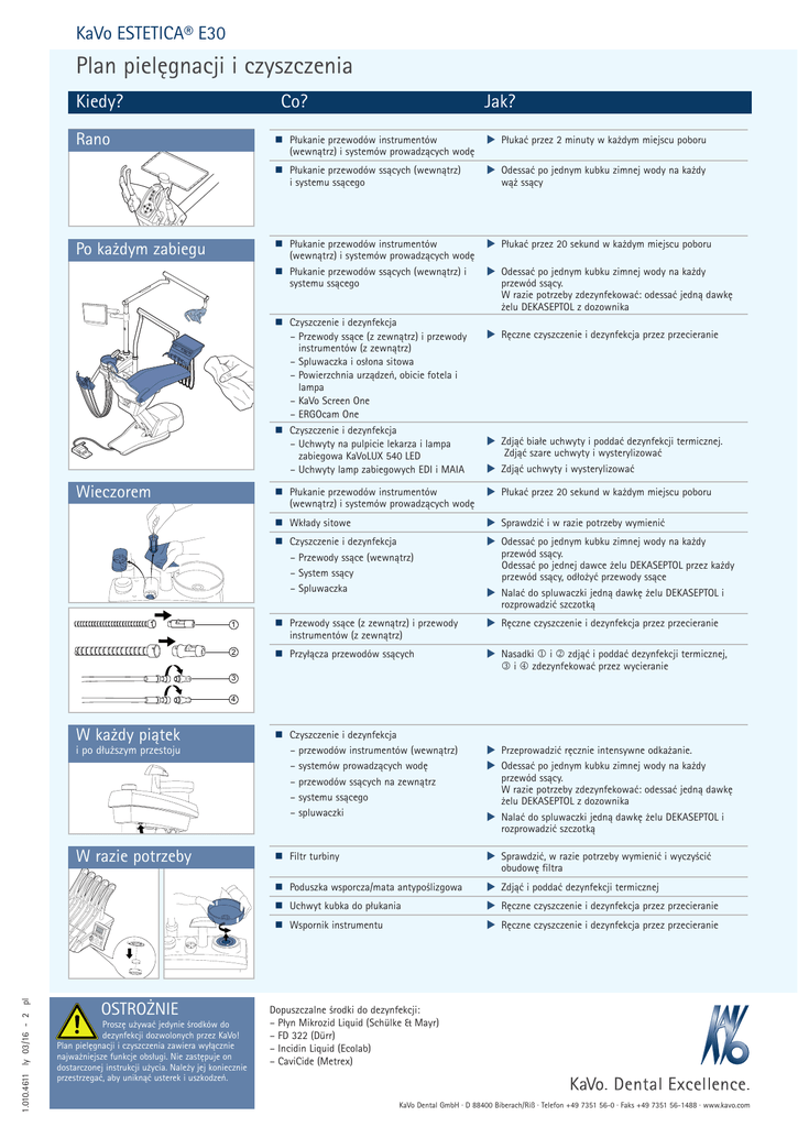 KaVo ESTETICA® E30 Plan pielęgnacji i czyszczenia Kiedy? Co? Rano Po każdym zabiegu Jak? nPłukanie przewodów instrumentów (wewnątrz) i systemów prowadzących wodę u Płukać przez 2 minuty w każdym miejscu poboru nPłukanie przewodów ssących (wewnątrz) i systemu ssącego u Odessać po jednym kubku zimnej wody na każdy wąż ssący nPłukanie przewodów instrumentów (wewnątrz) i systemów prowadzących wodę nPłukanie przewodów ssących (wewnątrz) i systemu ssącego u Płukać przez 20 sekund w każdym miejscu poboru nCzyszczenie i dezynfekcja – P rzewody ssące (z zewnątrz) i przewody instrumentów (z zewnątrz) – Spluwaczka i osłona sitowa – P owierzchnia urządzeń, obicie fotela i lampa –K aVo Screen One – ERGOcam One nCzyszczenie i dezynfekcja – Uchwyty na pulpicie lekarza i lampa zabiegowa KaVoLUX 540 LED – Uchwyty lamp zabiegowych EDI i MAIA Wieczorem u Odessać po jednym kubku zimnej wody na każdy przewód ssący. W razie potrzeby zdezynfekować: odessać jedną dawkę żelu DEKASEPTOL z dozownika u Ręczne czyszczenie i dezynfekcja przez przecieranie u Zdjąć białe uchwyty i poddać dezynfekcji termicznej. Zdjąć szare uchwyty i wysterylizować u Zdjąć uchwyty i wysterylizować nPłukanie przewodów instrumentów (wewnątrz) i systemów prowadzących wodę u Płukać przez 20 sekund w każdym miejscu poboru n Wkłady sitowe u Sprawdzić i w razie potrzeby wymienić nCzyszczenie i dezynfekcja – P rzewody ssące (wewnątrz) – System ssący – Spluwaczka u Odessać po jednym kubku zimnej wody na każdy przewód ssący. Odessać po jednej dawce żelu DEKASEPTOL przez każdy przewód ssący, odłożyć przewody ssące u Nalać do spluwaczki jedną dawkę żelu DEKASEPTOL i rozprowadzić szczotką 1 nPrzewody ssące (z zewnątrz) i przewody instrumentów (z zewnątrz) u Ręczne czyszczenie i dezynfekcja przez przecieranie 2 nPrzyłącza przewodów ssących u Nasadki i zdjąć i poddać dezynfekcji termicznej, i zdezynfekować przez wycieranie 3 4 W każdy piątek nCzyszczenie i dezynfekcja – przewodów instrumentów (wewnątrz) – systemów prowadzących wodę – przewodów ssących na zewnątrz – systemu ssącego – spluwaczki W razie potrzeby nFiltr turbiny u Sprawdzić, w razie potrzeby wymienić i wyczyścić obudowę filtra i po dłuższym przestoju 1.010.4611 ly 03/16 - 2 pl Ostrożnie P roszę używać jedynie środków do dezynfekcji dozwolonych przez KaVo! Plan pielęgnacji i czyszczenia zawiera wyłącznie najważniejsze funkcje obsługi. Nie zastępuje on dostarczonej instrukcji użycia. Należy jej koniecznie przestrzegać, aby uniknąć usterek i uszkodzeń. u Przeprowadzić ręcznie intensywne odkażanie. u Odessać po jednym kubku zimnej wody na każdy przewód ssący. W razie potrzeby zdezynfekować: odessać jedną dawkę żelu DEKASEPTOL z dozownika u Nalać do spluwaczki jedną dawkę żelu DEKASEPTOL i rozprowadzić szczotką nPoduszka wsporcza/mata antypoślizgowa u Zdjąć i poddać dezynfekcji termicznej n Uchwyt kubka do płukania u Ręczne czyszczenie i dezynfekcja przez przecieranie n Wspornik instrumentu u Ręczne czyszczenie i dezynfekcja przez przecieranie Dopuszczalne środki do dezynfekcji: – Płyn Mikrozid Liquid (Schülke & Mayr) – FD 322 (Dürr) – Incidin Liquid (Ecolab) – CaviCide (Metrex) KaVo Dental GmbH · D 88400 Biberach/Riß · Telefon +49 7351 56-0 · Faks +49 7351 56-1488 · www.kavo.com