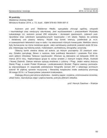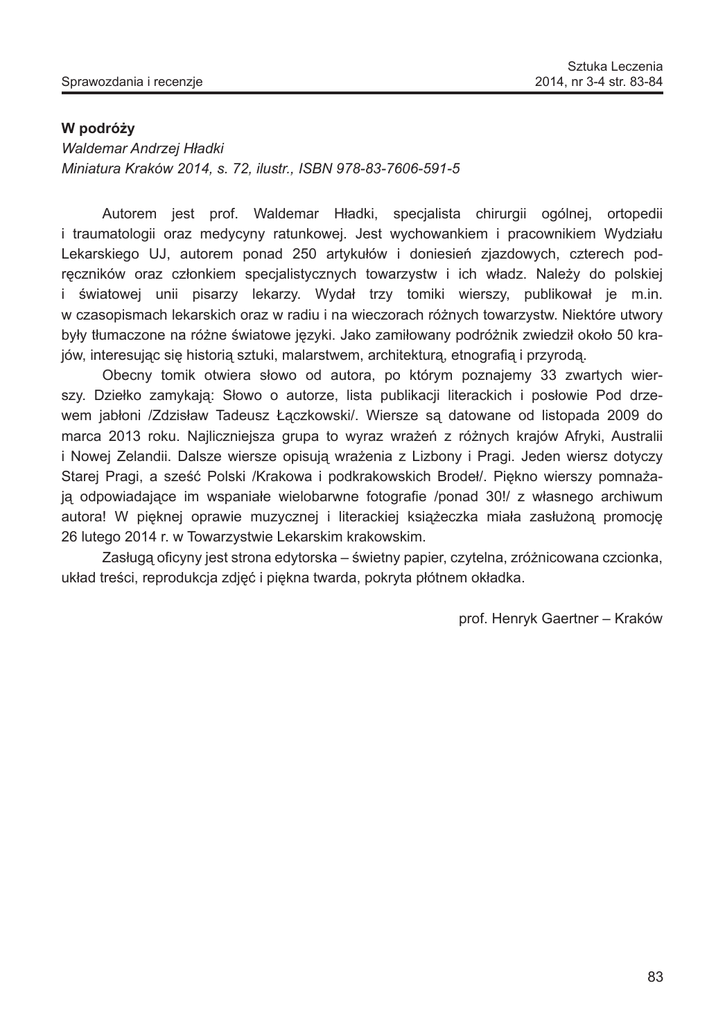 Sztuka Leczenia 2014, nr 3-4 str. 83-84 Sprawozdania i recenzje W podróży Waldemar Andrzej Hładki Miniatura Kraków 2014, s. 72, ilustr., ISBN 978-83-7606-591-5 Autorem jest prof. Waldemar Hładki, specjalista chirurgii ogólnej, ortopedii i traumatologii oraz medycyny ratunkowej. Jest wychowankiem i pracownikiem Wydziału Lekarskiego UJ, autorem ponad 250 artykułów i doniesień zjazdowych, czterech podręczników oraz członkiem specjalistycznych towarzystw i ich władz. Należy do polskiej i światowej unii pisarzy lekarzy. Wydał trzy tomiki wierszy, publikował je m.in. w czasopismach lekarskich oraz w radiu i na wieczorach różnych towarzystw. Niektóre utwory były tłumaczone na różne światowe języki. Jako zamiłowany podróżnik zwiedził około 50 krajów, interesując się historią sztuki, malarstwem, architekturą, etnografią i przyrodą. Obecny tomik otwiera słowo od autora, po którym poznajemy 33 zwartych wierszy. Dziełko zamykają: Słowo o autorze, lista publikacji literackich i posłowie Pod drzewem jabłoni /Zdzisław Tadeusz Łączkowski/. Wiersze są datowane od listopada 2009 do marca 2013 roku. Najliczniejsza grupa to wyraz wrażeń z różnych krajów Afryki, Australii i Nowej Zelandii. Dalsze wiersze opisują wrażenia z Lizbony i Pragi. Jeden wiersz dotyczy Starej Pragi, a sześć Polski /Krakowa i podkrakowskich Brodeł/. Piękno wierszy pomnażają odpowiadające im wspaniałe wielobarwne fotografie /ponad 30!/ z własnego archiwum autora! W pięknej oprawie muzycznej i literackiej książeczka miała zasłużoną promocję 26 lutego 2014 r. w Towarzystwie Lekarskim krakowskim. Zasługą oficyny jest strona edytorska – świetny papier, czytelna, zróżnicowana czcionka, układ treści, reprodukcja zdjęć i piękna twarda, pokryta płótnem okładka. prof. Henryk Gaertner – Kraków 83