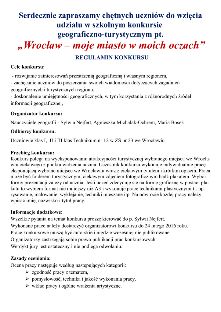Serdecznie zapraszamy chętnych uczniów do wzięcia udziału w szkolnym konkursie geograficzno-turystycznym pt. „Wrocław – moje miasto w moich oczach” REGULAMIN KONKURSU Cele konkursu: - rozwijanie zainteresowań przestrzenią geograficzną i własnym regionem, - zachęcanie uczniów do poszerzania swoich wiadomości dotyczących zagadnień geograficznych i turystycznych regionu, - doskonalenie umiejętności geograficznych, w tym korzystania z różnorodnych źródeł informacji geograficznej, Organizator konkursu: Nauczyciele geografii - Sylwia Nejfert, Agnieszka Michalak-Ochrem, Maria Bosek Odbiorcy konkursu: Uczniowie klas I, II i III klas Technikum nr 12 w ZS nr 23 we Wrocławiu Przebieg konkursu: Konkurs polega na wyeksponowaniu atrakcyjności turystycznej wybranego miejsca we Wrocławiu ciekawego z punktu widzenia ucznia. Uczestnik konkursu wykonuje indywidualnie pracę eksponującą wybrane miejsce we Wrocławiu wraz z ciekawym tytułem i krótkim opisem. Praca może być folderem turystycznym, ciekawym zdjęciem fotograficznym bądź plakatem. Wybór formy prezentacji zależy od ucznia. Jeśli uczeń zdecyduję się na formę graficzną w postaci plakatu to wybiera format nie mniejszy niż A3 i wykonuje pracę technikami plastycznymi tj. np. rysowanie, malowanie, wyklejanie, techniki mieszane itp. Na odwrocie każdej pracy należy wpisać imię, nazwisko i tytuł pracy. Informacje dodatkowe: Wszelkie pytania na temat konkursu proszę kierować do p. Sylwii Nejfert. Wykonane prace należy dostarczyć organizatorowi konkursu do 24 lutego 2016 roku. Prace konkursowe muszą być autorskie i nigdzie wcześniej nie publikowane. Organizatorzy zastrzegają sobie prawo publikacji prac konkursowych. Werdykt jury jest ostateczny i nie podlega odwołaniu. Zasady oceniania: Ocena pracy następuje według następujących kategorii: zgodność pracy z tematem, pomysłowość, technika i jakość wykonania pracy, wkład pracy i ogólne wrażenia artystyczne.