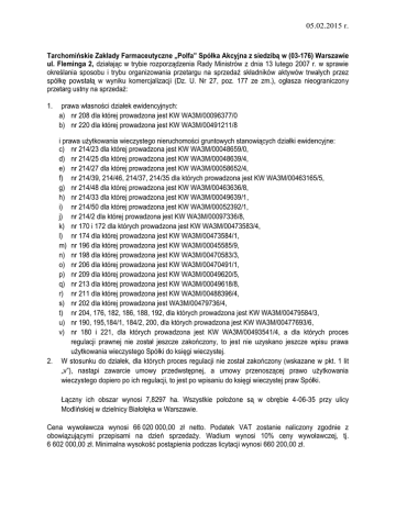 05.02.2015 r. Tarchomińskie Zakłady Farmaceutyczne „Polfa” Spółka Akcyjna z siedzibą w (03-176) Warszawie ul. Fleminga 2, działając w trybie rozporządzenia Rady Ministrów z dnia 13 lutego 2007 r. w sprawie określania sposobu i trybu organizowania przetargu na sprzedaż składników aktywów trwałych przez spółkę powstałą w wyniku komercjalizacji (Dz. U. Nr 27, poz. 177 ze zm.), ogłasza nieograniczony przetarg ustny na sprzedaż: 1. prawa własności działek ewidencyjnych: a) nr 208 dla której prowadzona jest KW WA3M/00096377/0 b) nr 220 dla której prowadzona jest KW WA3M/00491211/8 i prawa użytkowania wieczystego nieruchomości gruntowych stanowiących działki ewidencyjne: c) nr 214/23 dla której prowadzona jest KW WA3M/00048659/0, d) nr 214/25 dla której prowadzona jest KW WA3M/00048639/4, e) nr 214/27 dla której prowadzona jest KW WA3M/00058652/4, f) nr 214/39, 214/46, 214/37, 214/35 dla których prowadzona jest KW WA3M/00463165/5, g) nr 214/48 dla której prowadzona jest KW WA3M/00463636/8, h) nr 214/33 dla której prowadzona jest KW WA3M/00049639/1, i) nr 214/50 dla której prowadzona jest KW WA3M/00052392/1, j) nr 214/2 dla której prowadzona jest KW WA3M/00097336/8, k) nr 170 i 172 dla których prowadzona jest KW WA3M/00473583/4, l) nr 174 dla której prowadzona jest KW WA3M/00473584/1, m) nr 196 dla której prowadzona jest KW WA3M/00045585/9, n) nr 198 dla której prowadzona jest KW WA3M/00470583/3, o) nr 206 dla której prowadzona jest KW WA3M/00470491/1, p) nr 209 dla której prowadzona jest KW WA3M/00049620/5, q) nr 213 dla której prowadzona jest KW WA3M/00049618/8, r) nr 211 dla której prowadzona jest KW WA3M/00488396/4, s) nr 202 dla której prowadzona jest WA3M/00479736/4, t) nr 204, 176, 182, 186, 188, 192, dla których prowadzona jest KW WA3M/00479584/3, u) nr 190, 195,184/1, 184/2, 200, dla których prowadzona jest KW WA3M/00477693/6, v) nr 180 i 221, dla których prowadzona jest KW WA3M/00493541/4, a dla których proces regulacji prawnej nie został jeszcze zakończony, to jest nie uzyskano jeszcze wpisu prawa użytkowania wieczystego Spółki do księgi wieczystej. 2. W stosunku do działek, dla których proces regulacji nie został zakończony (wskazane w pkt. 1 lit „v”), nastąpi zawarcie umowy przedwstępnej, a umowy przenoszącej prawo użytkowania wieczystego dopiero po ich regulacji, to jest po wpisaniu do księgi wieczystej praw Spółki. Łączny ich obszar wynosi 7,8297 ha. Wszystkie położone są w obrębie 4-06-35 przy ulicy Modlińskiej w dzielnicy Białołęka w Warszawie. Cena wywoławcza wynosi 66 020 000,00 zł netto. Podatek VAT zostanie naliczony zgodnie z obowiązującymi przepisami na dzień sprzedaży. Wadium wynosi 10% ceny wywoławczej, tj. 6 602 000,00 zł. Minimalna wysokość postąpienia podczas licytacji wynosi 660 200,00 zł. 05.02.2015 r. Licytacja odbędzie się dnia 04 marca 2015 r. o godz. 12 w Warszawie przy ulicy A. Fleminga 2, w budynku Marketingu. Warunkiem przystąpienia do ww. przetargu jest wniesienie wadium na rachunek bankowy o numerze 03 1540 1157 2115 9152 0238 0001 w banku Bank Ochrony Środowiska S.A. z dopiskiem: „Przetarg – nieruchomość Modlińska„ do dnia 03 marca 2015 roku do godziny 12.00. Za datę wniesienia wadium uważa się dzień i godzinę wpływu kwoty wadium na wyżej wskazany rachunek. Wadium nie podlega oprocentowaniu. W celu przystąpienia do licytacji oferent zobowiązany jest do przedłożenia Komisji Przetargowej oryginału dowodu wpłaty wadium oraz podpisanego oświadczenia o zapoznaniu się ze stanem faktycznym i prawnym przedmiotu licytacji oraz warunkami licytacji jak również oświadczenia, iż nie wnosi on żadnych zastrzeżeń, co do warunków licytacji. Osoby prawne i podmioty gospodarcze biorące udział w licytacji powinny przedłożyć: aktualny wypis z rejestru przedsiębiorstw lub ewidencji podmiotów gospodarczych, zaświadczenie o numerze REGON i decyzję o nadaniu numeru NIP, oryginał pełnomocnictwa do reprezentowania uczestnika przetargu oraz inne dokumenty potwierdzające tożsamość osoby. Osoba fizyczna zobowiązana jest posiadać dokumenty potwierdzające swoją tożsamość, a osoba będąca w związku małżeńskim obowiązana jest wskazać czy występuje w imieniu własnym, czy też zamierza nabyć przedmiot przetargu w imieniu swoim i małżonka na majątek wspólny i wówczas obowiązana jest przedstawić na piśmie w oryginale poświadczoną notarialnie zgodę drugiego małżonka na zakup nieruchomości bądź umowę o rozdzielności majątkowej. Dodatkowo każdy oferent powinien przedłożyć oświadczenie, iż w stosunku do niego nie zachodzą przesłanki określone w § 6 Rozporządzenia Rady Ministrów z 13 lutego 2007 roku w sprawie określenia sposobu i trybu organizowania przetargu na sprzedaż składników aktywów trwałych przez spółkę, powstałą w wyniku komercjalizacji (Dz. U. z 2007 r., Nr 27, poz. 177 ze zm.). Wskazane powyżej dokumenty należy składać osobiście pod adresem Polfa Tarchomin S.A. ul. Fleminga 2, 03-176 Warszawa w pokoju nr 18 (Kancelaria) najpóźniej do dnia 3 marca 2015 roku do godziny 12.00 z adnotacją na kopercie: „Przetarg – nieruchomość Modlińska„. Wzory oświadczeń na żądanie udostępniane będą drogą elektroniczną przez osobę wskazaną do kontaktów w niniejszym ogłoszeniu. Cudzoziemcy mogą nabyć nieruchomość w wyniku niniejszego przetargu po spełnieniu warunków określonych w ustawie z dnia 24 marca 1920 r. o nabywaniu nieruchomości przez cudzoziemców (Dz. U. z 2004 roku Nr 167, poz. 1758 ze zm.). Stawienie się jednego uczestnika licytacji wystarcza do odbycia się licytacji. Sprzedaż nastąpi na rzecz uczestnika licytacji, który zaoferuje najwyższą cenę. Nabywca będzie zobowiązany do zapłaty ceny nabycia najpóźniej na dzień przed podpisaniem umowy w formie aktu notarialnego. O terminie podpisania aktu notarialnego nabywcy zostaną powiadomieni pise