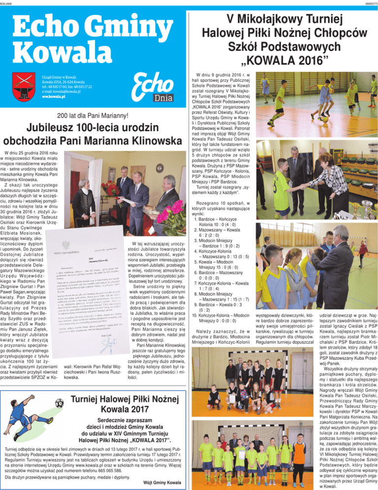 REKLAMA006955773 V Mikołajkowy Turniej Halowej Piłki Nożnej Chłopców Szkół Podstawowych „KOWALA 2016” 200 lat dla Pani Marianny! Jubileusz 100-lecia urodzin obchodziła Pani Marianna Klinowska W dniu 25 grudnia 2016 roku w miejscowości Kowala miało miejsce niecodzienne wydarzenie - setne urodziny obchodziła mieszkanka gminy Kowala Pani Marianna Klinowska. Z okazji tak uroczystego Jubileuszu najlepsze życzenia dalszych długich lat w szczęściu, zdrowiu i wszelkiej pomyślności na kolejne lata w dniu 30 grudnia 2016 r. złożyli Jubilatce: Wójt Gminy Tadeusz Osiński oraz Kierownik Urzędu Stanu Cywilnego Elżbieta Mosionek, wręczając kwiaty, okolicznościowy dyplom i upominek. Do życzeń D o s toj n ej J u b i l a tc e dołączyli się również przedstawiciele Delegatury Mazowieckiego Ur zędu Wojewódzkiego w Radomiu Pan Zbigniew Gurtat i Pan Paweł Sagan,wręczając kwiaty. Pan Zbigniew Gurtat odczytał list grat u l a c y j n y o d P r e ze s Rady Ministrów Pani Beaty Szydło oraz przedstawiciel ZUS w Radomiu Pan Janusz Ziętek, który wręczył Jubilatce kwiaty wraz z decyzją o przyznaniu specjalnego dodatku emerytalnego przysługującego z tytułu ukończenia 100 lat życia. Z najlepszymi życzeniami oraz kwiatami przybyli również przedstawiciele SPZOZ w Ko- wali: Kierownik Pan Rafał Wojciechowski i Pani Iwona Ruszkowska. W tej wzruszającej uroczystości Jubilatce towarzyszyła rodzina. Uroczystość, wypełniona szeregiem interesujących wspomnień Jubilatki, przebiegła w miłej, rodzinnej atmosferze. Dopełnieniem uroczystości jubileuszowej był tort urodzinowy. Setne urodziny to piękny wiek wypełniony codziennymi radościami i troskami, ale także pracą i poświęceniem dla dobra bliskich. Jak stwierdziła Jubilatka, to właśnie praca i pogodne usposobienie jest receptą na długowieczność. Pani Marianna cieszy się dobrym zdrowiem, nadal jest w dobrej kondycji. Pani Mariannie Klinowskiej jeszcze raz gratulujemy tego pięknego Jubileuszu, jednocześnie życzymy dużo zdrowia, by każdy kolejny dzień był radosny, pełen życzliwości i miłości. Turniej Halowej Piłki Nożnej Kowala 2017 Serdecznie zapraszam dzieci i młodzież Gminy Kowala do udziału w XIV Gminnym Turnieju Halowej Piłki Nożnej „KOWALA 2017”. Turniej odbędzie się w okresie ferii zimowych w dniach od 13 lutego 2017 r. w hali sportowej Publicznej Szkoły Podstawowej w Kowali. Przewidywany termin zakończenia turnieju 17 lutego 2017 r. Regulamin Turnieju wywieszony jest na tablicach ogłoszeń w budynku Urzędu i umieszczony na stronie internetowej Urzędu Gminy www.kowala.pl oraz w szkołach na terenie Gminy. Więcej szczegółów można uzyskać pod numerem telefonu 665 065 586. Dla drużyn przewidywane są pamiątkowe puchary, medale i dyplomy. Wójt Gminy Kowala W dniu 9 grudnia 2016 r. w hali sportowej przy Publicznej Szkole Podstawowej w Kowali został rozegrany V Mikołajkowy Turniej Halowej Piłki Nożnej Chłopców Szkół Podstawowych „KOWALA 2016” zorganizowany przez Referat Oświaty, Kultury i Sportu Urzędu Gminy w Kowali i Dyrektora Publicznej Szkoły Podstawowej w Kowali. Patronat nad imprezą objął Wójt Gminy Kowala Pan Tadeusz Osiński, który był także fundatorem nagród. W turnieju udział wzięło 5 drużyn chłopców ze szkół podstawowych z terenu Gminy Kowala. Drużyna z PSP Mazowszany, PSP Kończyce - Kolonia, PSP Kowala, PSP Młodocin Mniejszy i PSP Bardzice. Turniej został rozegrany „systemem każdy z każdym”. Rozegrano 10 spotkań, w których uzyskano następujące wyniki: 1. Bardzice – Kończyce Kolonia 10 : 0 (4 : 0) 2. Mazowszany – Kowala 6 : 2 (2 : 0) 3. Młodocin Mniejszy – Bardzice 1 : 9 (0 : 2) 4. Kończyce-Kolonia – Mazowszany 0 : 13 (0 : 5) 5. Kowala – Młodocin Mniejszy 15 : 0 (6 : 0) 6. Bardzice – Mazowszany 0 : 0 (0 : 0) 7. Kończyce-Kolonia – Kowala 1 : 7 (0 : 4) 8. Młodocin Mniejszy – Mazowszany 1 : 15 (1 : 7) 9. Bardzice – Kowala 0 : 3 (0 : 2) 10. Kończyce-Kolonia – Młodocin Mniejszy 0 : 0 (0 : 0) Należy zaznaczyć, że w drużynie z Bardzic, Młodocina Mniejszego i Kończyc-Kolonii występowały dziewczynki, które bardzo dobrze zaprezentowały swoje umiejętności piłkarskie, rywalizując w turnieju organizowanym dla chłopców. Regulamin turnieju dopuszczał udział dziewcząt w grze. Najlepszym zawodnikiem turnieju został Ignacy Cieślak z PSP Kowala, najlepszym bramkarzem turnieju został Piotr Michalski z PSP Bardzice. Królem strzelców, który zdobył 18 goli, został zawodnik drużyny z PSP Mazowszany Kuba Przedwój-Panek. Wszystkie drużyny otrzymały pamiątkowe puchary, dyplomy i statuetki dla najlepszego bramkarza i króla strzelców. Nagrody wręczali Wójt Gminy Kowala Pan Tadeusz Osiński, Przewodniczący Rady Gminy Kowala Pan Tadeusz Marczykowski i dyrektor PSP w Kowali Pani Małgorzata Konieczna. Na zakończenie turnieju Pan Wójt złożył wszystkim drużynom gratulacje za zdobyte osiągnięcia podczas turnieju i ambitną walkę, zapowiadając jednocześnie, że za rok odbędzie się kolejny VI Mikołajkowy Turniej Halowej Piłki Nożnej Chłopców Szkół Podstawowych, który będzie odbywał się cyklicznie wpisany w plan imprez sportowych organizowanych przez Urząd Gminy w Kowali. REKLAMA006955773 II Międzygimnazjalny Konkurs Piosenki Świątecznej w Języku Angielskim pod patronatem Wójta Gminy Jastrząb p. Andrzeja Brachy Uczniowie gimnazjum w Parznicach wzięli udział w II Międzygimnazjalnym Konkursie Piosenki Świątecznej w Języku Angielskim pod patronatem Wójta Gminy Jastrząb p. Andrzeja Brachy. Rywalizacja odbyła się w czwartek 12 stycznia na scenie Publicznego Gimnazjum w Jastrzębiu. Pojawili się na niej wykonawcy z sześciu gimnazjów z powiatu szydłowieckiego i radomskiego: PG w Chlewiskach, PG w Mirowie, PG w Rudzie Wielkiej, PG nr 1 w Szydłowcu, reprezentacja gospodarzy oraz nasza ekipa - PG w Parznicach. Uczniowie występowali w dwóch kat