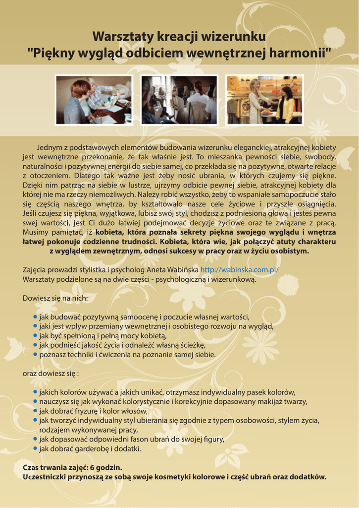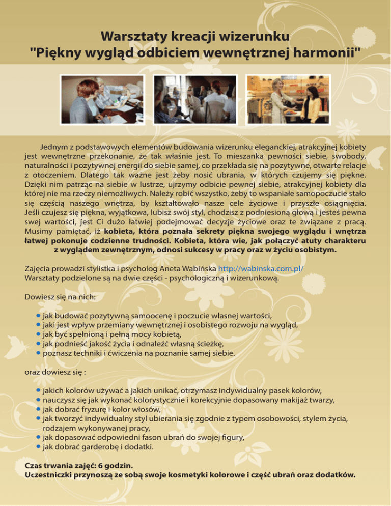 Warsztaty kreacji wizerunku ''Piękny wygląd odbiciem wewnętrznej harmonii'' Jednym z podstawowych elementów budowania wizerunku eleganckiej, atrakcyjnej kobiety jest wewnętrzne przekonanie, że tak właśnie jest. To mieszanka pewności siebie, swobody, naturalności i pozytywnej energii do siebie samej, co przekłada się na pozytywne, otwarte relacje z otoczeniem. Dlatego tak ważne jest żeby nosić ubrania, w których czujemy się piękne. Dzięki nim patrząc na siebie w lustrze, ujrzymy odbicie pewnej siebie, atrakcyjnej kobiety dla której nie ma rzeczy niemożliwych. Należy robić wszystko, żeby to wspaniałe samopoczucie stało się częścią naszego wnętrza, by kształtowało nasze cele życiowe i przyszłe osiągnięcia. Jeśli czujesz się piękna, wyjątkowa, lubisz swój styl, chodzisz z podniesioną głową i jesteś pewna swej wartości, jest Ci dużo łatwiej podejmować decyzje życiowe oraz te związane z pracą. Musimy pamiętać, iż kobieta, która poznała sekrety piękna swojego wyglądu i wnętrza łatwej pokonuje codzienne trudności. Kobieta, która wie, jak połączyć atuty charakteru z wyglądem zewnętrznym, odnosi sukcesy w pracy oraz w życiu osobistym. Zajęcia prowadzi stylistka i psycholog Aneta Wabińska http://wabinska.com.pl/ Warsztaty podzielone są na dwie części - psychologiczną i wizerunkową. Dowiesz się na nich: jak budować pozytywną samoocenę i poczucie własnej wartości, jaki jest wpływ przemiany wewnętrznej i osobistego rozwoju na wygląd, jak być spełnioną i pełną mocy kobietą, jak podnieść jakość życia i odnaleźć własną ścieżkę, poznasz techniki i ćwiczenia na poznanie samej siebie. oraz dowiesz się : jakich kolorów używać a jakich unikać, otrzymasz indywidualny pasek kolorów, nauczysz się jak wykonać kolorystycznie i korekcyjnie dopasowany makijaż twarzy, jak dobrać fryzurę i kolor włosów, jak tworzyć indywidualny styl ubierania się zgodnie z typem osobowości, stylem życia, rodzajem wykonywanej pracy, jak dopasować odpowiedni fason ubrań do swojej figury, jak dobrać garderobę i dodatki. Czas trwania zajęć: 6 godzin. Uczestniczki przynoszą ze sobą swoje kosmetyki kolorowe i część ubrań oraz dodatków.