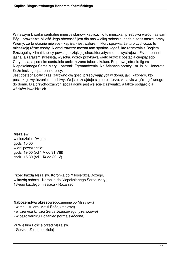 Kaplica Błogosławionego Honorata Koźmińskiego W naszym Dworku centralne miejsce stanowi kaplica. To tu mieszka i przebywa wśród nas sam Bóg - prawdziwa Miłość.Jego obecność jest dla nas wielką radością, nadaje sens naszej pracy. Wiemy, że to właśnie miejsce - kaplica - jest walorem, który sprawia, że tu przychodzą, tu mieszkają różne osoby. Niemal zawsze można tam spotkać kogoś, kto rozmawia z Bogiem. Szczególny klimat kaplicy powstaje dzięki jej charakterystycznemu wystrojowi. Przestronna i jasna, a zarazem strzelista, wysoka. Wzrok przykuwa wielki krzyż z postacią cierpiącego Chrystusa, a pod nim centralnie umieszczone tabernakulum. Po prawej stronie figura Niepokalanego Serca Maryi - patronki Zgromadzenia. Na ścianach obrazy - m. in. bł. Honorata Koźmińskiego, patrona kaplicy. Jest dostępna cały czas, zarówno dla gości przebywających w domu, jak i każdego, kto poszukuje wyciszenia i modlitwy. Wejście znajduje się na parterze, vis a vis wejścia głównego do domu. Dla przychodzących spoza domu jest wejście z zewnątrz, a także podjazd dla wózków inwalidzkich. Msza św. w niedziele i święta: godz. 10.00 w dni powszednie: godz. 19.00 (od 1 V do 31 VIII) godz. 16.30 (od 1 IX do 30 IV) Przed każdą Mszą św. Koronka do Miłosierdzia Bożego, w każdą sobotę - Koronka do Niepokalanego Serca Maryi, 13-ego każdego miesiąca - Różaniec Nabożeństwa okresowe(codziennie po Mszy św.) - w maju ku czci Matki Bożej (majowe) - w czerwcu ku czci Serca Jezusowego (czerwcowe) - w październiku Różaniec (forma skrócona) W Wielkim Poście przed Mszą św. - Gorzkie Zale (niedziela) 1/2 Kaplica Błogosławionego Honorata Koźmińskiego - Droga Krzyżowa (piątek) 2/2