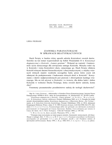 ROCZNIKI NAUK PRAWNYCH Tom XVI, numer 2 − 2006 LIDIA FIEJDASZ ZJAWISKA PARANATURALNE W SPRAWACH BEATYFIKACYJNYCH Duch Świe˛ty w bardzo różny sposób udziela Kościołowi swoich darów. Szeroko na ten temat wypowiedział sie˛ Sobór Watykański II w Konstytucji dogmatycznej o Kościele „Lumen gentium”. Wskazał na wartość i konieczność życia mistycznego dla uświe˛cenia samego Kościoła. Mistyka rodzi sie˛ w Kościele i temu Kościołowi służy, umacniajac ˛ go. Duch Świe˛ty obdarza Kościół różnymi darami hierarchicznymi i charyzmatycznymi, a mie˛dzy wiernych różnych stanów rozdziela szczególne łaski, przez które czyni ich zdatnymi do podejmowania i budowania różnych dzieł w Kościele1. Korzystanie z darów nadprzyrodzonych jest prawem i obowiazkiem ˛ każdego wierzacego. ˛ Ma on ich używać w Kościele i w świecie, dla dobra ludzi i dobra Kościoła w wolności Ducha Świe˛tego, który swoich darów udziela, komu chce2. Fenomeny pozanaturalne przedmiotowo należa˛ do teologii duchowości3. Mgr lic. LIDIA FIEJDASZ – doktorantka w Katedrze Prawa Kanonizacyjnego, Instytut Prawa Kanonicznego WPPKiA KUL; adres do korespondencji: Al. Racławickie 14, 20-950 Lublin. 1 Konstytucja dogmatyczna o Kościele „Lumen gentium”, w: S o b ó r W a t y k a ń s k i II, Konstytucje, dekrety, deklaracje, Poznań: Pallottinum 2002, nr 4, 12. Ponadto do źródeł mistyki chrześcijańskiej należa: ˛ Konstytucja dogmatyczna o Objawieniu Bożym „Dei Verbum”, tamże, nr 8; Katechizm Kościoła Katolickiego, Poznań: Pallottinum 1994, nr 2014; dokument Kongregacji Doktryny Wiary z dnia 15 X 1989 Orationis formans AAS 82(1990) 362-379. Zob. także J. C. C a s t e l l a n o, Fenomenologia della vita spirituale con riferimento ai fenomeni preternaturali, in Congregatio de Causus Sanctorum. Studium. Corso formativo per istruire le Cause dei Santi, vol. I: Parte Teologica, Città del Vaticano 2004, p. 149-182. 2 J. B o c h e n e k, Zarys ascetyki, Warszawa 1972, s. 518. 3 Pomijam tutaj rozważania na temat poje˛cia mistyki, fenomenów mistycznych, ich klasyfikacji w teologii. Zob.: V. M a c c a, M. C a p r i o l i, Fenomeni straordinari, in Dizionario enciclopedico di spiritualità/ 1-3 a cura di Ermanno Ancilli e del Pontificio Istituto di Spiritualità delTeresianum, Roma 1995, t. II, p. 1002-1011; J. L o p ó z - G a y, Le phéno- 288 LIDIA FIEJDASZ Prawo kanonizacyjne zajmuje sie˛ nimi z uwagi na fakt, iż cze˛sto towarzysza˛ postaciom wielkiego formatu – kandydatom na ołtarze – a autentyczność tych zjawisk i nadprzyrodzone pochodzenie badane jest w procesie beatyfikacyjnym4. mène mystique, in Dictionnaire de Spiritualité ascétique et mystique doctrine et histoire fondé par M. Viller, F. Cavallera, J. De Guibert S.J. i inni, t. X, Mabille-Mythe, Paris 1980, kol. 1893-1902; R. C o p s e y, Mistica (cenni storici), in: Dizionario di mistica a cura di L. Boriello, E. Caruana, M. R. Del Genio, N. Suffi, Città del Vaticano 1998, p. 824-836; K. R a h n e r, K. H. V o r g r i n e r, Mistyka, w: Mały słownik teologiczny, Warszawa 1987, kol. 240–241; J. W. G o g o l a, Czym jest mistyka chrześcijańska? w: Przesłanie Ojca Pio z Pietrelciny dla ludzi naszych czasów. Materiały z sympozjum 26-27 października 1998 roku, red. A. Horowski, Kraków 1999, s. 33-45; t e n ż e, Zjawiska towarzyszace ˛ mistyce: ekstaza i stygmaty, w: Stygmaty i stygmatycy, red. E. Dmowski, Z. J. Kijas, Kraków: Instytut Studiów Franciszkańskich 2005, s. 45-60; M. C h m i e l e w s k i, 101 pytań o życie duchowe, Lublin 1999; A. S a n t o r s k i, Łaska, w: Leksykon Duchowości Katolickiej, red. M. Chmielewski, Lublin–Kraków 2002, s. 471-473; W. Z y z a k, Zjawiska nadzwyczajne, tamże, s. 945-948. Poszczególne kwestie dotyczace ˛ mistyki omawiaja˛ m.in.: L. B o u y e r, Wprowadzenie do życia duchowego. Zarys teologii ascetycznej i mistycznej, Warszawa 1982; S. N o w a k, Mistyka inkarnacyjna Wcielonego Słowa, w: Mistyka droga˛ zjednoczenia z Bogiem, red. M. Szymuła, Warszawa 1999, s. 34-43; W. S ł o m k a, Mistyczne doświadczenie naturalne?, w: Mistyka w życiu człowieka, red. W. Słomka, Lublin 1980, s. 9-27; t e n ż e, Teologiczna koncepcja życia mistycznego w chrześcijaństwie, tamże, s. 57-68; J. S u d b r a c k, Mistyka. Doświadczenie własnego ja – Doświadczenie kosmiczne – Doświadczenie Boga, Kraków 1996; M. S z y m u ł a, Życie mistyczne podstawa˛ duchowości zakonnej w świetle nauczania bł. Honorata Koźmińskiego, w: Mistyka droga˛ zjednoczenia z Bogiem, s. 90-99; S. U r b a ń s k i, Mistyka w polskiej tradycji, tamże, s. 44-89; S. Z a l e w s k i, Doświadczenie mistyczne a doskonałość człowieka według św. Jana od Krzyża, w: Najważniejsza jest miłość. Ksie˛ga Pamiatkowa ˛ ku czci Ksie˛dza Profesora Waleriana Słomki, red. M. Chmielewski, Lublin 1999, s. 177-185; J. W e i s m a y e r, Pełnia życia. Zarys historii i teologii chrześcijańskiej duchowości, Kraków 1993; W. Ś w i e r z a w s k i, Panie naucz nas sie˛ modlić. Mistyka zakorzeniona w liturgii, Kraków 1984; t e n ż e, Panie pokaż nam Ojca. Mistyka zakorzeniona w liturgii, Kraków 1987; J. M i s i u r e k, Wielkie mistyczki Kościoła, Lublin 19992, s. 11-12; S. U r b a ń s k i, Teologia życia mistycznego. Studium polskiej mistyki (1914-1939), Warszawa 1999; A. M a r c h e t t i, Zarys teologii życia duchowego, t. II, Kraków 1996; Z. O b e r t y ń s k i, Łaski nadzwyczajne w życiu mistycznym M. Marceliny Darowskiej, AK 52(1950), z. 5, s. 333-335; M. C h m i e l e w s k i, Kontemplacyjne przejawy doświadczenia mistycznego bł. Marceliny Darowskiej (1827-1911), w: Najważniejsza jest miłość, s. 187-204; R. G a r r i g o u - L a g r e n g e, Trzy okresy życia wewne˛trznego wste˛pem do życia w niebie, Niepokalanów 2001; J. M a c h n i a k, Słowa nadprzyrodzone, w: Leksykon Duchowości Katolickiej, s. 821-822; J. M. P o p ł a w