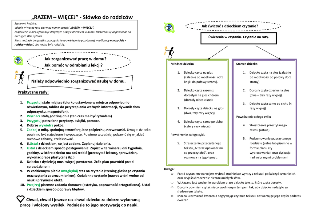 „RAZEM – WIĘCEJ” - Słówko do rodziców Szanowni Rodzice, oddaję w Wasze ręce pierwszy numer gazetki „RAZEM – WIĘCEJ”. Znajdziecie w niej informacje dotyczące pracy z dzieckiem w domu. Postaram się odpowiadać na nurtujące Was pytania. Mam nadzieję, że gazetka przyczyni się do zwiększenia pozytywnej współpracy nauczyciele rodzice – dzieci, aby nauka była radością. Jak zorganizować pracę w domu? Jak pomóc w odrabianiu lekcji? Jak ćwiczyć z dzieckiem czytanie? Ćwiczenia w czytaniu. Czytanie na raty. Młodsze dziecko 1. Dziecko czyta na głos (zależnie od możliwości od 1 linijki do połowy strony). 1. Dziecko czyta na głos (zależnie od możliwości od połowy do 1 strony). 2. Dziecko czyta razem z dorosłym na głos chórem (dorosły nieco ciszej) 2. Dorosły czyta dziecku na głos (dwa – trzy razy więcej). 3. Dziecko czyta samo po cichu (4 razy więcej) Należy odpowiednio zorganizować naukę w domu. Praktyczne rady: Przygotuj stałe miejsce (biurko ustawione w miejscu odpowiednio oświetlonym, tablica do przyczepiania ważnych informacji, dywanik dom odpoczynku, magnetofon). 2. Wyznacz stałą godzinę dnia (ten czas ma być rytuałem) 3. Przygotuj potrzebne przybory, książki, pomoce. 4. Dobrze wywietrz pokój. 5. Zadbaj o miłą, spokojną atmosferę, bez pośpiechu, nerwowości. Uwaga: dziecko powinno być najedzone i wypoczęte. Powinno wcześniej pobawić się w jakieś ruchowe zabawy, zrelaksować. 6. 6.Ustal z dzieckiem, co jest zadane. Zaplanuj działania. 7. Ustal z dzieckiem sposób postępowania: Zapisz w terminarzu dni tygodnia, godziny, w które dziecko ma coś zrobić (przeczytać lekturę, sprawdzian, wykonać prace plastyczną itp.) 8. Dziecko z dysleksją musi więcej powtarzać. Zrób plan powtórki przed sprawdzianem 9. W codziennym planie uwzględnij czas na czytanie (trening głośnego czytania oraz czytania ze zrozumieniem). Codzienne czytanie (nawet w dni wolne od nauki) przyniesie efekt. 10. Przejrzyj pisemne zadania domowe (estetyka, poprawność ortograficzna). Ustal z dzieckiem sposób poprawy błędów. 1. Chwal, chwal i jeszcze raz chwal dziecko za dobrze wykonaną pracę i włożony wysiłek. Podniesie to jego motywację do nauki. Starsze dziecko 3. Dorosły czyta dziecku na głos (dwa, trzy razy więcej). 4. Dziecko czyta samo po cichu (cztery razy więcej). Powtórzenie całego cyklu 4. Streszczenie przeczytanego tekstu (ustnie) 5. Podsumowanie przeczytanego rozdziału (ustne lub pisemne w formie planu czy wypracowania), oraz dyskusja nad wybranymi problemami Powtórzenie całego cyklu 5. Streszczenie przeczytanego tekstu „A teraz opowiedz mi, co przeczytałeś”, oraz rozmowa na jego temat. Uwaga: • • • • Przed czytaniem warto jest wybrać trudniejsze wyrazy z tekstu i poćwiczyć czytanie ich oraz wyjaśnić znaczenie niezrozumiałych słów. Wskazane jest wodzenie wzrokiem przez dziecko tekstu, który czyta dorosły. Dorosły powinien czytać nieco zwolnionym tempem tak, aby dziecko nadążyło za śledzeniem tekstu. Można urozmaicać ćwiczenia nagrywając czytanie tekstu i odtwarzając jego części podczas ćwiczeń . Jak ćwiczyć z dzieckiem ortografię? 1.Narysować swoje trudne słowo w swoim ulubionym kolorze. Jak zmotywować dziecko do systematycznej pracy Pomóż dziecku zaplanować zakres obowiązków. 2.Wyróżnić w dowolny sposób litery, które w danym słowie sprawiają mu kłopot, na przykład napisać je tak jakby były większe, jaśniejsze lub innego koloru niż pozostałe. Ustal sposób rozliczania się z ich wykonania (np. porę dnia) 3.Rozbić słowo na trzyliterowe grupy i rysować je po trzy litery. Pamiętaj o znanej zasadzie: 4.Przedstawić litery na znajomym tle: najpierw narysować znany przedmiot lub scenę, a na tym litery, które chce zapamiętać. a częste porażki zniechęcają każdego do podjęcia wysiłku. 5.Jeśli słowo jest długie, należy pisać je mniejszymi literami tak, żeby mieć przed oczyma cały wyraz. 6.Rysować litery palcem w powietrzu wyobrażać sobie te, które akurat pisze. DYKTANDO W 10 PUNKTACH Z KOMENTARZEM Omów zasady nagradzania lub karania za wykonanie obowiązków. Rozliczaj dziecko nie tylko za końcowy efekt, ale przede wszystkim za cząstkowe rozwiązania –umożliwisz tym dziecku osiągnięcie sukcesu. Uwaga: Warto oceniać punktami kolejne zadania, a końcowa ocena będzie zależała od zdobytej sumy punktów. Np. w domu rozliczamy dziecko za uporządkowanie poszczególnych elementów, wykonanie konkretnych podpunktów domowych obowiązków. Motywuj dziecko mówiąc: 1. Umów się z dzieckiem, że codziennie będziecie rozbić dyktando obejmujące trzy zdania. Wymyślcie wspólnie nagrodę po każdym tygodniu pracy. 2. Zaznacz w książce dziecka trzy zdania i przeczytaj na głos pierwsze zdanie. 3. Dziecko powtarza zdanie i omawia pisownię każdego wyrazu (podaje reguły pisowni). 4. Dziecko zapisuje zdanie (podobnie postępuje z pozostałymi zdaniami). 5. Dziecko samodzielnie sprawdza cały napisany tekst. 6. Dorosły sprawdza tekst. Jeżeli znajdzie błędy podaje ich liczbę. 7. Dziecko ponownie sprawdza tekst z pomocą słownika ortograficznego. 8. Dorosły sprawdza poprawiony tekst. Jeżeli nadal są błędy, wskazuje tekst – wzór, z którego dyktował zdania. 9. Dziecko porównuje napisany tekst ze wzorem i ostatecznie poprawia błędy. 10. Dziecko opracowuje błędnie napisane wyrazy (np. podaje reguły pisowni, wyrazy pokrewne, odmienia wyraz przez przypadki, wymienia na inne formy). „Wiem, że potrafisz.” „ Udowodnij mi, że potrafisz!” „Nie mogę się doczekać, kiedy zobaczę Twoją pracę. Wiem, że będzie dobra!” Stwarzaj okazje do zwiększenia chęci do nauki dziecka. np. Proponuj ciekawe zajęcia Stwarzaj okazję do odnoszenia sukcesów. Łagodź stres dziecka, buduj w dziecku poczucie własnej wartości. Ważne jest, aby nagrody były wcześniej uzgodnione z dzieckiem. Najbardziej wartościow