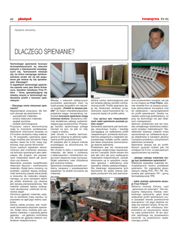 62 plastpol tworzywa P2 05 Zapytajmy specjalisty... DLACZEGO SPIENIANIE? FRIUL FILIERE Technologie spieniania tworzyw termoplastycznych sà obecnie jednymi z intensywniej rozwijajàcych si´. Tymczasem okazuje si´, ˝e mimo rosnàcego zainteresowania wcale nie sà tak popularne jak mo˝na by si´ spodziewaç. Dlaczego? O aspektach technologii spieniania opowie nam pan Dario Ermacora, dyrektor handlowy Friul Filiere – firmy specjalizujàcej si´ miedzy innymi w technologii wyt∏aczania profili z tworzyw spienianych. • Dlaczego warto stosowaç spienianie? Najwa˝niejsze przyczyny, dla których stosuje si´ spienianie to: - oszcz´dnoÊç materia∏u. - zmiany w∏asnoÊci materia∏u - wyglàd wyrobów - kwestie technologiczne. Przyczyny natury ekonomicznej majà tu znaczenie podstawowe. Spienianie chemiczne pozwala na 2-3 krotne obni˝enie masy materia∏u. W przypadku spieniania gazowego mo˝liwe jest obni˝enie masy wyrobu nawet do 3-4% masy wyjÊciowej, wi´c ponad 30-krotnie! Innym wa˝nym aspektem ekonomicznym jest mo˝liwoÊç stosowania tworzyw spienianych jako alternatywy dla drogich, ale popularnych materia∏ów takich jak aluminium czy drewno. Spienianie pozwala modyfikowaç w∏asnoÊci fizyczne i mechaniczne materia∏u. Dzi´ki temu mo˝emy, na przyk∏ad, uzyskaç lepszà izolacyjnoÊç termicznà (nawet dwukrotnie) w stosunku do materia∏u niespienionego, co przy wyrobach takich jak profile drzwiowe czy okienne jest sprawà pierwszoplanowà. Taki materia∏ posiada lepsza izolacyjnoÊç akustycznà i zdolnoÊç do t∏umienia drgaƒ. Obni˝ona g´stoÊç materia∏u wp∏ywa na obni˝enie masy wyrobu, co poprawia na ogó∏ jego walory u˝ytkowe. Istotnà zaletà procesu jest mo˝liwoÊç sterowania stopniem spienienia. Dzi´ki temu mo˝liwe jest uzyskanie materia∏u o szerokiej gamie g´stoÊci – od g´stoÊci minimalnej (ok. 30%) do g´stoÊci bliskich materia∏owi niespienionemu. 1 2 FRIUL FILIERE FRIUL FILIERE Mówiàc o walorach estetycznych produktów spienianych mam na myÊli przede wszystkim ich naturalny wyglàd. „Plastik to zawsze plastik” ze swym charakterystycznym po∏yskiem wagà i temperaturà, natomiast tworzywa spieniane mogà imitowaç drewno. S∏u˝à temu równie˝ dodatkowe zabiegi uszlachetniajàce jego powierzchnie. Przewaga wyrobu spienionego polega równie˝ na tym, ˝e jest on mi∏y i ciep∏y w dotyku. JeÊli chodzi o kwestie technologiczne to dotyczy to g∏ównie wyt∏aczania profili gruboÊciennych. W zasadzie jest to jedyna metoda pozwalajàca na ekonomiczne ich wytwarzanie. Nie chodzi tu tylko o oszcz´dnoÊç materia∏u, ale tak˝e o problemy z kalibrowaniem i ch∏odzeniem du˝ej iloÊci stopionej masy tworzywa. Dzi´ki spienianiu czas ch∏odzenia jest znacznie krótszy. Spienianie rozwiàzuje ponadto problemy zwiàzane z powstawaniem zapadni´ç na skutek kurczenia si´ materia∏u. Istotnà cechà technologicznà jest te˝ kwestia dalszej obróbki mechanicznej profili. Profile spieniane dajà si´ doskonale obrabiaç przez wiercenie, ci´cie frezowanie itp. i to znacznie lepiej ni˝ profile pe∏ne. FRIUL FILIERE 4 • Czy oprócz tylu niepodwa˝alnych zalet spienienie posiada jakieÊ wady? Generalnie spienianie jest technologià stosunkowo trudnà i bardziej wymagajàcà od wyt∏aczania profili niespienionych, poniewa˝ obok problemów zwiàzanych z nadaniem odpowiedniego kszta∏tu profilu wa˝ne jest tak˝e utrzymanie równomiernego stopnia spienienia. Problemem jest te˝ koniecznoÊç idealnego wzajemnego dopasowania linii i narz´dzi. Down stream linii jest taki sam jak przy wyt∏aczaniu materia∏ów niespienianych. Jednak stosowane sà tu specjalne narz´dzia (g∏owice i kalibratory) oraz specjalne uk∏ady uplastyczniajàce. Dla idealnego dopasowania tych elementów do siebie dobrze jest, je˝eli producent linii jest jednocze- 3 FRIUL FILIERE Ênie producentem narz´dzi, tak jak to ma miejsce we Friul Filiere. Jednak niewiele firm na Êwiecie produkuje jednoczeÊnie kompletne linie do wyt∏aczania i oprzyrzàdowanie do profili spienianych. Zwykle narz´dzia wykonujà poddostawcy, co przy tej technologii nie jest idealnym rozwiàzaniem. Istotnym problemem jest te˝ kwestia umiej´tnego dobierania w∏aÊciwych receptur materia∏owych. Niew∏aÊciwie dobrany materia∏ mo˝e spowodowaç np. odk∏adanie si´ jego sk∏adników w kana∏ach g∏owicy i powa˝ne problemy z utrzymaniem stabilnoÊci produkcji. Spienianie stosuje si´ do profili, których gruboÊç Êcianki jest nie mniejsza ni˝ 3 mm, co jest pewnym ograniczeniem tej metody. • Jakiego rodzaju materia∏y mogà byç poddawane spienianiu? W∏aÊciwie wszystkie materia∏y termoplastyczne mo˝na poddawaç spienianiu. Do najcz´Êciej stosowanych nale˝à PVC, PS i PE. NowoÊcià jest spienianie PP i gumy termoplastycznej TPE. • Jakie metody spieniania stosuje Friul Filiere? G∏ównie metod´ Celuka, czyli „spieniania do wewnàtrz”. Nie stosujemy klasycznej metody swobodnego spieniania, gdy˝ teraz wi´kszoÊç profili spienianych musi posiadaç twarde powierzchnie zewn´trzne i do tego idealnie nadaje si´ metoda Celuka. W tej metodzie profil jest ch∏odzony bezpoÊrednio po opuszczeniu dyszy na ca∏ej powierzchni. W ten sposób zapobiega si´ powstawaniu komórek na powierzchni wyt∏aczanego profilu. tworzywa P2 05 5 plastpol 6 7 FRIUL FILIERE FRIUL FILIERE FRIUL FILIERE Friul Filiere rozwin´∏a metod´ Celuka w kierunku otrzymywania nie tylko wysokiej twardoÊci powierzchni zewn´trznych profili, ale równie˝ i powierzchni wewn´trznych profili komorowych (Fot. 3,5 i 6), co pozwala na znaczne poprawienie ich w∏asnoÊci mechanicznych – przede wszystkim ich sztywnoÊci. Przyk∏adem na to sà p∏yty drzwiowe ze spienionego PVC (Fot. 6). Projekt kompletnych drzwi ze spienionego PVC zosta∏ opracowany po raz pierwszy w∏aÊnie przez Friul Filiere i cieszy si´ Êwiatowà s∏awà i uznaniem. cie, kompletnego systemu do produk