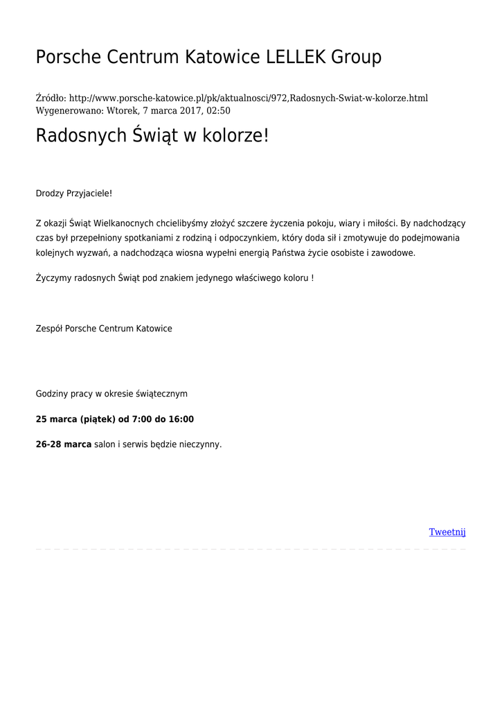 Porsche Centrum Katowice LELLEK Group Źródło: http://www.porsche-katowice.pl/pk/aktualnosci/972,Radosnych-Swiat-w-kolorze.html Wygenerowano: Wtorek, 7 marca 2017, 02:50 Radosnych Świąt w kolorze! Drodzy Przyjaciele! Z okazji Świąt Wielkanocnych chcielibyśmy złożyć szczere życzenia pokoju, wiary i miłości. By nadchodzący czas był przepełniony spotkaniami z rodziną i odpoczynkiem, który doda sił i zmotywuje do podejmowania kolejnych wyzwań, a nadchodząca wiosna wypełni energią Państwa życie osobiste i zawodowe. Życzymy radosnych Świąt pod znakiem jedynego właściwego koloru ! Zespół Porsche Centrum Katowice Godziny pracy w okresie świątecznym 25 marca (piątek) od 7:00 do 16:00 26-28 marca salon i serwis będzie nieczynny. Tweetnij